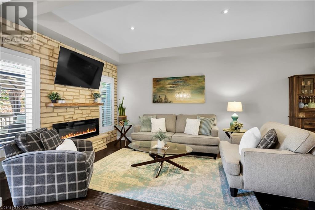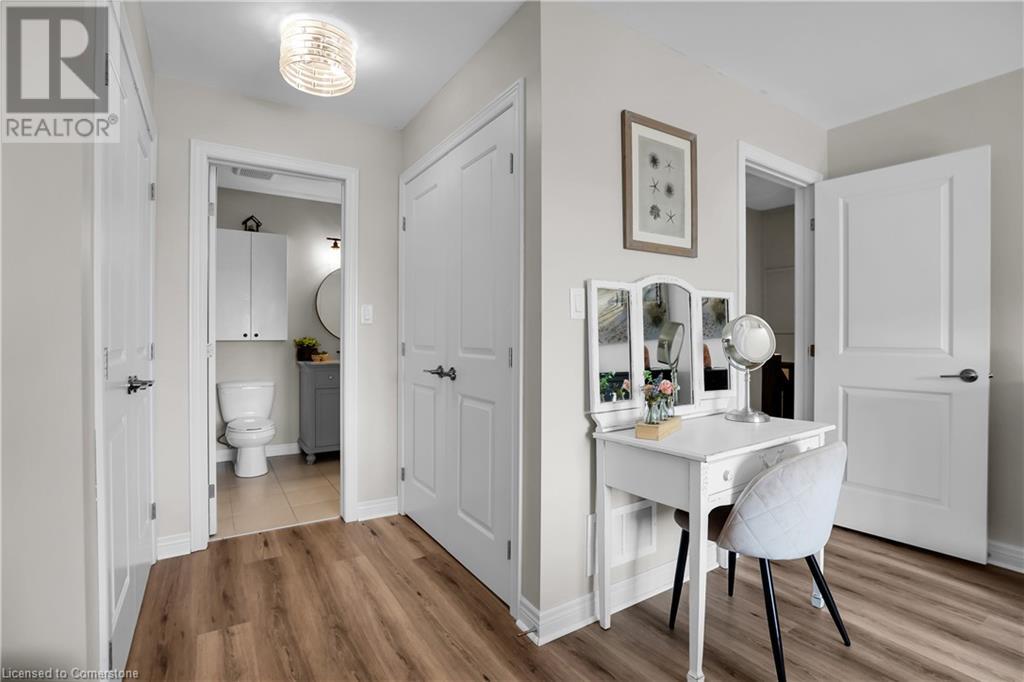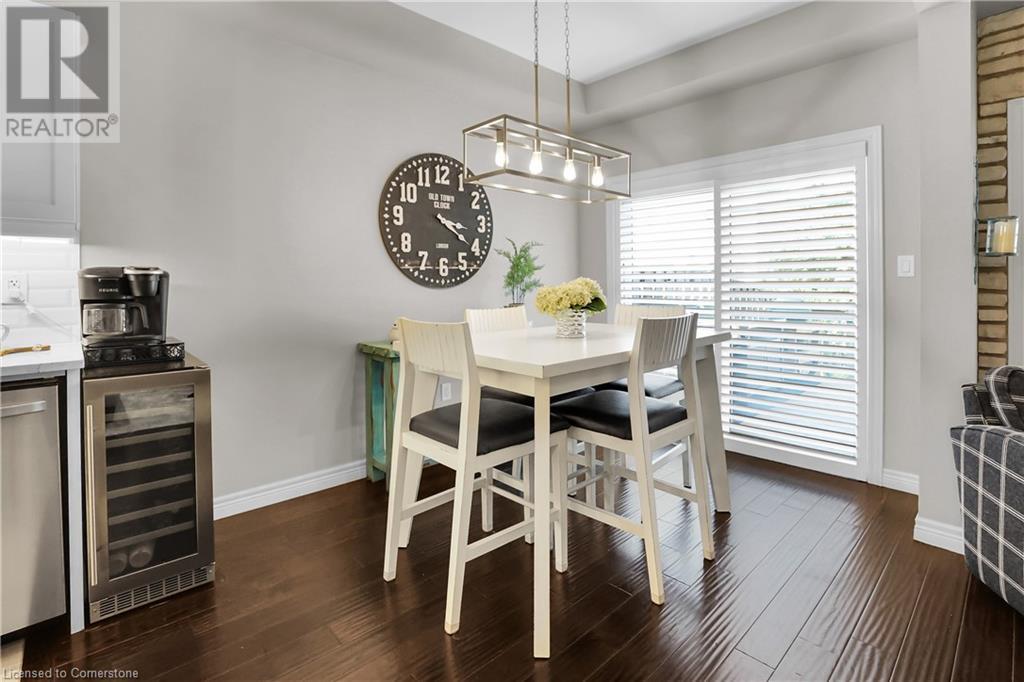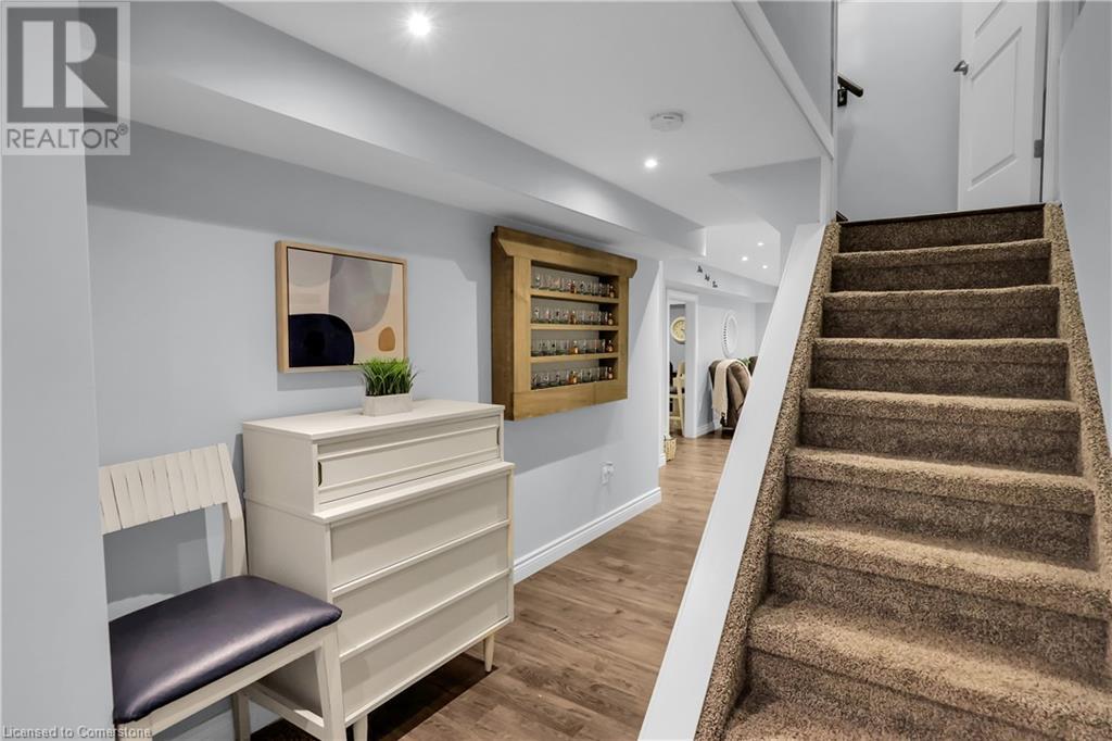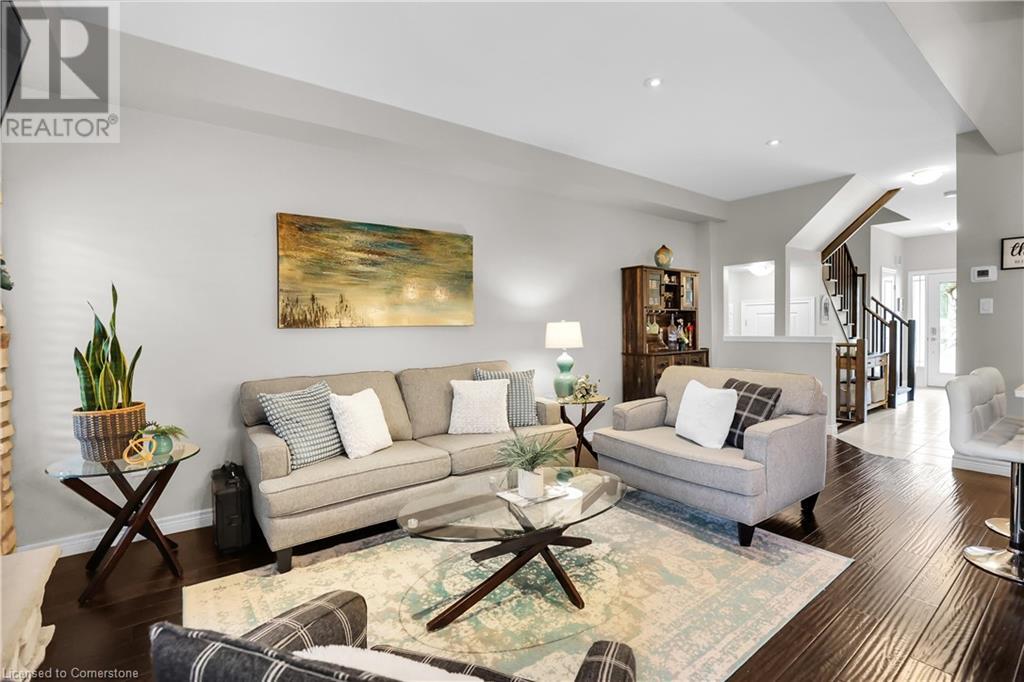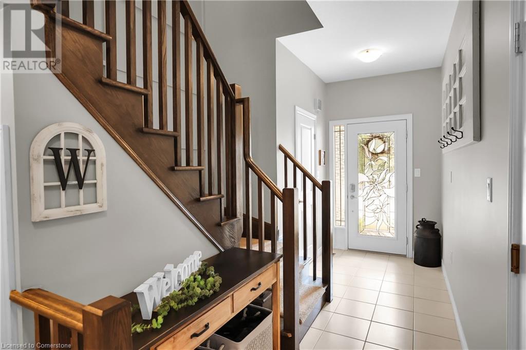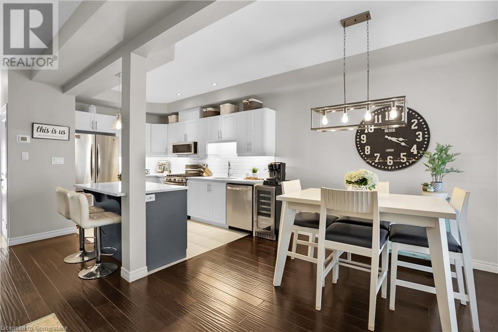 STUNNING FREEHOLD TOWNHOME ... Located in a trendy, family-friendly neighbourhood in Binbrook, find 16-310 Fall Fair Way. Central location close to great schools, Fairground Community Park, walking trails, restaurants, shopping & more. This STYLISH & FULLY FINISHED, 3 + 1 bedRm, 3 bath, 1490 sq ft townhome boasts many gorgeous upgrades throughout! OPEN CONCEPT main level offers a beautifully upgraded kitchen featuring white QUARTZ countertops & brkfst bar island, S/S appliances, upgraded pendant light fixtures & potlights, opening to living area w/updated electric fireplace w/brick surround & wood mantle. WALK OUT from dining area through sliding glass doors to fully fenced, maintenance-free yard w/deck & PRIVACY from tree-lined back fence. 2-pc bath & inside access to attached garage complete the level. Hardwood staircase w/runner & gorgeous feature wall leads to upper level, offering primary bedRm w/walk-in closet PLUS double closets & ensuite privilege to 4-pc bath w/QUARTZ counters; 2 more bedrooms & convenient LAUNDRY. Fully finished lower level offers IN-LAW POTENTIAL w/rec room w/wet bar/kitchenette, bedRm/office, 2-pc bath & storage. Great curb appeal, front landscaping & BONUS Turf in front & back yard means NO LAWN MAINTENANCE! UPDATES include A/C '22, kitchen '21 & MORE. Low road fee of $128/mo includes garbage removal & maintenance of grass & snow in common areas. CLICK ON MULTIMEDIA for video tour, drone photos & more. (id:55009)