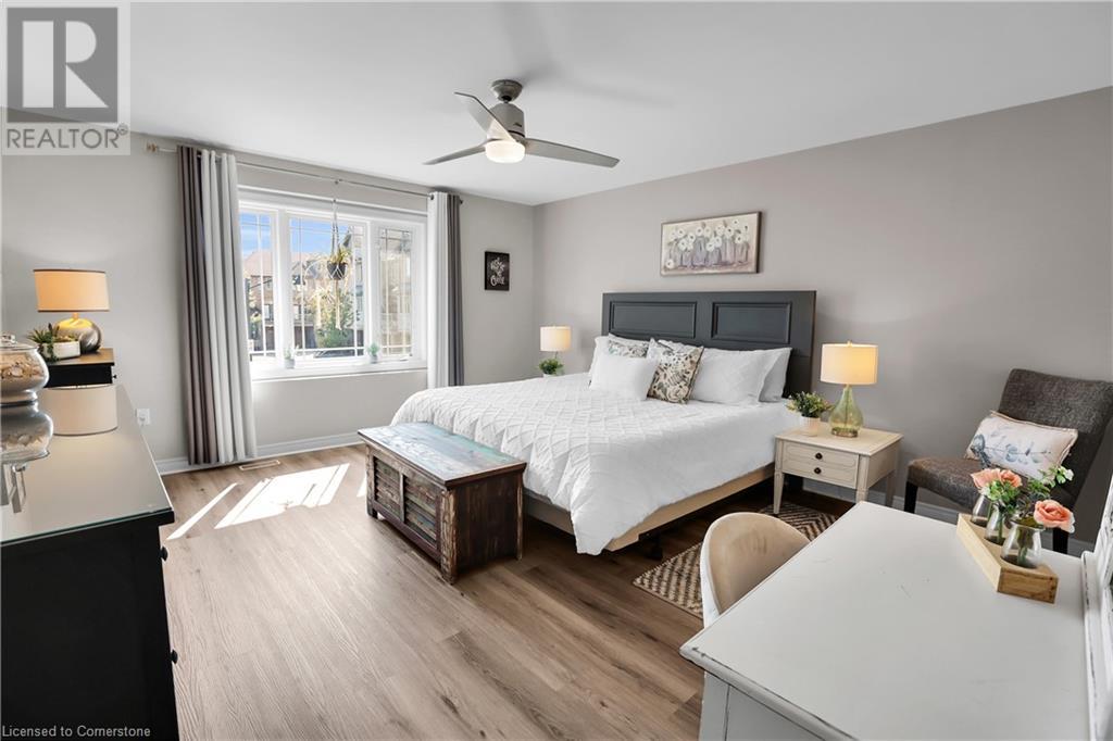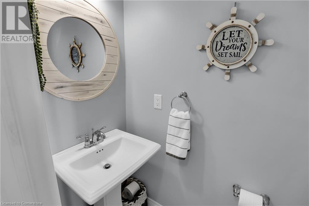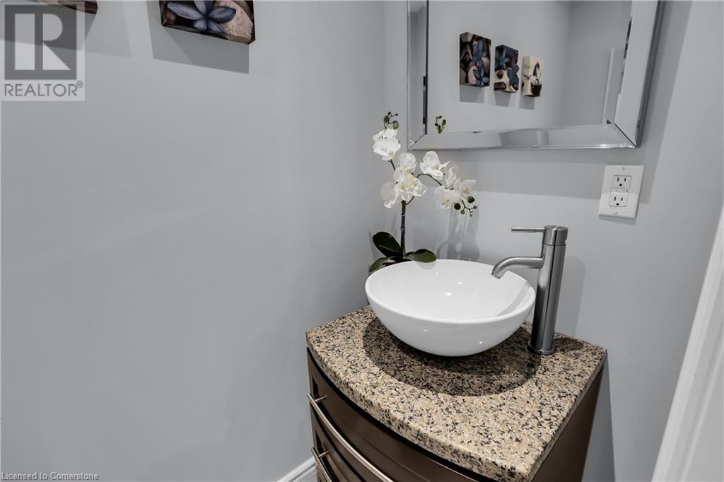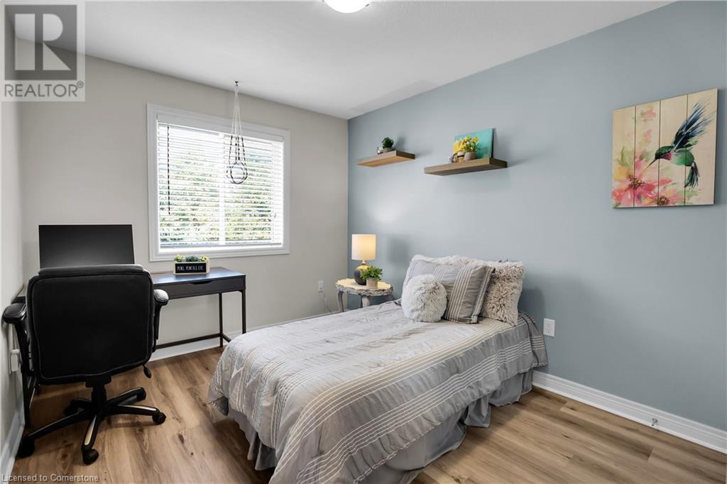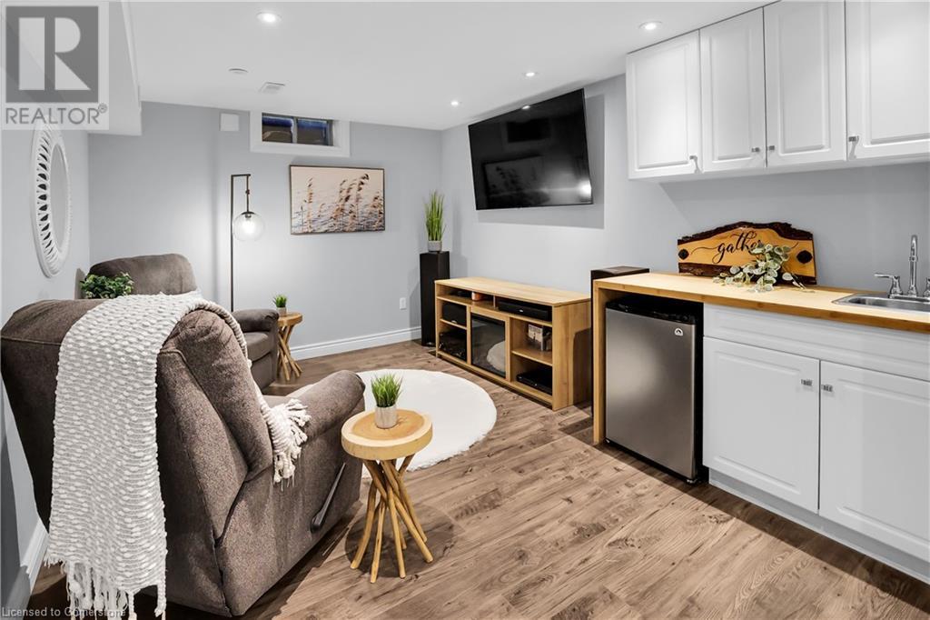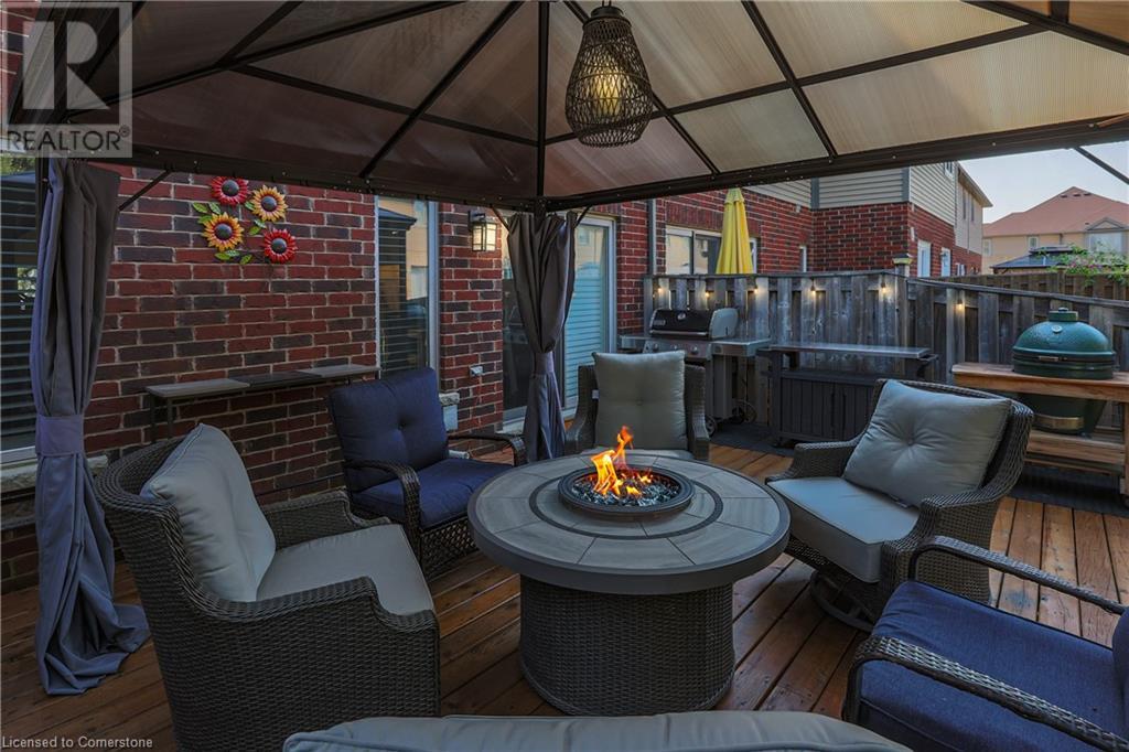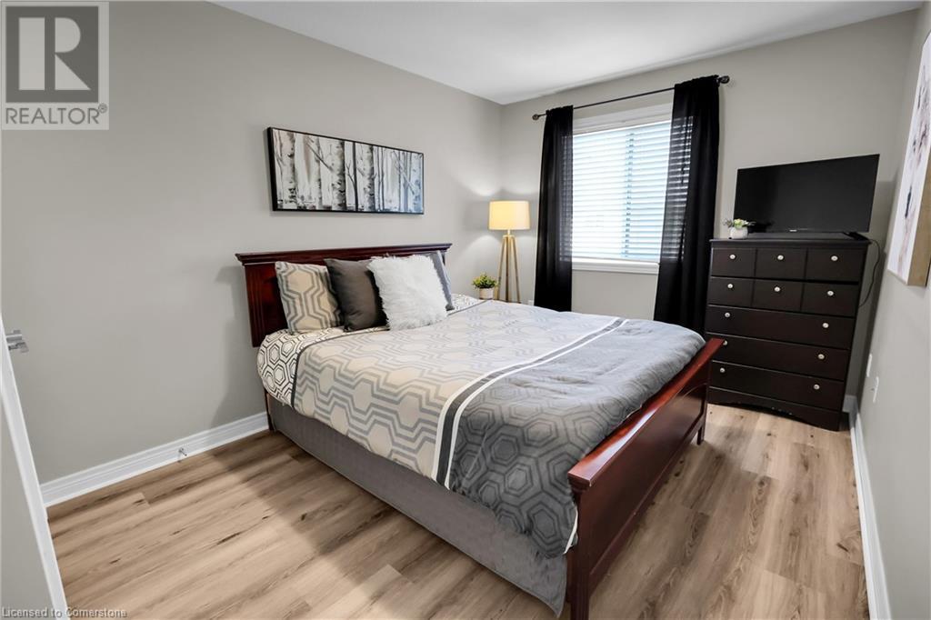 STUNNING FREEHOLD TOWNHOME ... Located in a trendy, family-friendly neighbourhood in Binbrook, find 16-310 Fall Fair Way. Central location close to great schools, Fairground Community Park, walking trails, restaurants, shopping & more. This STYLISH & FULLY FINISHED, 3 + 1 bedRm, 3 bath, 1490 sq ft townhome boasts many gorgeous upgrades throughout! OPEN CONCEPT main level offers a beautifully upgraded kitchen featuring white QUARTZ countertops & brkfst bar island, S/S appliances, upgraded pendant light fixtures & potlights, opening to living area w/updated electric fireplace w/brick surround & wood mantle. WALK OUT from dining area through sliding glass doors to fully fenced, maintenance-free yard w/deck & PRIVACY from tree-lined back fence. 2-pc bath & inside access to attached garage complete the level. Hardwood staircase w/runner & gorgeous feature wall leads to upper level, offering primary bedRm w/walk-in closet PLUS double closets & ensuite privilege to 4-pc bath w/QUARTZ counters; 2 more bedrooms & convenient LAUNDRY. Fully finished lower level offers IN-LAW POTENTIAL w/rec room w/wet bar/kitchenette, bedRm/office, 2-pc bath & storage. Great curb appeal, front landscaping & BONUS Turf in front & back yard means NO LAWN MAINTENANCE! UPDATES include A/C '22, kitchen '21 & MORE. Low road fee of $128/mo includes garbage removal & maintenance of grass & snow in common areas. CLICK ON MULTIMEDIA for video tour, drone photos & more. (id:55009)