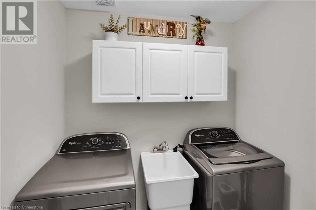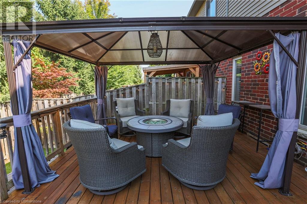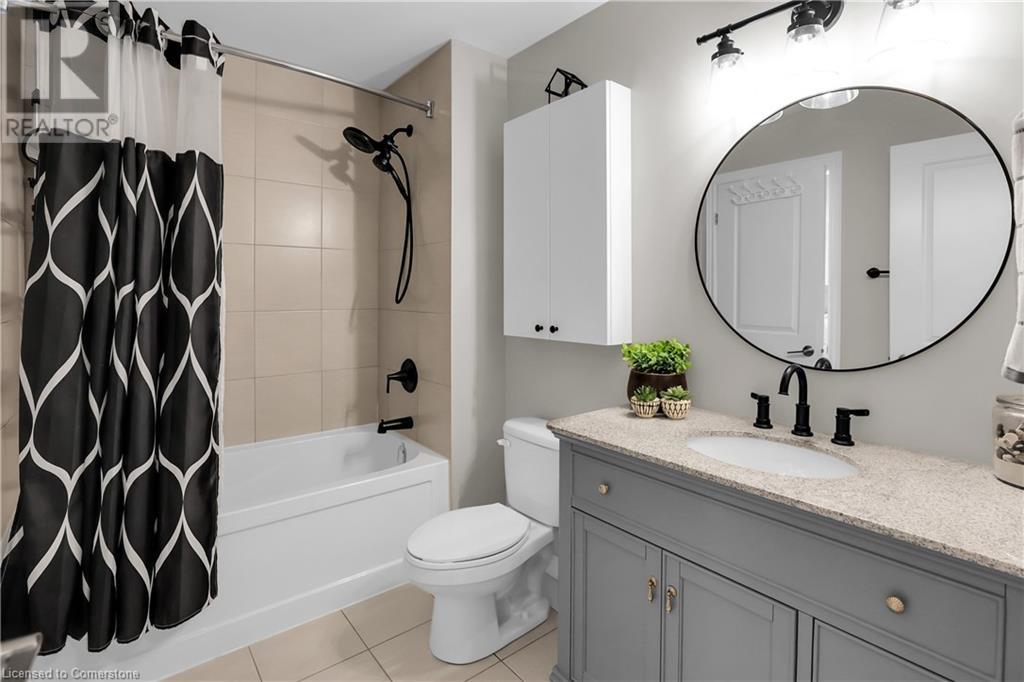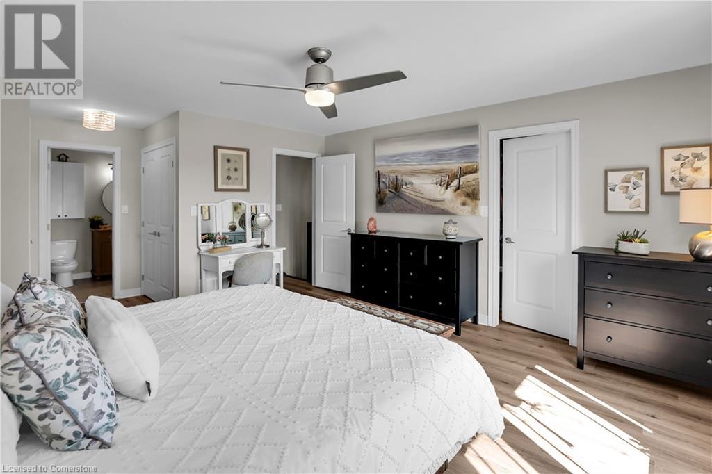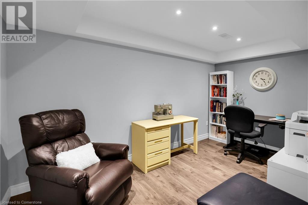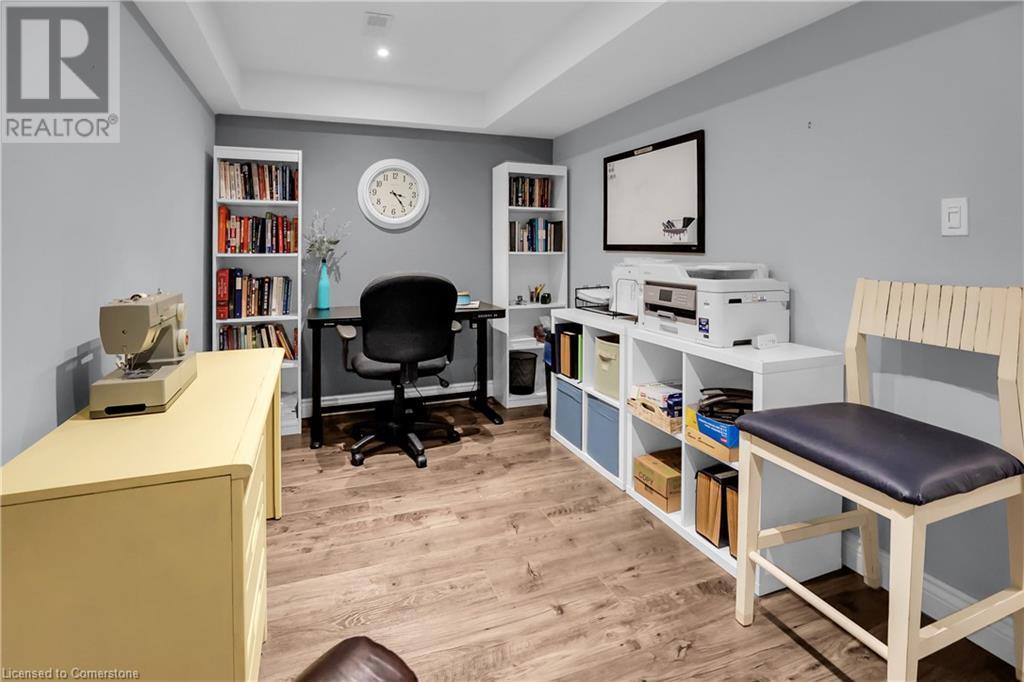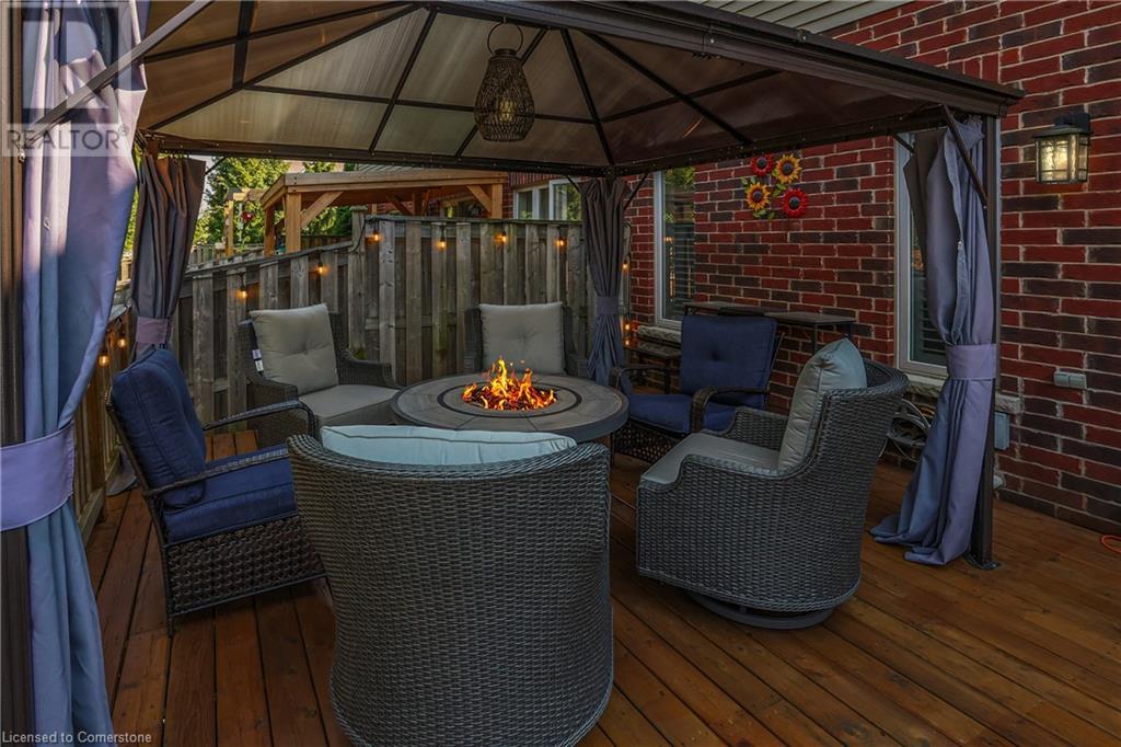 STUNNING FREEHOLD TOWNHOME ... Located in a trendy, family-friendly neighbourhood in Binbrook, find 16-310 Fall Fair Way. Central location close to great schools, Fairground Community Park, walking trails, restaurants, shopping & more. This STYLISH & FULLY FINISHED, 3 + 1 bedRm, 3 bath, 1490 sq ft townhome boasts many gorgeous upgrades throughout! OPEN CONCEPT main level offers a beautifully upgraded kitchen featuring white QUARTZ countertops & brkfst bar island, S/S appliances, upgraded pendant light fixtures & potlights, opening to living area w/updated electric fireplace w/brick surround & wood mantle. WALK OUT from dining area through sliding glass doors to fully fenced, maintenance-free yard w/deck & PRIVACY from tree-lined back fence. 2-pc bath & inside access to attached garage complete the level. Hardwood staircase w/runner & gorgeous feature wall leads to upper level, offering primary bedRm w/walk-in closet PLUS double closets & ensuite privilege to 4-pc bath w/QUARTZ counters; 2 more bedrooms & convenient LAUNDRY. Fully finished lower level offers IN-LAW POTENTIAL w/rec room w/wet bar/kitchenette, bedRm/office, 2-pc bath & storage. Great curb appeal, front landscaping & BONUS Turf in front & back yard means NO LAWN MAINTENANCE! UPDATES include A/C '22, kitchen '21 & MORE. Low road fee of $128/mo includes garbage removal & maintenance of grass & snow in common areas. CLICK ON MULTIMEDIA for video tour, drone photos & more. (id:55009)
