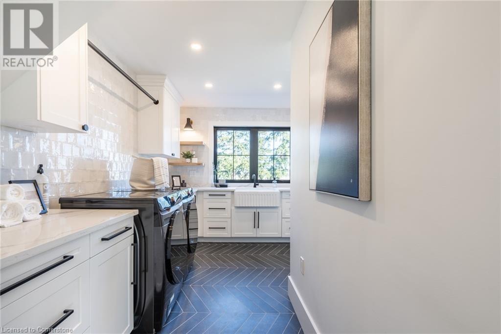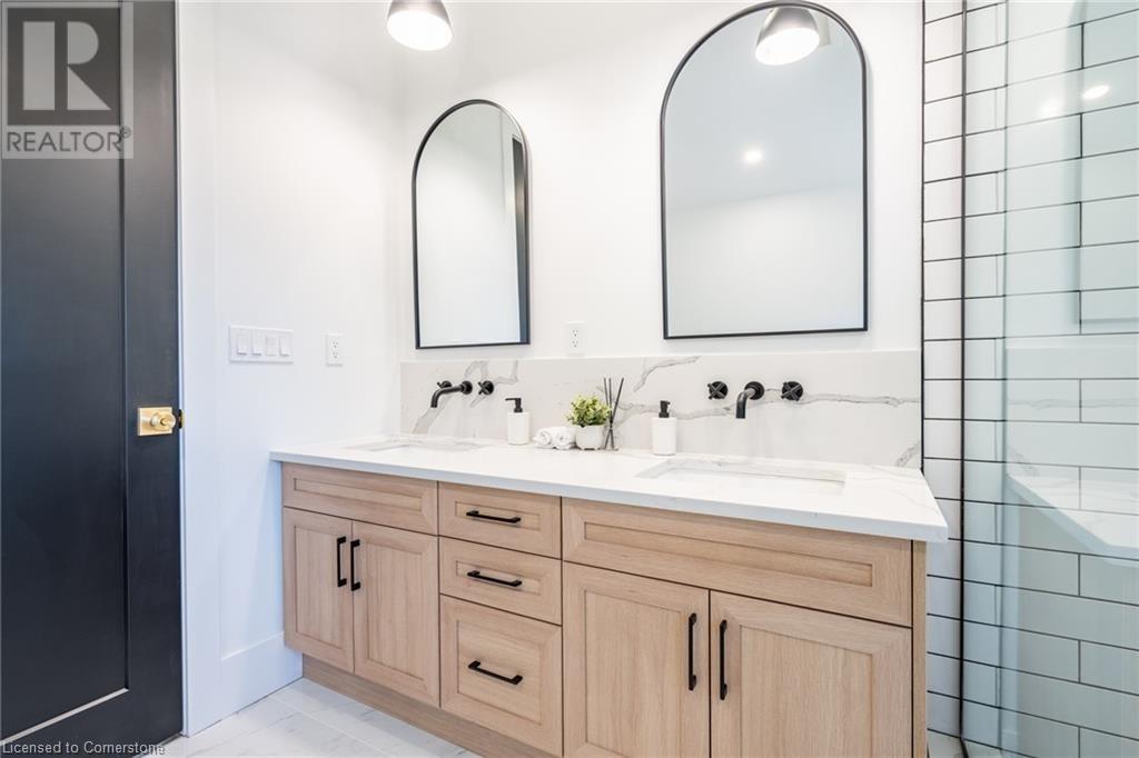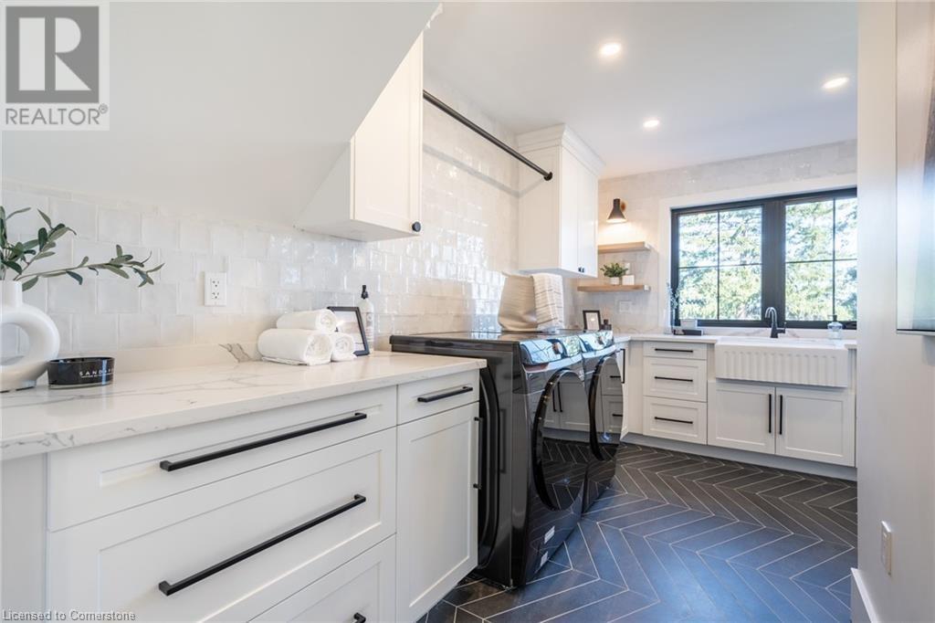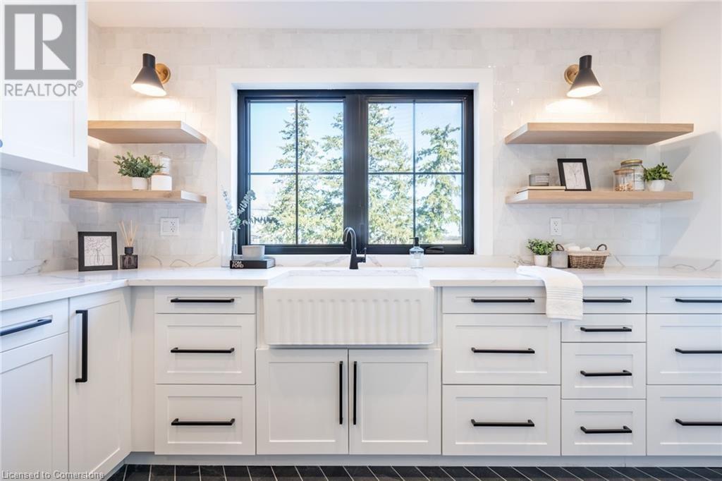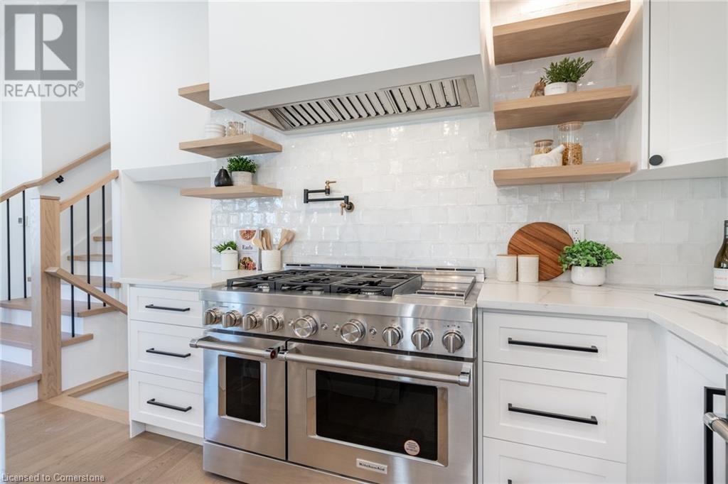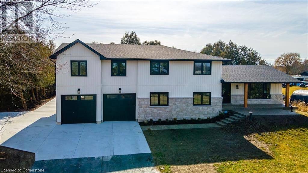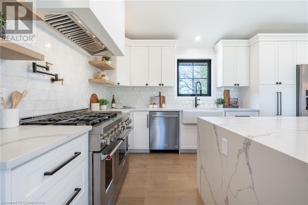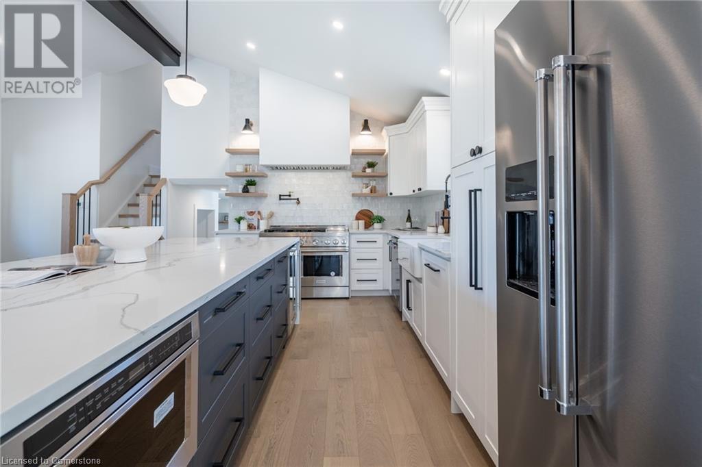 Welcome to luxury living in Binbrook! This fully renovated home offers 4 bedrooms, 3 bathrooms, and top-notch finishes. The star of the home is the stunning kitchen, featuring 12-foot ceilings and a show-stopping 10.5-foot waterfall quartz island. Bathed in natural light, this entertainer's paradise includes brand-new KitchenAid stainless steel appliances: a 6-burner chef's range, dual ovens, fridge, microwave, and wine fridge. The farmhouse sink and imported Spanish ceramic tile backsplash add an extra touch of elegance. Ascend the solid oak staircase to find a spa-like bathroom with a custom dual-sink vanity, quartz countertops, a soaker tub, and a walk-in shower with chic hex and subway tiles. The rainfall showerhead completes the luxurious feel. The oversized primary bedroom is a serene escape, featuring a walk-in closet with built-ins and an ensuite spa with dual sinks, an XL soaker tub, and a walk-in quartz shower with a rainfall showerhead, jets, and wand. The dream laundry/mudroom boasts new Samsung washer/dryer units, ample storage, and a deep farmhouse sink. Step outside to a walkout deck off the kitchen—perfect for relaxing or entertaining. The home also includes an attached oversized double-car garage and a 16x16-foot workshop. Close to all amenities, this is luxury living at its finest! (id:55009)