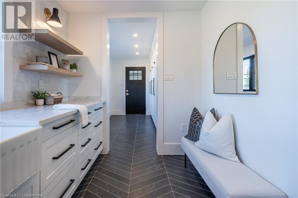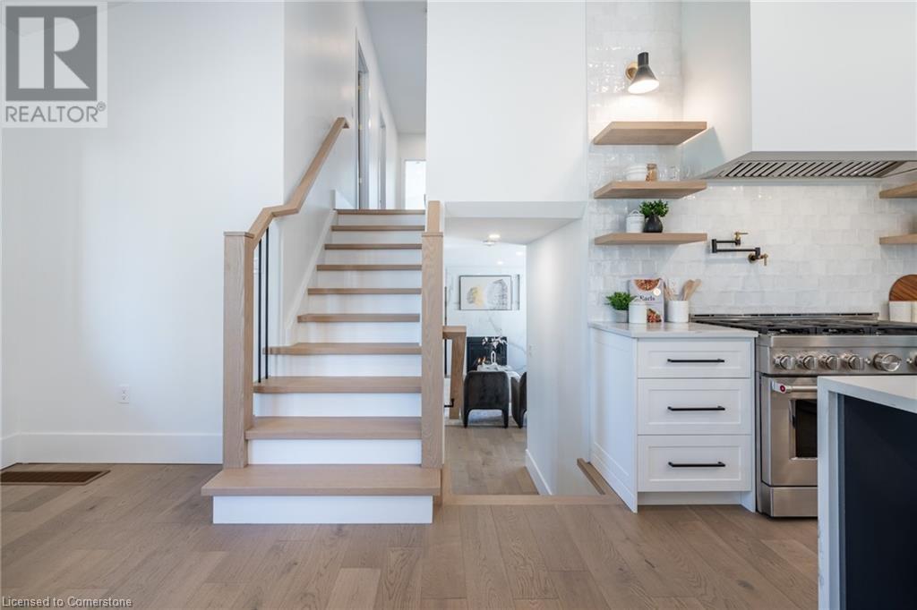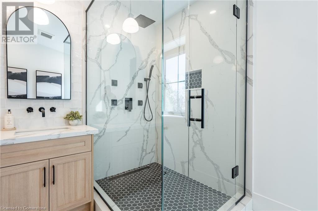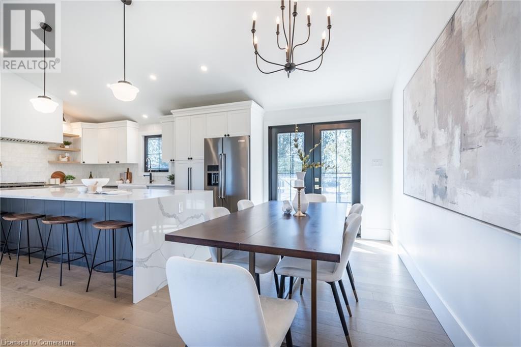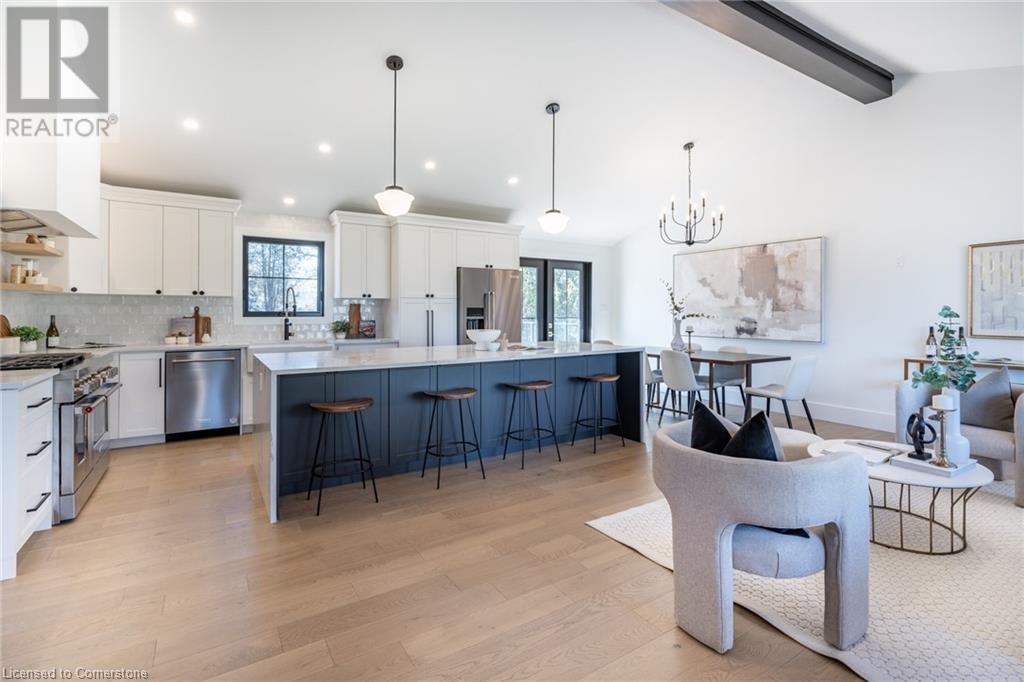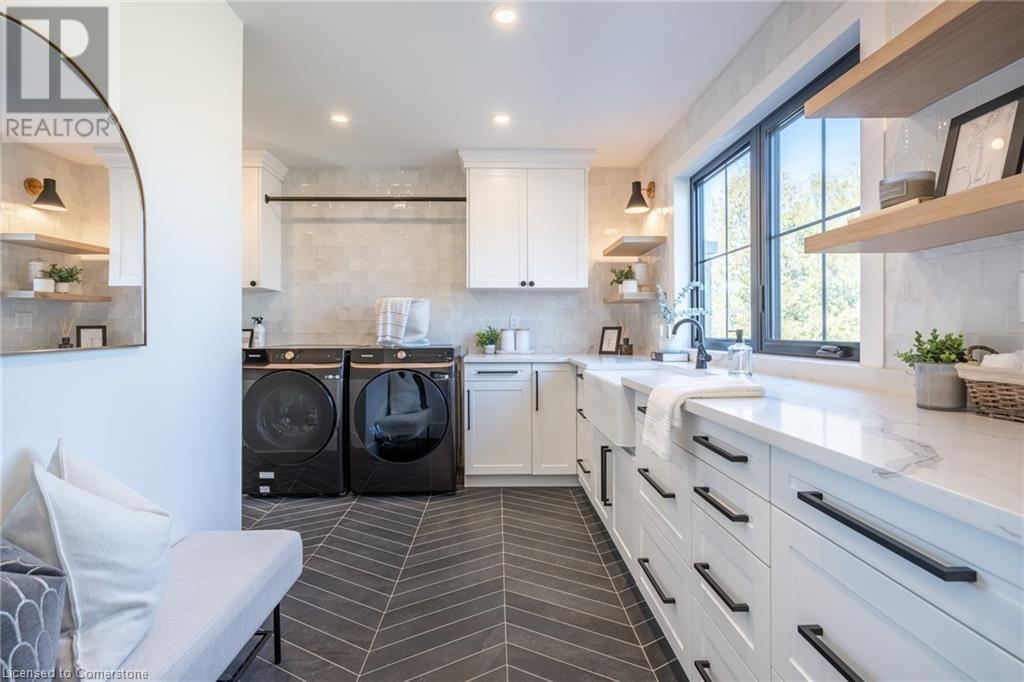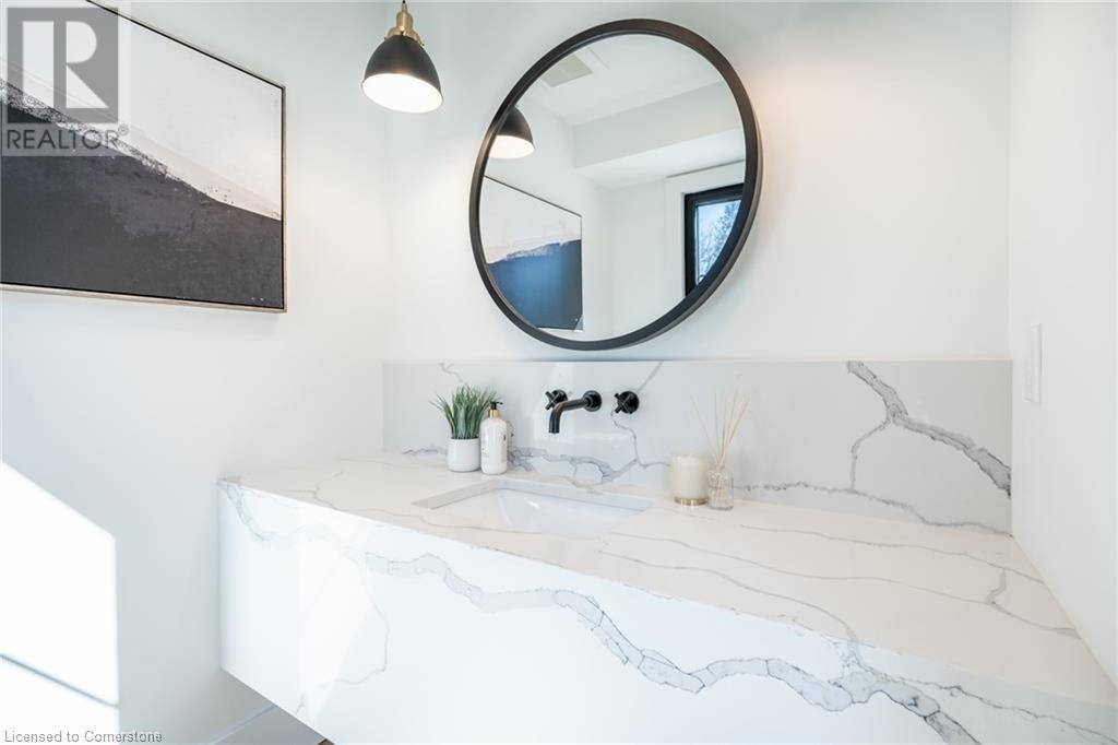 Welcome to luxury living in Binbrook! This fully renovated home offers 4 bedrooms, 3 bathrooms, and top-notch finishes. The star of the home is the stunning kitchen, featuring 12-foot ceilings and a show-stopping 10.5-foot waterfall quartz island. Bathed in natural light, this entertainer's paradise includes brand-new KitchenAid stainless steel appliances: a 6-burner chef's range, dual ovens, fridge, microwave, and wine fridge. The farmhouse sink and imported Spanish ceramic tile backsplash add an extra touch of elegance. Ascend the solid oak staircase to find a spa-like bathroom with a custom dual-sink vanity, quartz countertops, a soaker tub, and a walk-in shower with chic hex and subway tiles. The rainfall showerhead completes the luxurious feel. The oversized primary bedroom is a serene escape, featuring a walk-in closet with built-ins and an ensuite spa with dual sinks, an XL soaker tub, and a walk-in quartz shower with a rainfall showerhead, jets, and wand. The dream laundry/mudroom boasts new Samsung washer/dryer units, ample storage, and a deep farmhouse sink. Step outside to a walkout deck off the kitchen—perfect for relaxing or entertaining. The home also includes an attached oversized double-car garage and a 16x16-foot workshop. Close to all amenities, this is luxury living at its finest! (id:55009)