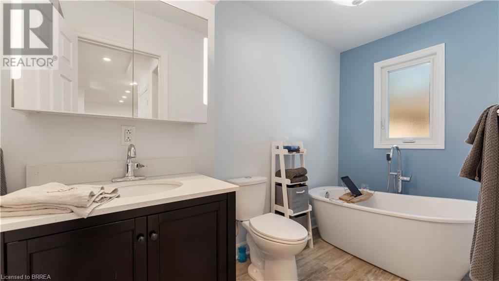 Experience modern comfort and style in this inviting 1-1/2 story home, ideally positioned with easy highway access for convenient commuting. This residence features 2 plus 1 bedrooms and 2 well-designed bathrooms, including a main floor bath with a soaker tub. The open concept layout seamlessly connects the kitchen, dining, and living areas, perfect for family gatherings and entertaining guests. The kitchen has quartz countertops, stainless steel appliances and a center island with a bamboo top . Relax by the gas fireplace in the living room or enjoy the outdoors through the French doors leading to a deck. The dining area has a large bay window making the living space nice and bright. The upstairs area offers a primary bedroom with sliding barn closet doors, a second bedroom and a three piece bathroom. Downstairs, the finished space provides a versatile area for a recreation room, office, or playroom, complete with its own entrance for added convenience. A third bedroom and laundry area complete this level. There is also a detached single car garage. (id:55009)
