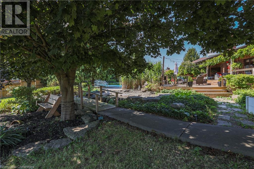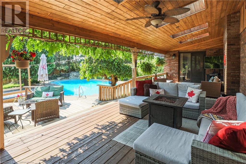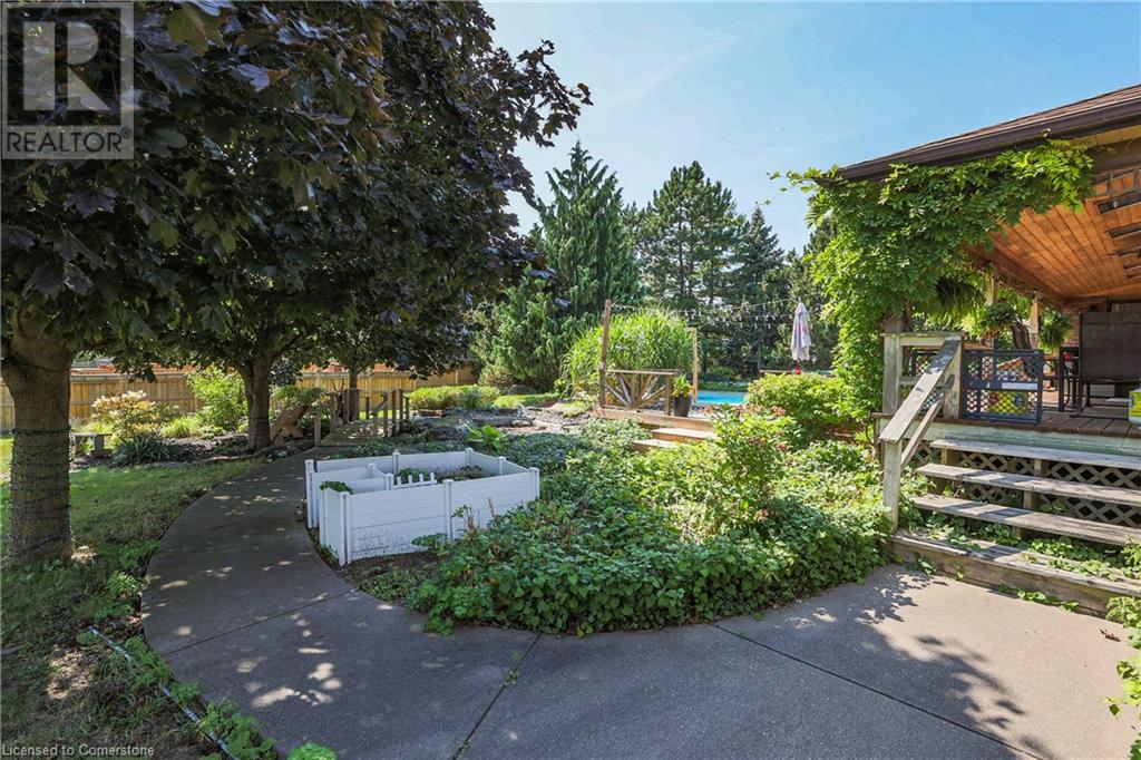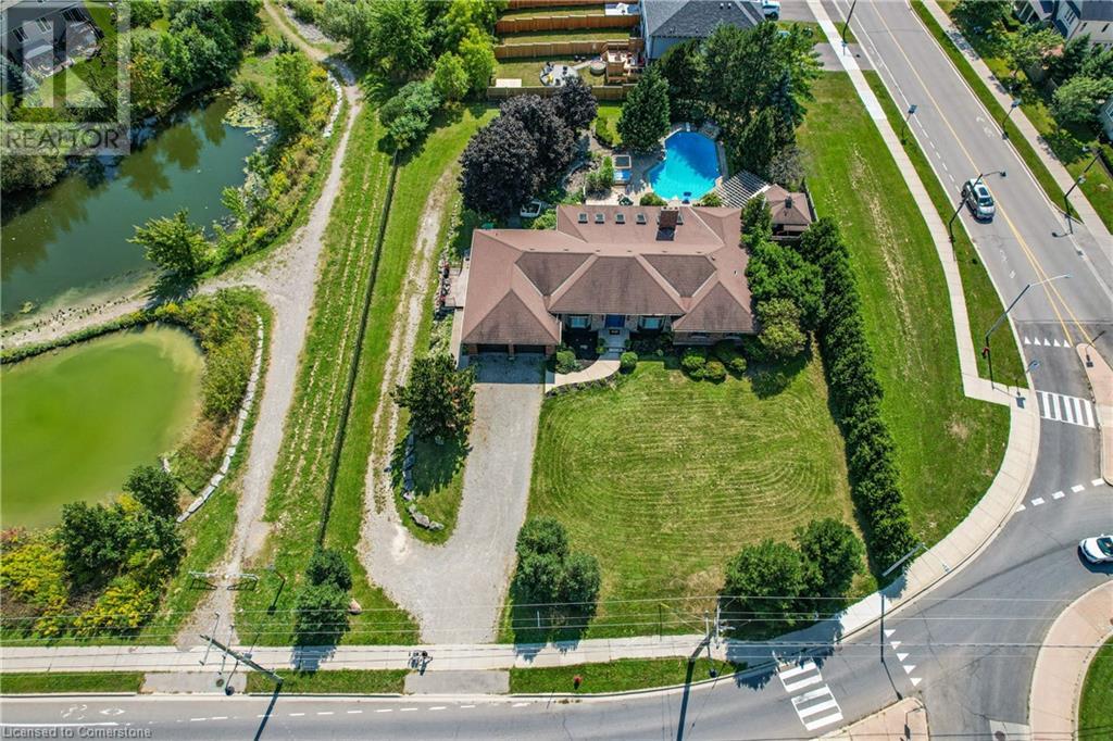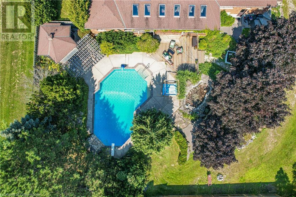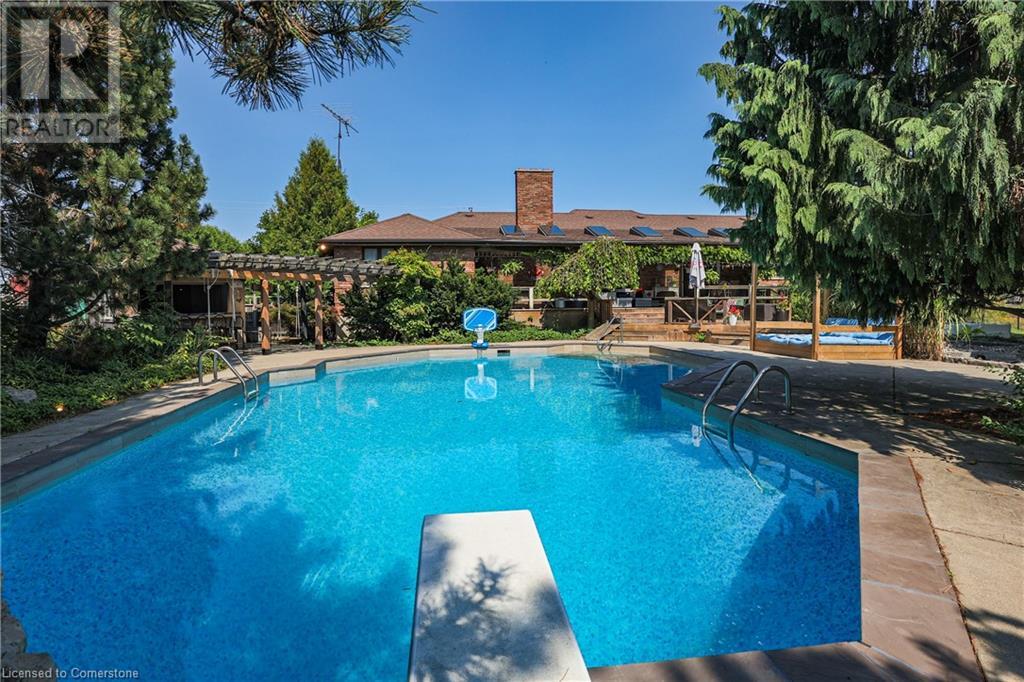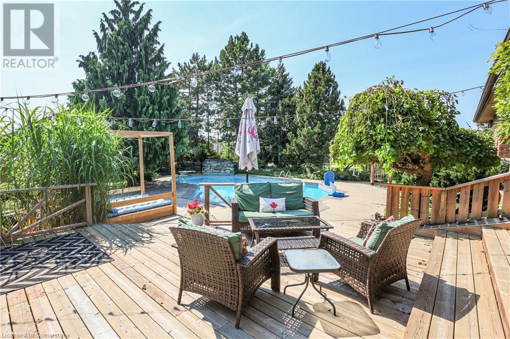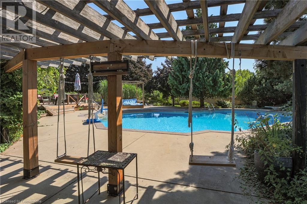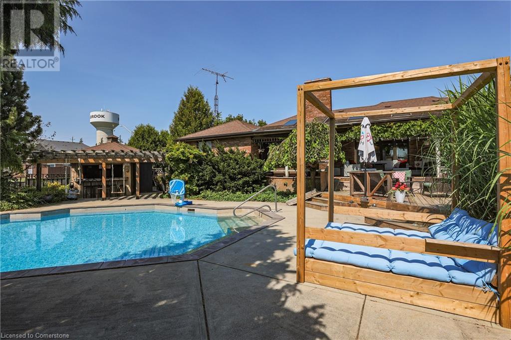 SPRAWLING BUNGALOW w/OASIS YARD...Find this RESORT-LIKE property at 3205 Binbrook Road, Binbrook, sitting in a central location close to great schools, Fairground Community Park, walking trails, library, restaurants, shopping & more. This 3+1 bedRm, 3 bath 2605 sq ft, RAISED BUNGALOW is surrounded by green space & offers a true OASIS YARD w/INGROUND POOL, custom 2-tier deck, multiple sitting areas, cabana/pool house, outdoor bar & beautiful armour stone along back of property. Grand foyer w/spiral staircase, crystal chandelier & slate tile leads through FRENCH doors to formal dinRm w/BAY window & second set of FRENCH DOORS to oversized, GOURMET, EAT-IN kitchen boasting GRANITE counters, XL island w/gas cooktop, abundant cabinetry & pantry closet, plus WALK OUT to huge, covered deck w/6 skylights & sitting areas. Sunken livRm w/hdwd floors, wood fireplace & picture windows overlooks backyard. Spacious primary bedRm w/private WALK OUT to back deck, WALK IN closet & ensuite privilege to STUNNING 5-pc bath w/heated floors, soaker tub & separate shower. 2 more bedrooms & updated 3-pc bath complete the level. Lower level offers plush carpet throughout (2020), solid oak WET BAR & 6 stools, 4-pc bath, plus BONUS ROOM could be bedroom, office, mancave - whatever you desire! Separate side entry w/porch leads to mudroom w/storage, laundry & attached DOUBLE GARAGE & driveway w/enough parking for an RV, boat or 18 cars! CLICK ON MULTIMEDIA for video tour, drone photos & more. (id:55009)