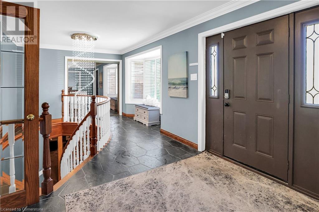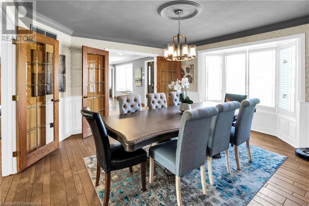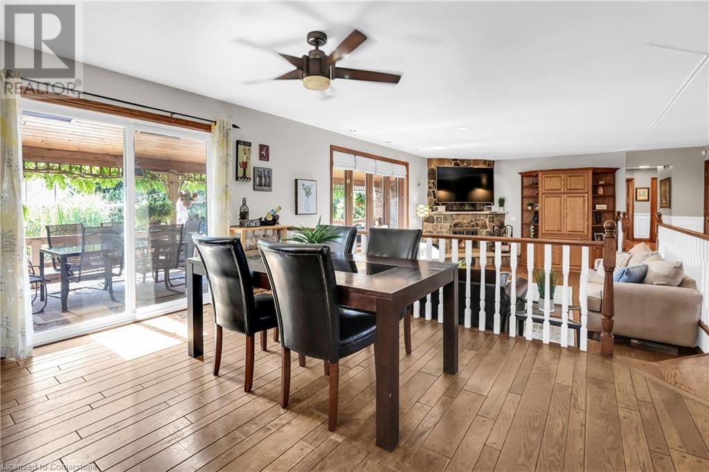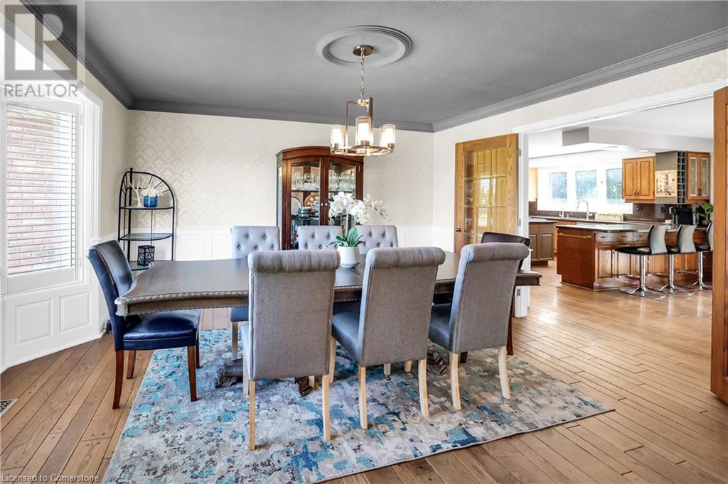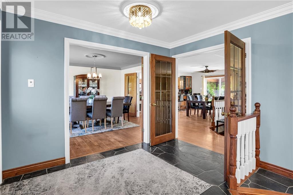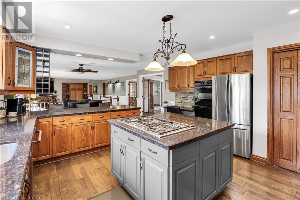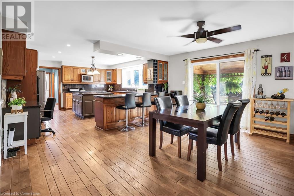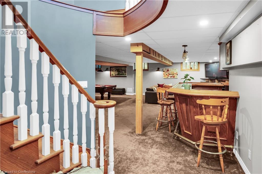 SPRAWLING BUNGALOW w/OASIS YARD...Find this RESORT-LIKE property at 3205 Binbrook Road, Binbrook, sitting in a central location close to great schools, Fairground Community Park, walking trails, library, restaurants, shopping & more. This 3+1 bedRm, 3 bath 2605 sq ft, RAISED BUNGALOW is surrounded by green space & offers a true OASIS YARD w/INGROUND POOL, custom 2-tier deck, multiple sitting areas, cabana/pool house, outdoor bar & beautiful armour stone along back of property. Grand foyer w/spiral staircase, crystal chandelier & slate tile leads through FRENCH doors to formal dinRm w/BAY window & second set of FRENCH DOORS to oversized, GOURMET, EAT-IN kitchen boasting GRANITE counters, XL island w/gas cooktop, abundant cabinetry & pantry closet, plus WALK OUT to huge, covered deck w/6 skylights & sitting areas. Sunken livRm w/hdwd floors, wood fireplace & picture windows overlooks backyard. Spacious primary bedRm w/private WALK OUT to back deck, WALK IN closet & ensuite privilege to STUNNING 5-pc bath w/heated floors, soaker tub & separate shower. 2 more bedrooms & updated 3-pc bath complete the level. Lower level offers plush carpet throughout (2020), solid oak WET BAR & 6 stools, 4-pc bath, plus BONUS ROOM could be bedroom, office, mancave - whatever you desire! Separate side entry w/porch leads to mudroom w/storage, laundry & attached DOUBLE GARAGE & driveway w/enough parking for an RV, boat or 18 cars! CLICK ON MULTIMEDIA for video tour, drone photos & more. (id:55009)