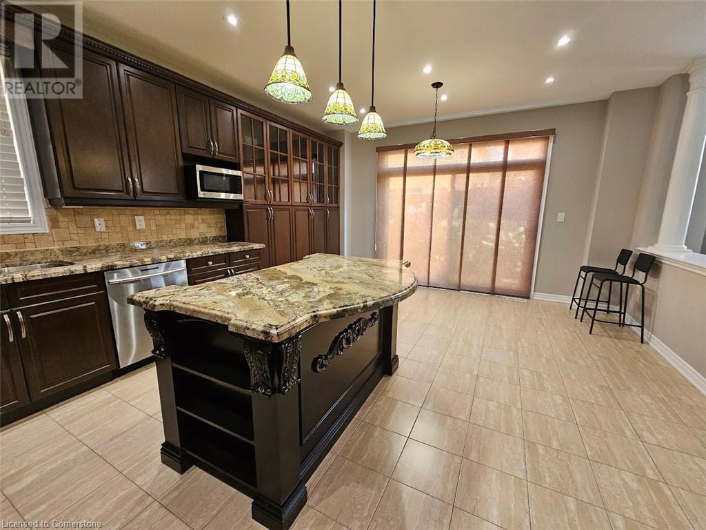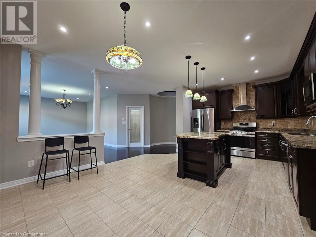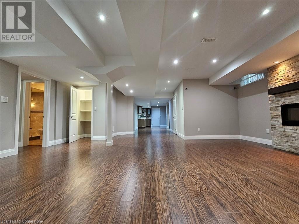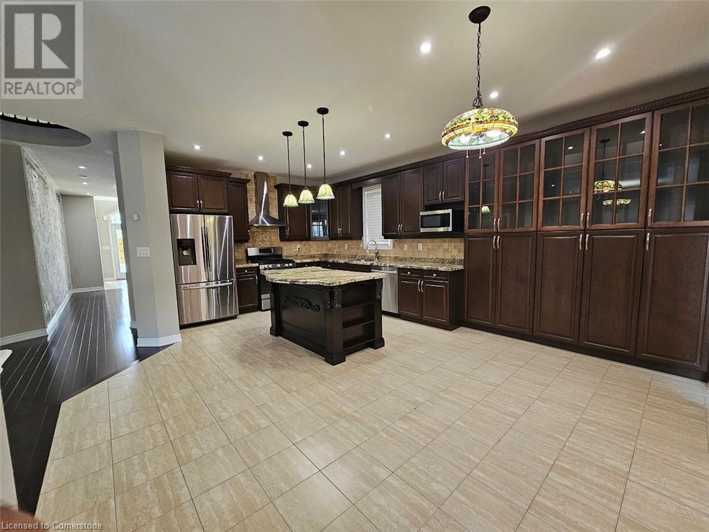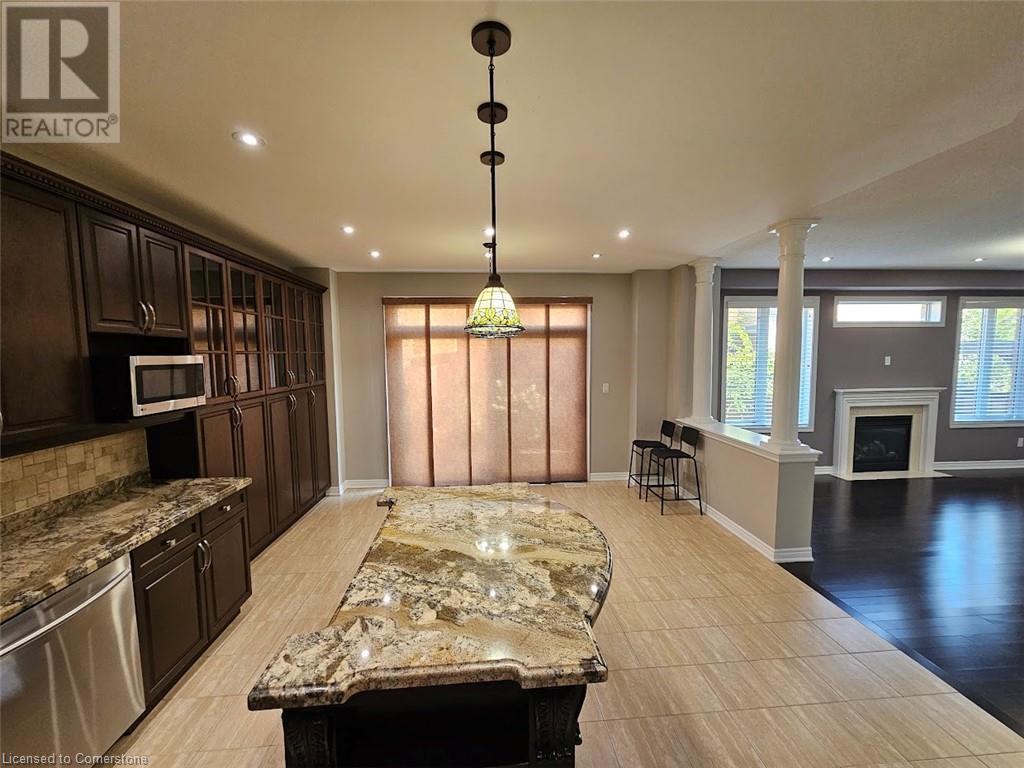 Welcome to Alton Village – A Stunning 2-Storey Luxury Home located in a highly desirable neighborhood! This gorgeous all-brick and stone detached home offers + 4,000 sq ft of luxurious living space (2,818 sq ft above grade, as per builder's drawings). With 4+1 bedrooms and 4.5 baths, including 3 full baths on the second floor. The main level features hardwood flooring, LED pot lights, and soaring 9ft ceilings. The living room is warmed by a gas fireplace and built-in speakers, perfect for cozy nights in. The kitchen is a chef’s dream, offering plenty of cabinets, stainless steel appliances, high-end finishes, a stone countertop, and an open-concept breakfast area with a kitchen island. The primary bedroom boasts a spacious double door entry, a large walk-in closet with a custom organizer, and a modern 5-piece ensuite with a bath tub, a walk-in shower, and a double vanity sink. A second bedroom features hardwood flooring, a 4-piece ensuite, and a custom closet organizer. The third and fourth bedrooms have access to the main 4-piece bath. The fully finished basement is an entertainer’s delight, with a spacious rec room and a bar, a 5th bedroom with a custom closet organizer and walk-in closet, a 4-piece bath with a standing shower, and an additional den. Outside, enjoy the convenience of a double car garage, a stamped concreate from the main entrance to the back yard. A prime location close to top-rated schools, amenities, scenic trails, lakes, and ponds. (id:55009)