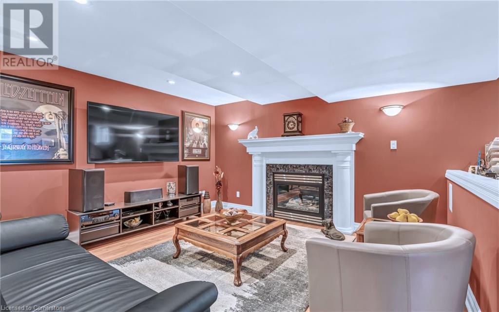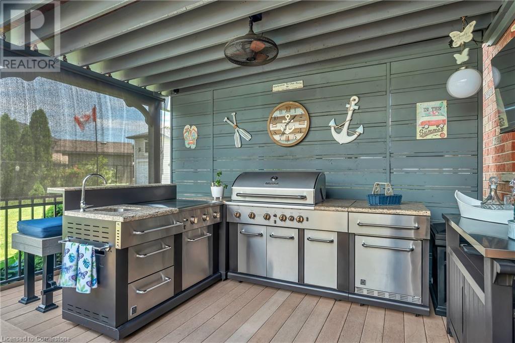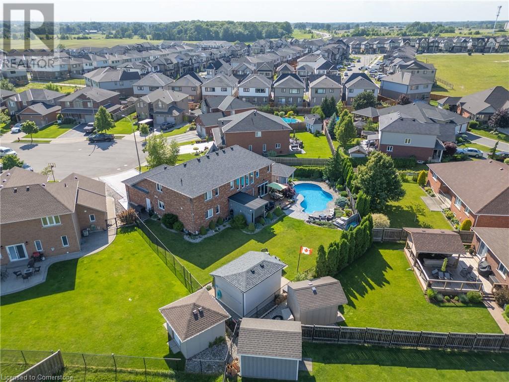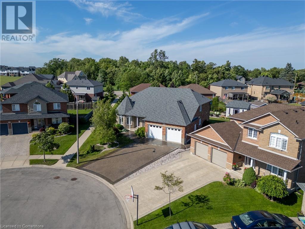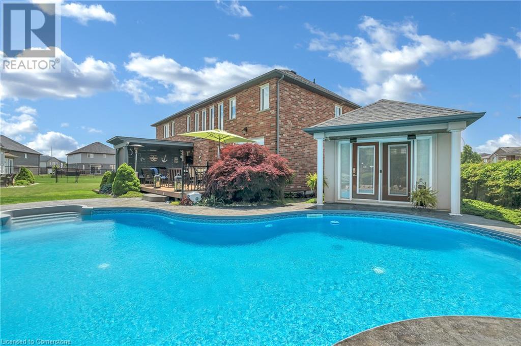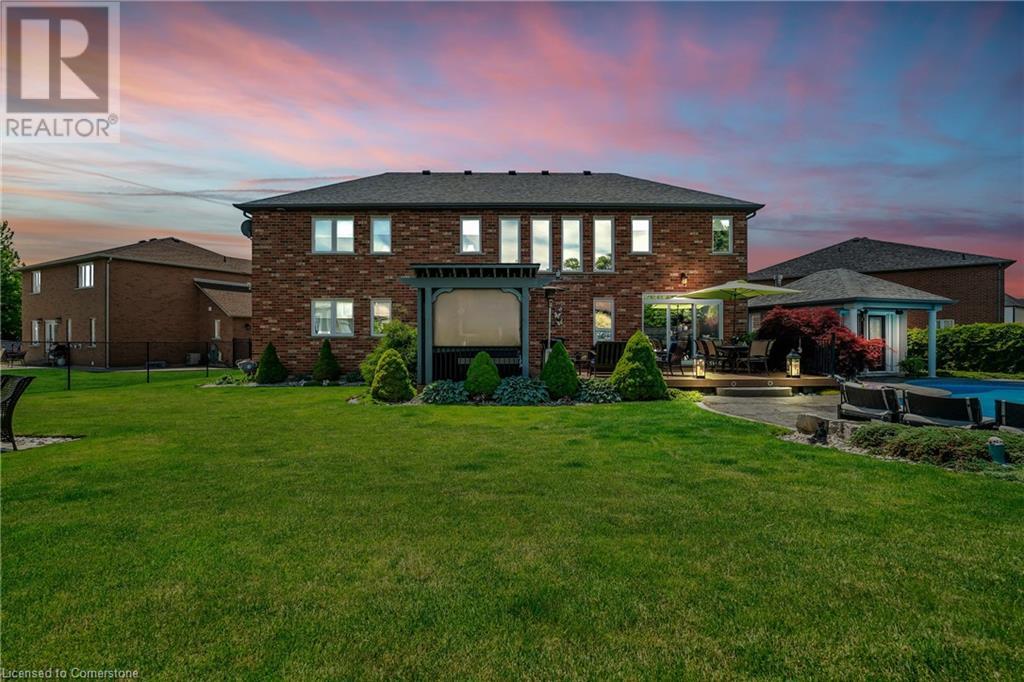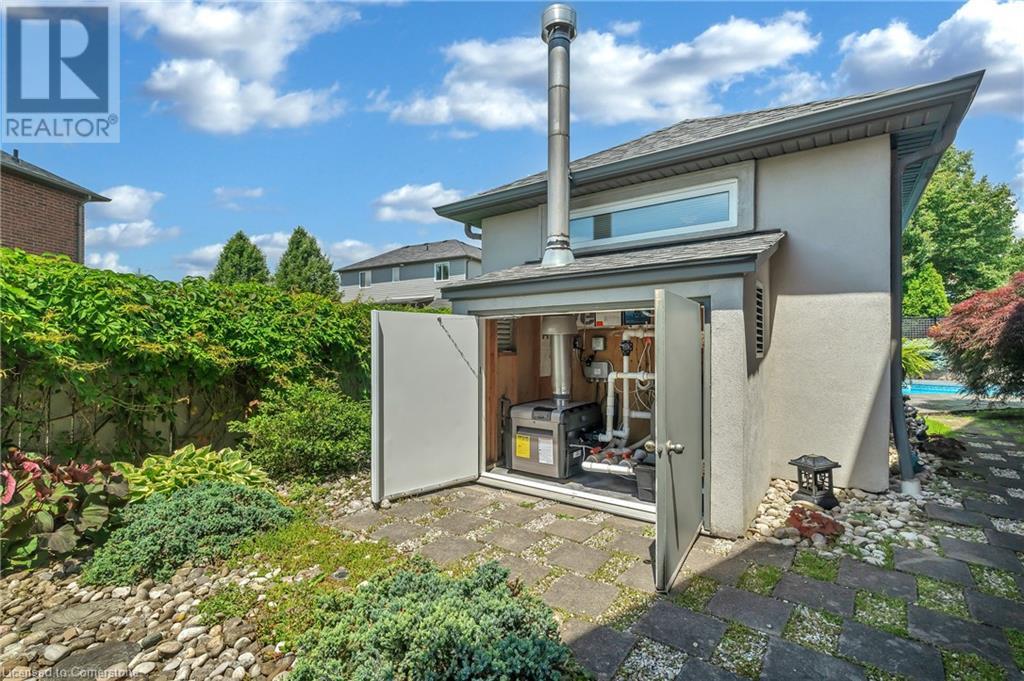 Custom-built home with over 5000sf of finished living space, meticulously maintained by original owners. It offers 2 primary bedrooms, as well as a full in law suite, ideal for a multi generational family. Situated on an oversized pie shaped lot, 10 min to Upper James shopping. This stunning property boasts a wide stamped concrete drive w/ parking for 4 vehicles + oversized double car garage, 11 ft in height, w/ 9 foot high garage doors, perfect to accommodate a car lift. Main floor features a dream kitchen with custom cabinetry, quartz countertops, extra large sink & eating area with oversized patio door leading to the backyard oasis. Main floor primary bed w/ walk in closet & 6pc ensuite. Bright & spacious 2 storey family rm w/ natural gas fireplace, separate living & dining room, bed/office, 2 pc bath & main floor laundry off of the garage. The upper level offers a family room, 3 bedrooms, including 2 that offer ensuites & walk in closets. Fully finished basement has a full kitchen with dining area, rec room, bed w/ ensuite privilege to 3pc bath, office, workshop, 2nd laundry rm, + hot tub & hobby room. Gorgeous backyard featuring inground saltwater pool w/ new heater, updated liner, stamped concrete surround, Trex decking on patio & in the covered outdoor kitchen area, outdoor speakers & oversized custom shed. 4 season sunroom is the perfect place to relax. Recent updates include roof shingles 2020, shed & sun rm shingles 2022, furnace & A/C 2023.This home must be seen! (id:55009)