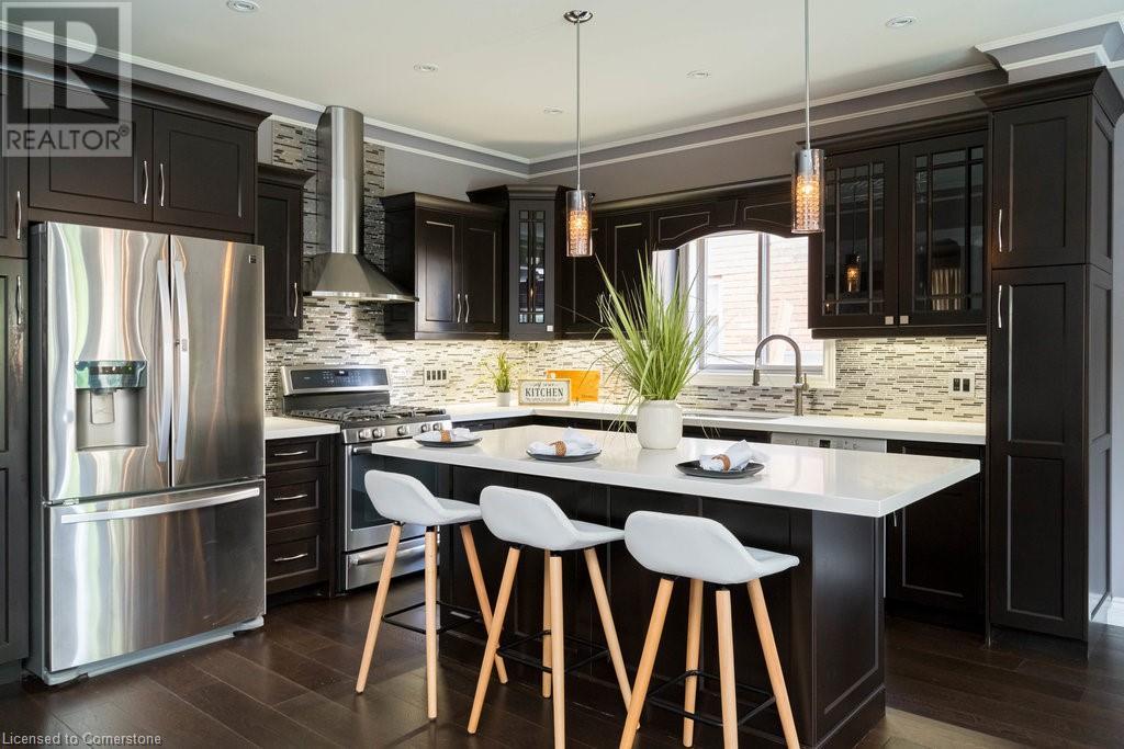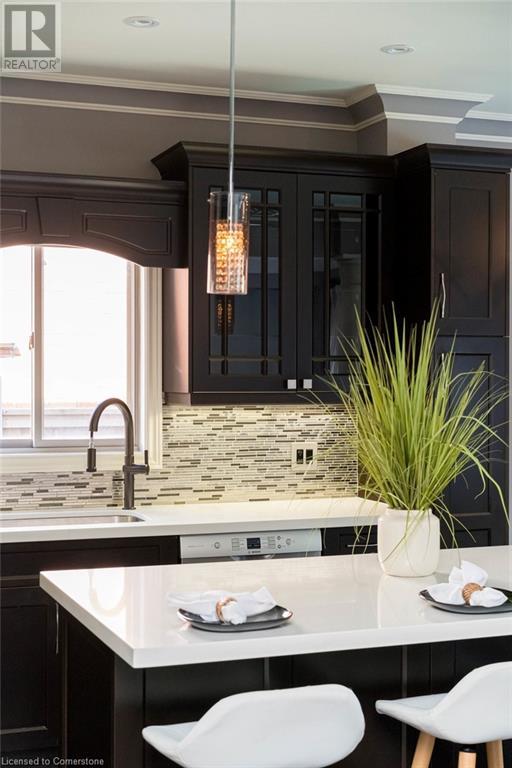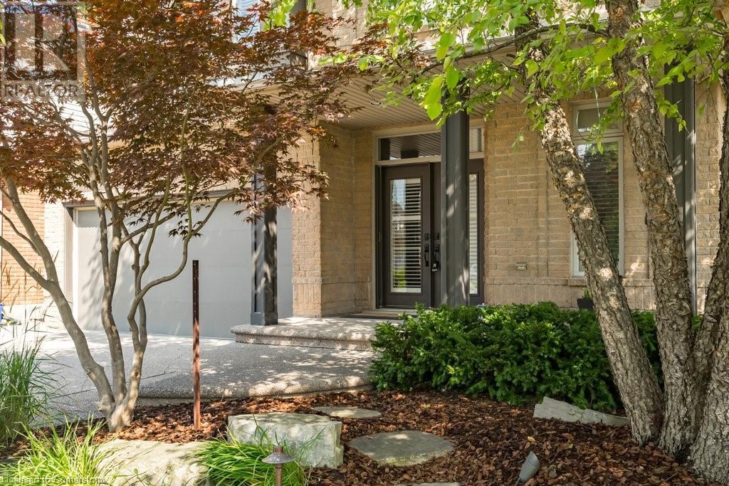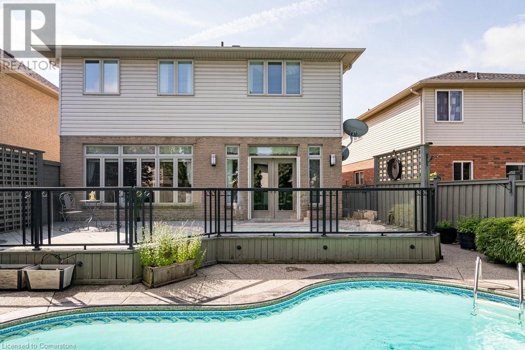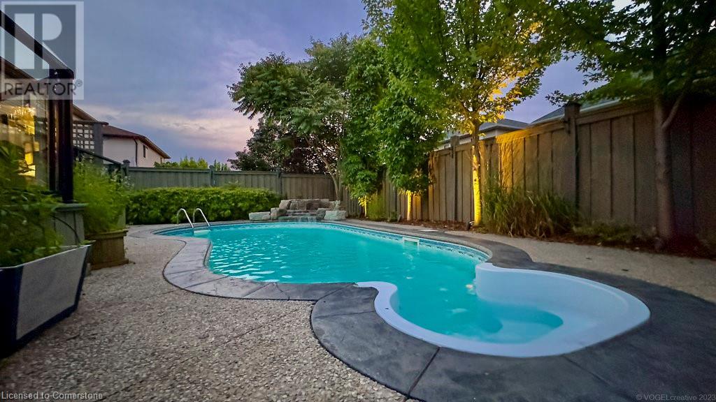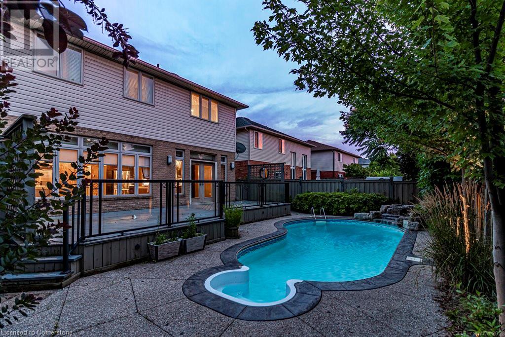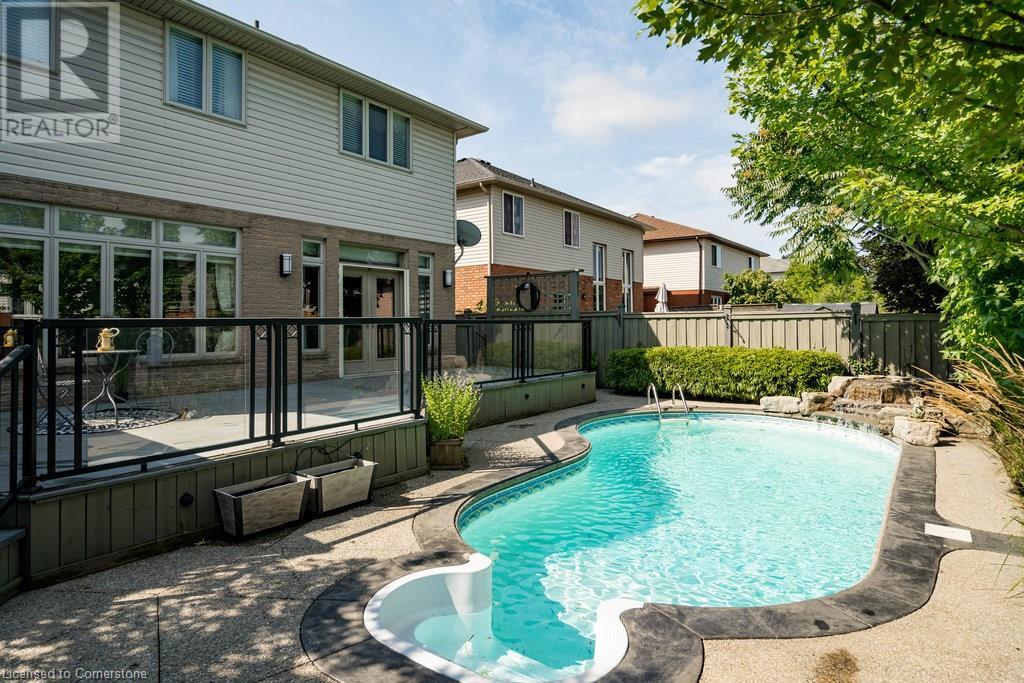 Striking curb appeal and this lovely 2 storey Brick & Stucco Home in South Meadowlands of Ancaster. Enter the welcoming foyer w/ Cathedral ceiling & 2pc Powder room. Coffered ceilings in the elegant Dining room, Quartz counters & island in the sleek Kitchen w/ breakfast area, and Family room w/ gas FP enjoys lovely views of the fenced b/yard! Perfect for Entertaining family & friends. Hardwood most areas & gorgeous staircase leads to the 2nd level w/ 4 spacious bdrms, 5 pc. Ensuite, 4 pc. bth & great closet space. Finished Lower Level w/ Home Theatre room w/ Fireplace, a dry bar, Office & 2 pc. Bthrm * w/out to the In-ground S/W Water Pool w a ZenWaterfall, concrete patio, even a bunky w/ sink & storage space * Dbl. garage w/ inside entry to main floor laundry. Concrete drive fits 4 cars. Close to schools, parks, shopping, the 403, bus & transit routes & most amenities you want in a wonderful family friendly locale! NB; Some staged room photos from previous listing, (same owners).Vacant possession 01/03/2025. (id:55009)