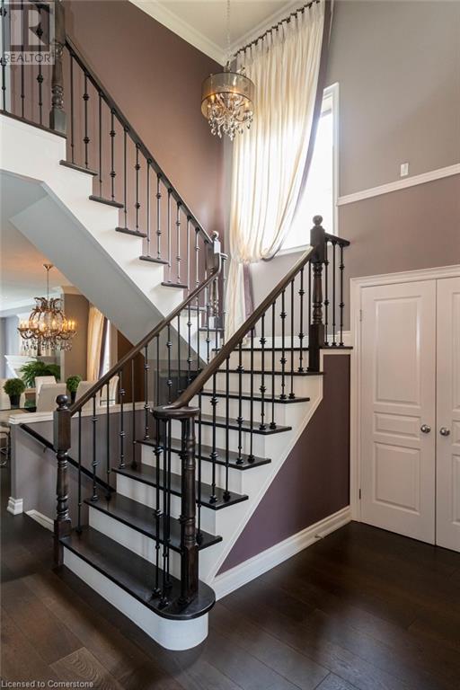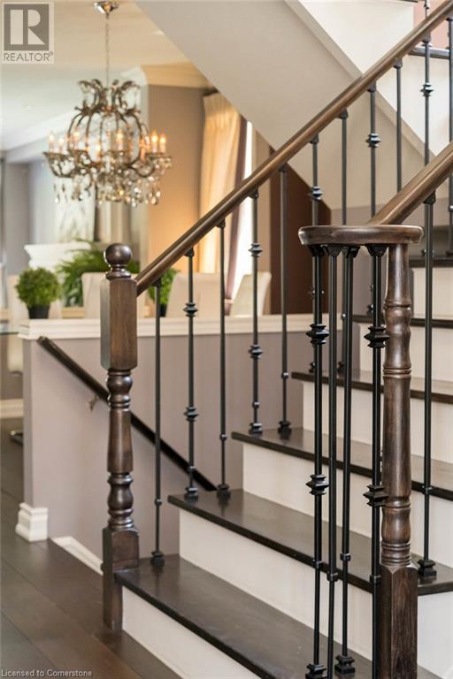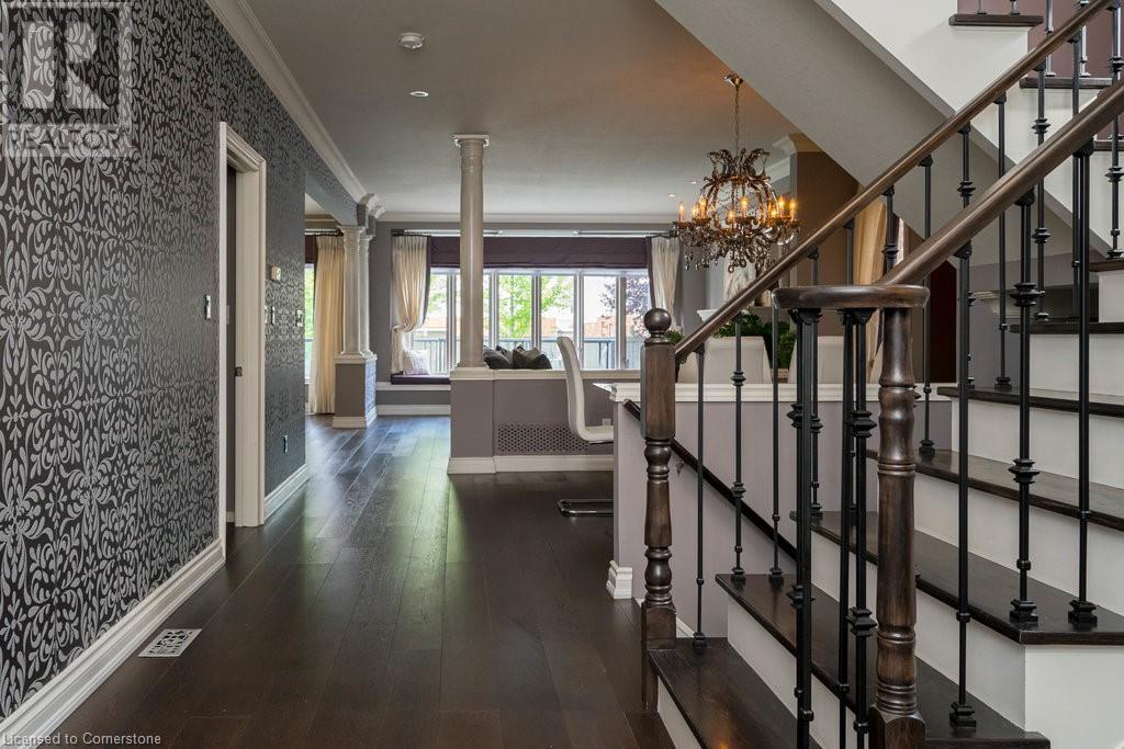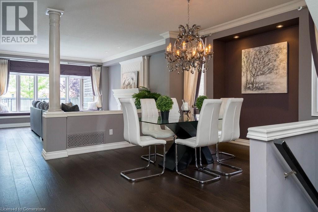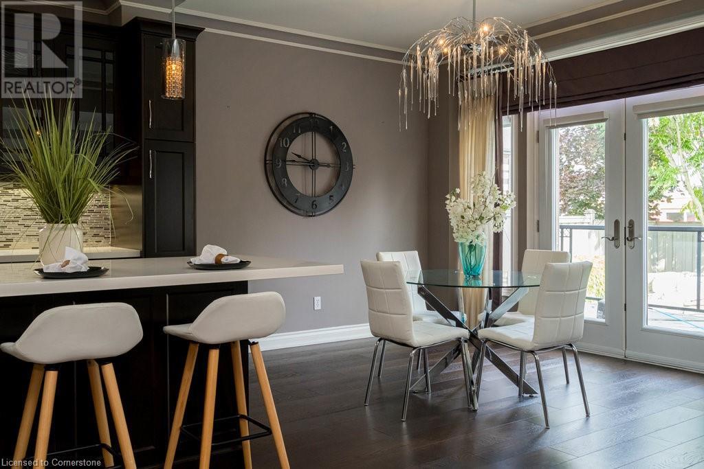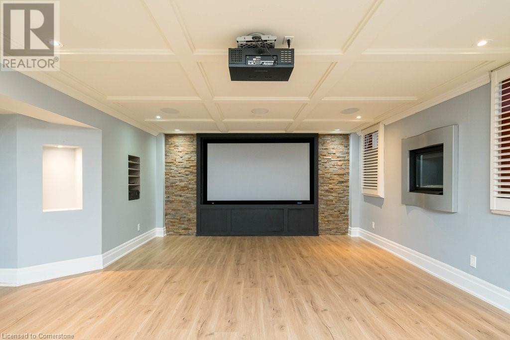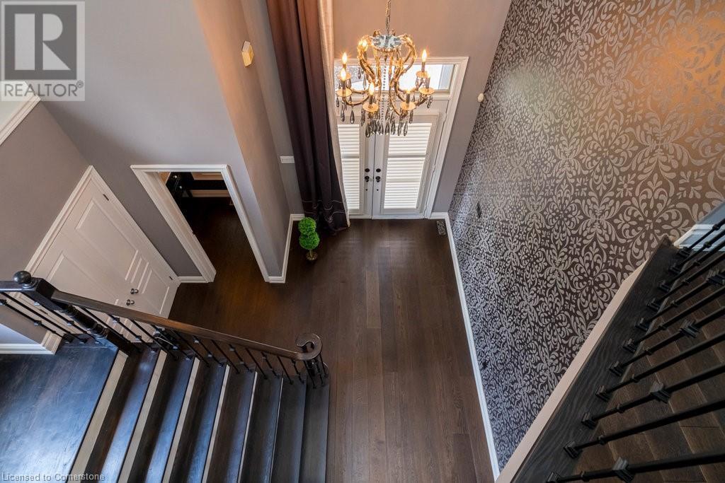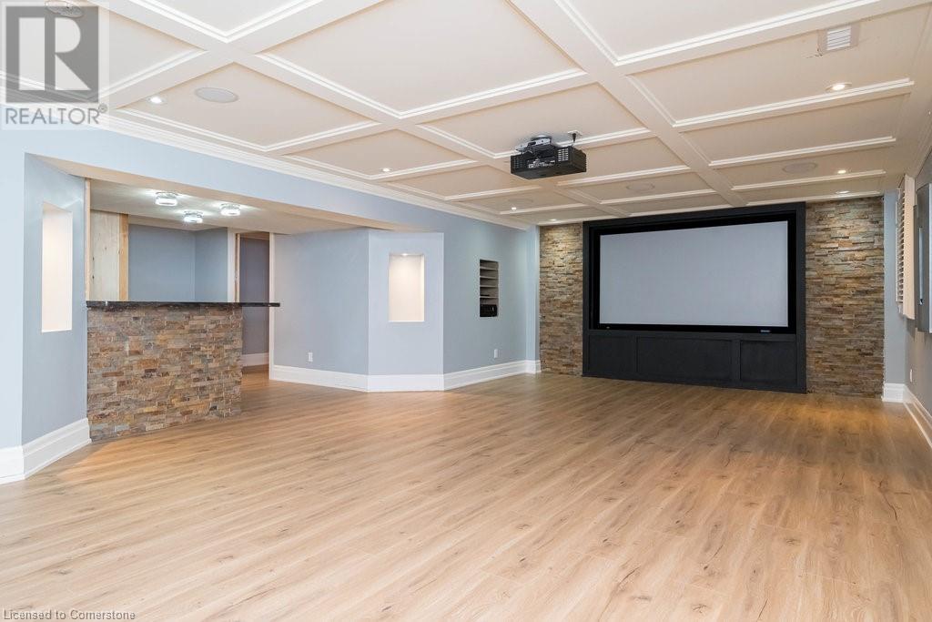 Striking curb appeal and this lovely 2 storey Brick & Stucco Home in South Meadowlands of Ancaster. Enter the welcoming foyer w/ Cathedral ceiling & 2pc Powder room. Coffered ceilings in the elegant Dining room, Quartz counters & island in the sleek Kitchen w/ breakfast area, and Family room w/ gas FP enjoys lovely views of the fenced b/yard! Perfect for Entertaining family & friends. Hardwood most areas & gorgeous staircase leads to the 2nd level w/ 4 spacious bdrms, 5 pc. Ensuite, 4 pc. bth & great closet space. Finished Lower Level w/ Home Theatre room w/ Fireplace, a dry bar, Office & 2 pc. Bthrm * w/out to the In-ground S/W Water Pool w a ZenWaterfall, concrete patio, even a bunky w/ sink & storage space * Dbl. garage w/ inside entry to main floor laundry. Concrete drive fits 4 cars. Close to schools, parks, shopping, the 403, bus & transit routes & most amenities you want in a wonderful family friendly locale! NB; Some staged room photos from previous listing, (same owners).Vacant possession 01/03/2025. (id:55009)