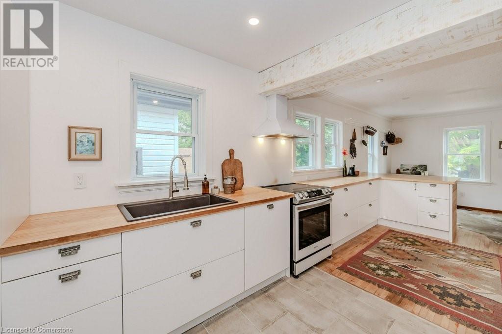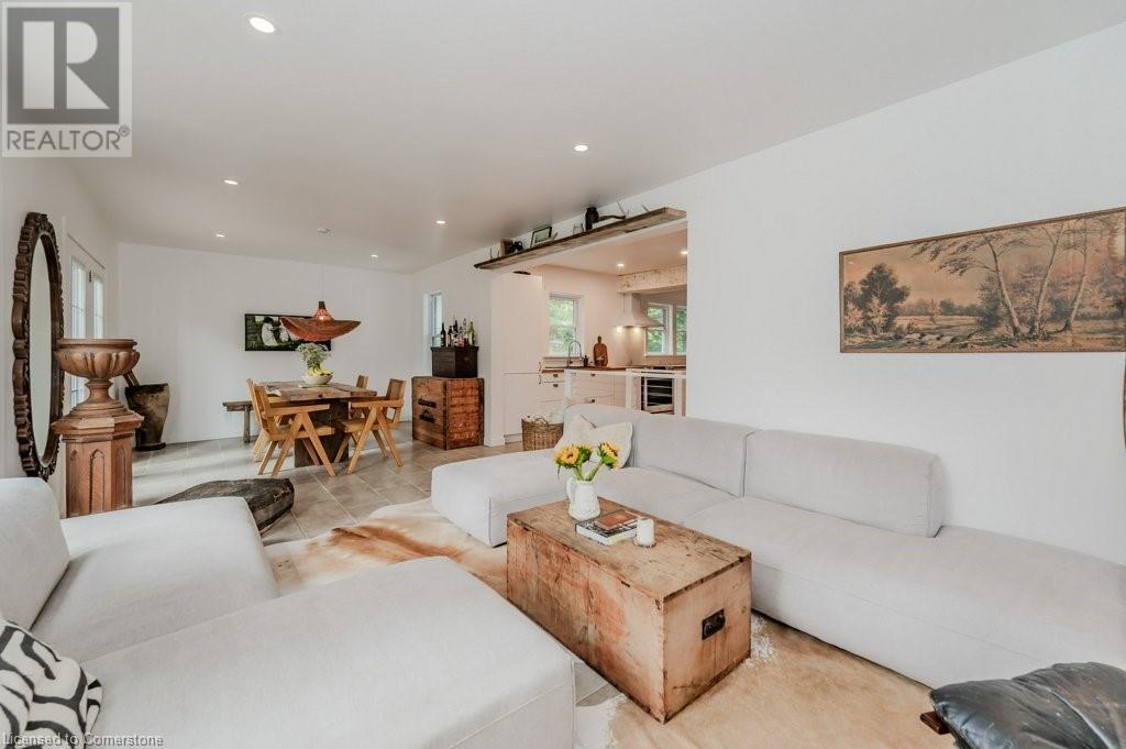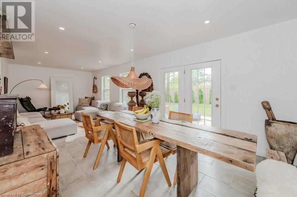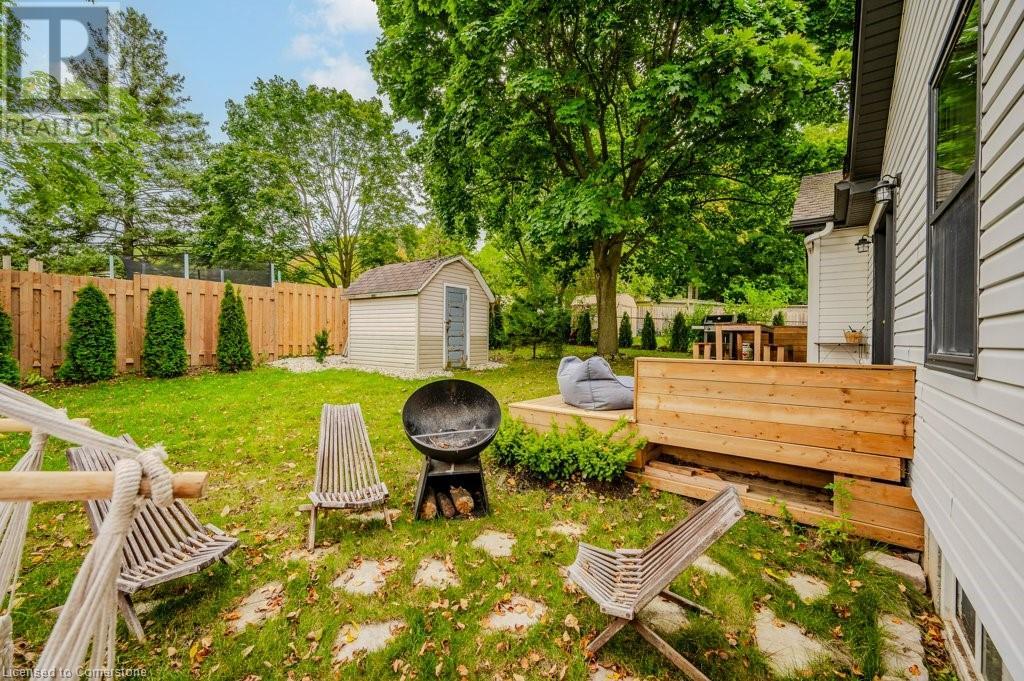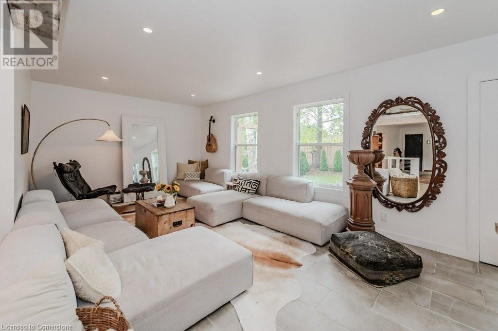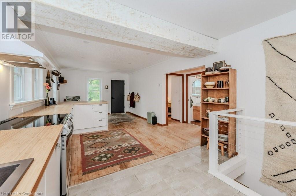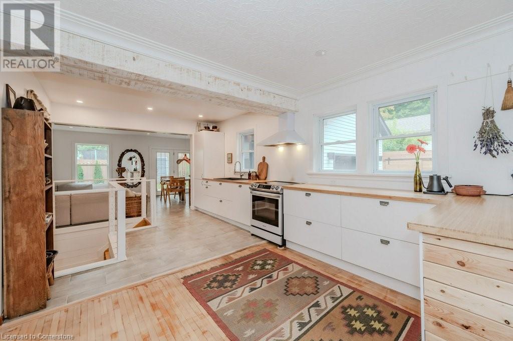 WOW!! Rustic mid-century modern and organically updated detached bungalow located on a dead-end tree-lined street with an extra wide 62’ x 115’ lot. This move-in ready home offers over 1,900 square feet of living space featuring 2+2 bedrooms and 1.5 bathrooms, with an open-concept main floor living area. The main floor is perfect for entertaining flowing seamlessly from the foyer into the bright, open-concept kitchen (new 2022), boasting bamboo countertops with breakfast bar, a chef-style sink, and built-in hidden appliances. Beyond you will find the dining area and cozy living room with a double garden door walk-out to the extensive deck. Rustic hardwood floors in the main floor bedrooms, and open stairs leading to the finished basement (2022). The lower level offers a family room with a stylish concrete floor and a handy bar area with floating built-in cabinets, a third bedroom, and a versatile flex room that can be used as a 4th bedroom, den, home office, or hobby space. A convenient 2-piece bathroom, laundry, and storage as well. The exterior showcases a newly landscaped yard, complete with new fencing, cedar bushes, front & back decks, a fun hammock chair swing structure to enjoy, and a resealed driveway for up to four cars. Also, a fully insulated oversized single-car garage (currently used as a home gym). Additional highlights include pot lights found throughout the home, carpet-free living, a newer furnace installed in 2022, an owned water softener, updated wiring, and new plumbing extending to the road. Conveniently located close to trails, parks, and schools, this home is ready for you to move in and enjoy! (id:55009)