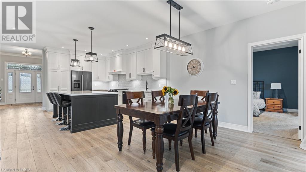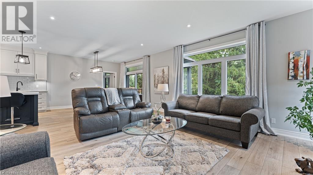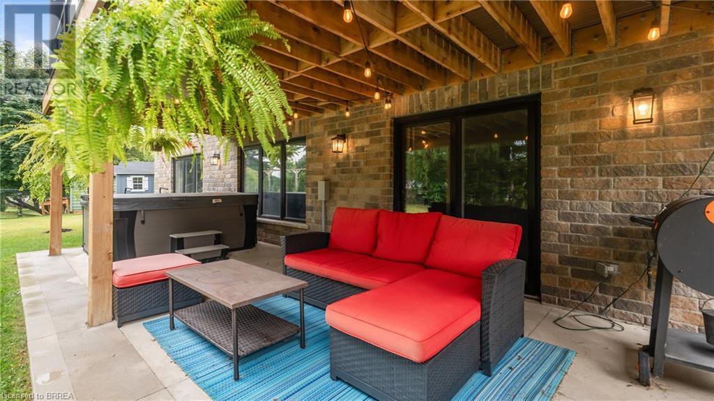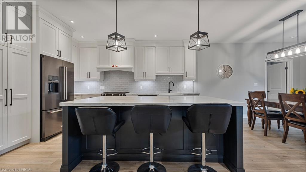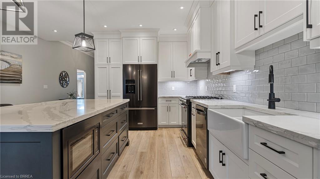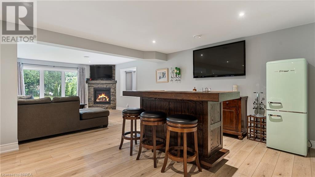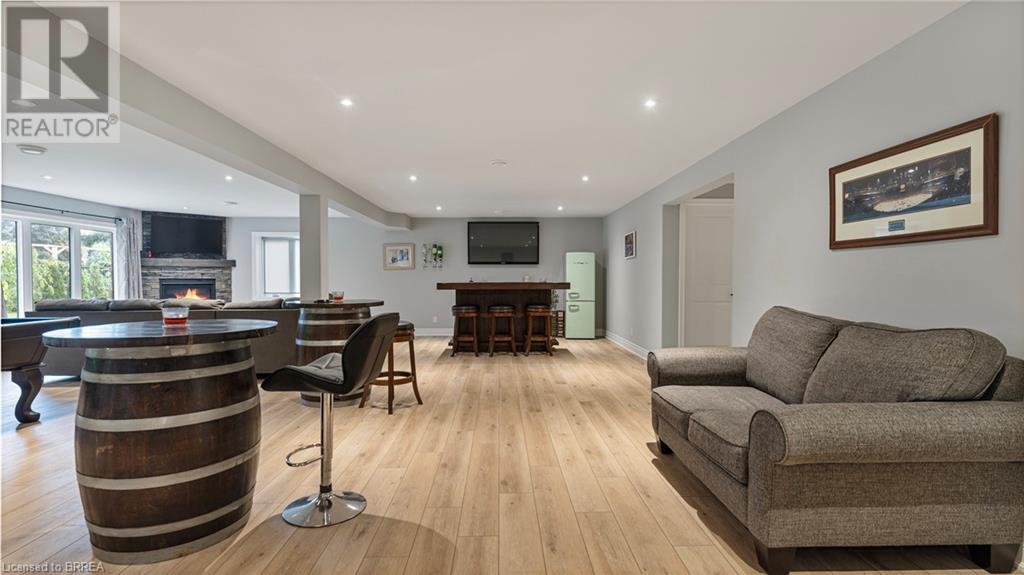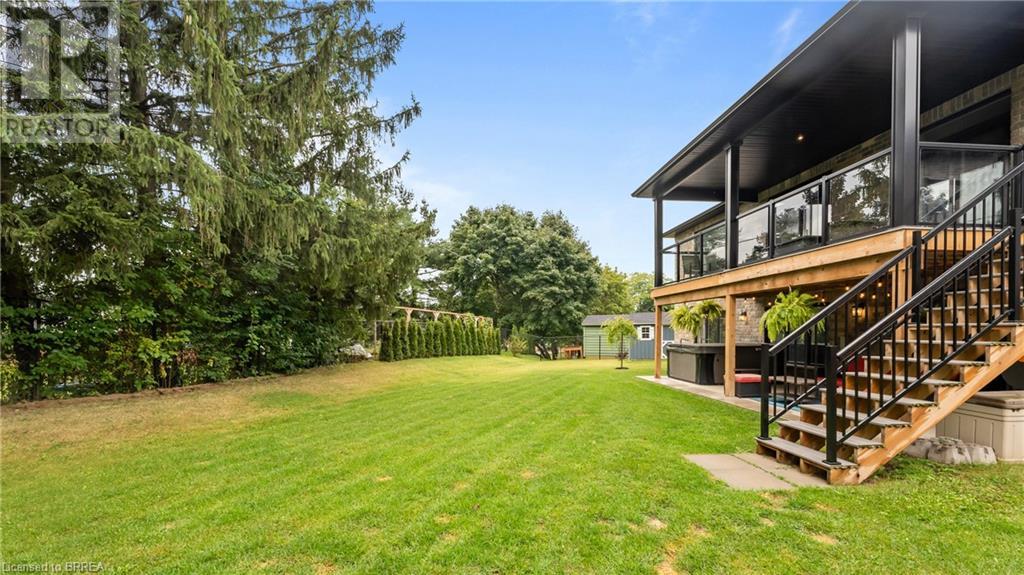 Welcome to 39 Gibbons Street in the charming village of Waterford. This beautiful executive style bungalow home is situated on a pie shaped lot with a large fully fenced backyard and boasts beautiful finishes throughout. Offering 3+1 bedrooms, 3 bathrooms, a fully finished walk-out basement. Just off the entryway is a bedroom - that could be perfect for those who want a dedicated work space not in the basement. As you make your way into the home, this beautiful open concept shows beautifully throughout. Absolutely stunning kitchen with white cabinetry, subway tiled backsplash, quartz countertops, dark stainless appliances, large island, built-in range hood and plenty of cupboard and counter space for cooking! The living room features a gorgeous floor to ceiling stone hearth with gas fireplace and built in receptacle for TV installation. An abundance of natural light and plenty of room for hosting large family gatherings. Just off the main living space is the very spacious primary bedroom with sliding patio door access to the covered deck. Featuring hotel-like amenities with large en-suite, dual sink vanity and large walk-in shower with rainfall shower head. An additional spacious bedroom is also located just down the hall as well as a 4 piece bathroom. Main floor tiled mudroom/laundry room with easy access to the garage and dual storage closets. Finished lower level is the entertainer's dream! Recessed potlighting, stone hearth with gas fireplace. Plenty of room for multi use spaces with walk-out to the backyard. This open concept lower level is perfect for a family looking for dedicated spaces for adults and kids. Also on the lower level is an additional 3 piece bathroom and bedroom. The backyard boasts a concrete pad, hot tub and plenty of green space! Plenty of room for a pool or the opportunity to transform this into your own backyard oasis. Amazing opportunity to live in a great location close to schools, parks, trails, breweries, wineries and more. (id:55009)