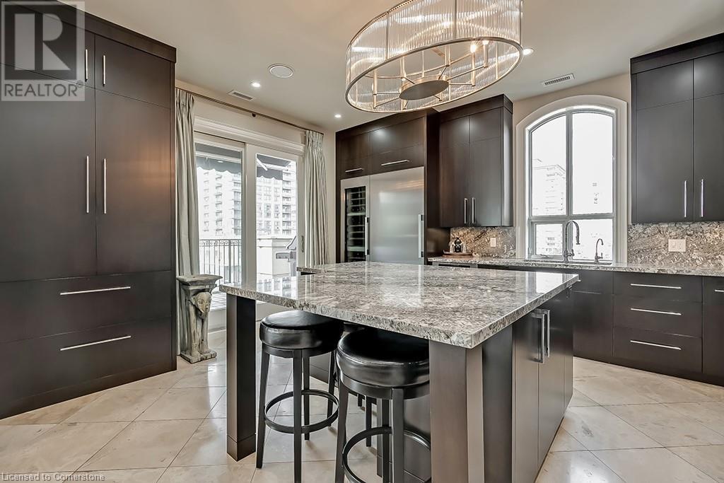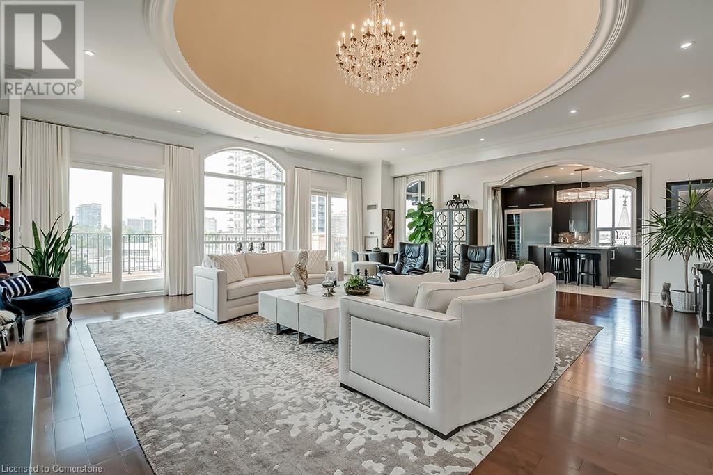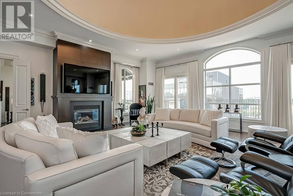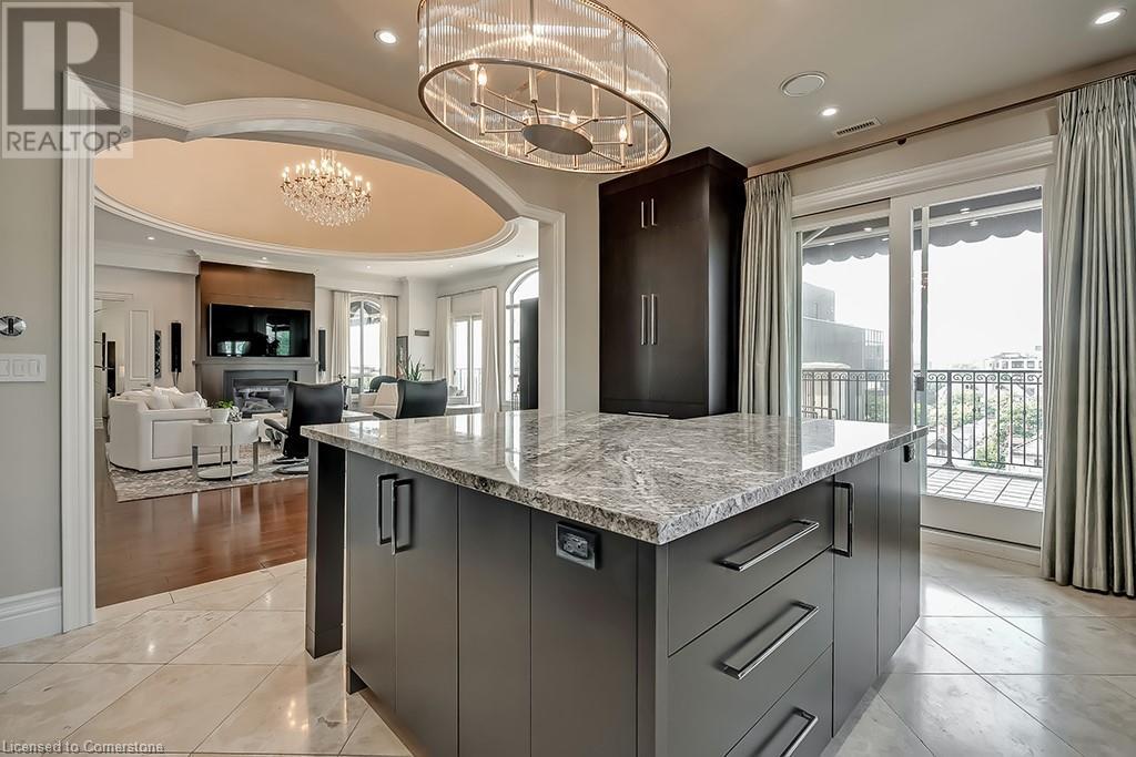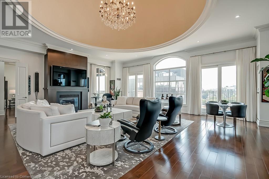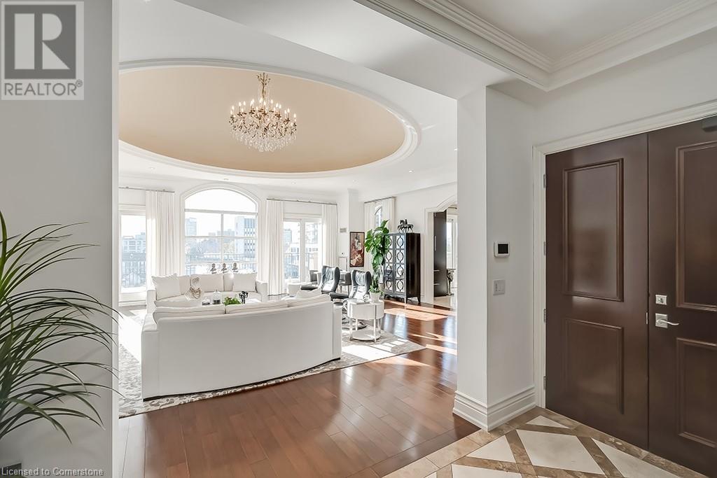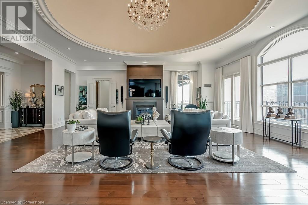 $2,512.48 MonthlyUNCOMPROMISING LUXURY PENTHOUSE - This stunning one-of-a-kind suite in downtown Burlington, is located in the private 13-suite prestigious boutique condo. The well-appointed suite features 3-bed, 2.5-bath, approx 3168 sqft with 4-private terraces with heated floors, each with views of the lake and downtown. Enter the double entry doors into the foyer with marble floors, you’re greeted by the expansive Great Room with 21ft high dome ceiling with crystal chandelier and gas fireplace. Chef inspired kitchen with built-in Miele appliances, custom cabinetry, island seating & sliding patio doors leading to terrace. Separate formal dining room with decorative ceiling detail and chandelier. The 1st bedroom features sliding patio doors to the private terrace, walk-in closet and 2pc ensuite. Down the hall is the 2nd bedroom, laundry room & gorgeous 4pc bathroom with soaker tub. The primary bedroom is a sanctuary featuring his and her walk-in closets with custom built-ins, spa inspired bathroom with large shower, separate water closet, lounge area and walkout to a private terrace. This suite is flooded with natural light, featuring 11ft ceilings, hardwood and marble flooring and integrated Bang & Olufsen sound system. 2 underground parking spaces & locker. The perfect alternative to the large luxury home, ideal for those downsizing. Steps to fine dining, shops, Performing Arts Centre, Spencer Smith Waterfront Park, fitness, hospital QEW, 403, 407 and GO. *Dogs not permitted. (id:55009)