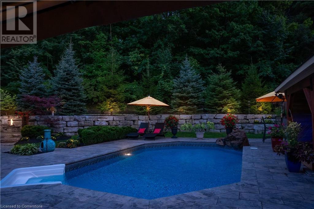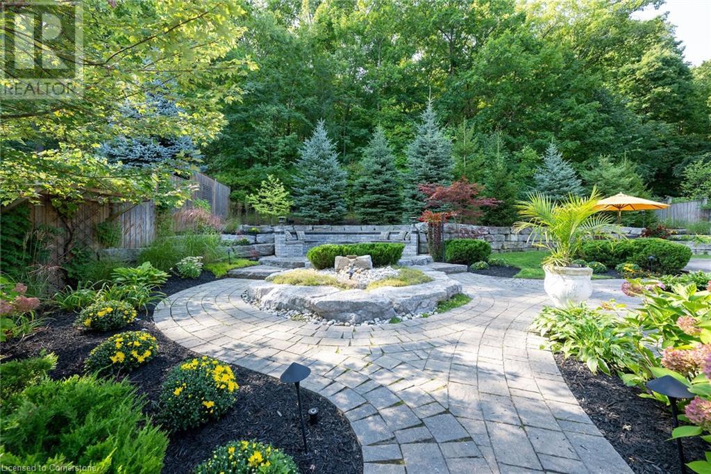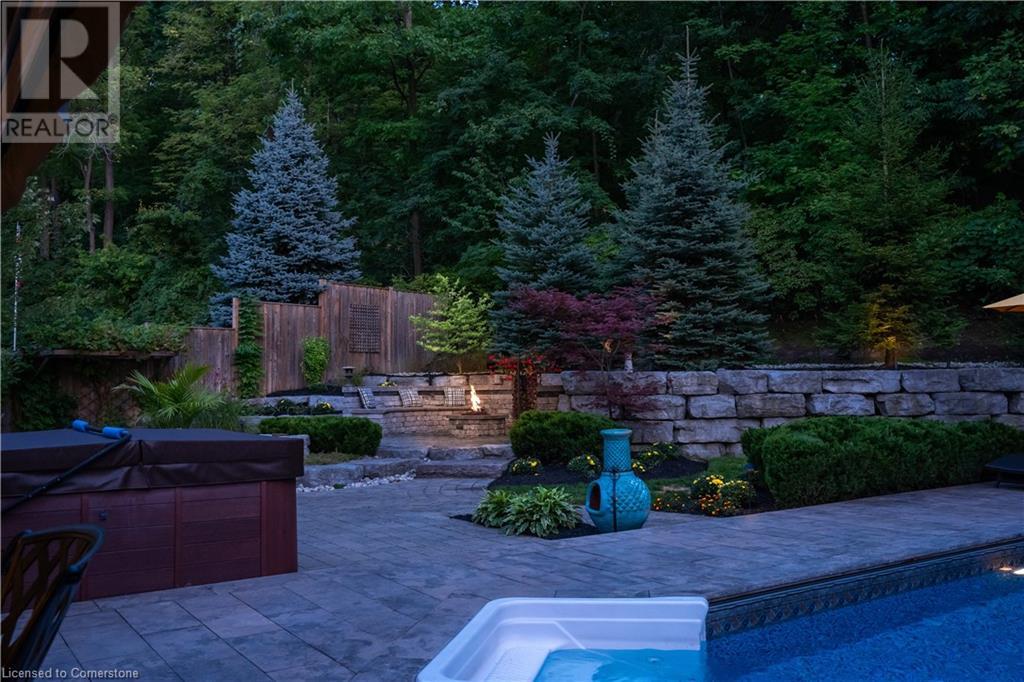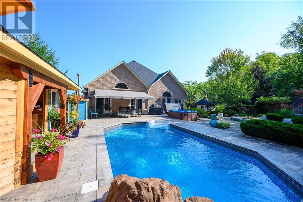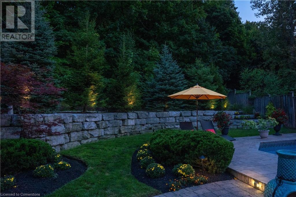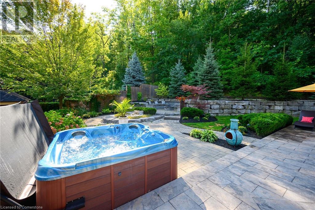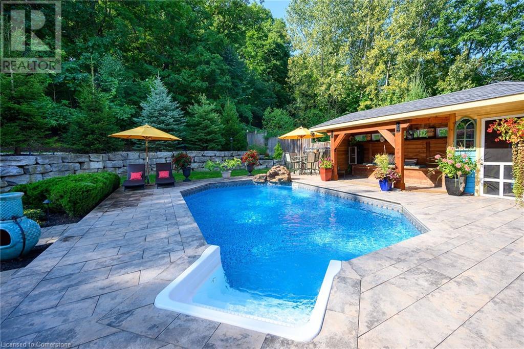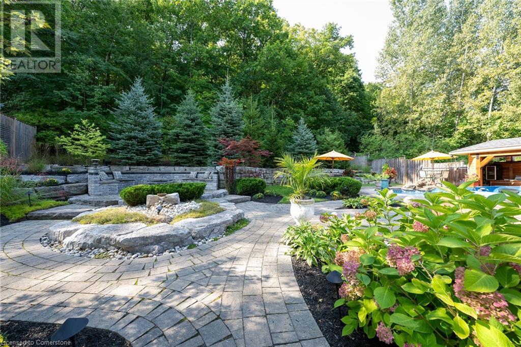 MAGNIFICENT, CUSTOM-BUILT 4 BEDROOM HOME with 4140 SQFT of beautifully finished living space with in-law accommodation or nanny suite w/separate entrance. Located on large pie-shaped property backing onto picturesque woodlands & Bruce Trail. Situated on prestigious cul-de-sac and park among other luxury homes. Complete with manicured grounds and backyard oasis fit for royalty! Inground saltwater pool w\waterfall, pool cabana & change house, hot tub, expansive stone patios, outdoor gas fireplace surrounded by built-in seating. Featuring gourmet kitchen w/top-of-the-line appliances, abundant cabinetry, granite counters & stainless steel backsplash. Family room open to kitchen w/soaring vaulted ceiling, skylights & 2 double French doors to breathtaking backyard. Stately dining room off kitchen, spacious primary bedroom w/glass doors leading to patio, gas fireplace, rain-sensing skylights, 2 walk-in closets & spa-like ensuite bath. Open staircase to ground level in-law suite & ensuite privilege bath, 2nd family room & kitchenette, exercise room, craft room, laundry room & workshop. 2.5 car garage w/large storage loft. OTHER FEATURES: SS appliances, Wolfe gas stovetop, 2 built-in wine fridges, c/air, c/vac, washer/dryer (new 2023), custom window blinds, sprinkler system & dramatic outdoor lighting, 2 gas & 2 electric fireplaces, built-in water fountain. New roof shingles '22, new furnace '20, new pool liner '23, 200 amp service, 3.5 baths. Long stamped concrete driveway for 6 cars. 5 mins to QEW, fine dining & vineyards. This property is a dream come true!' (id:55009)