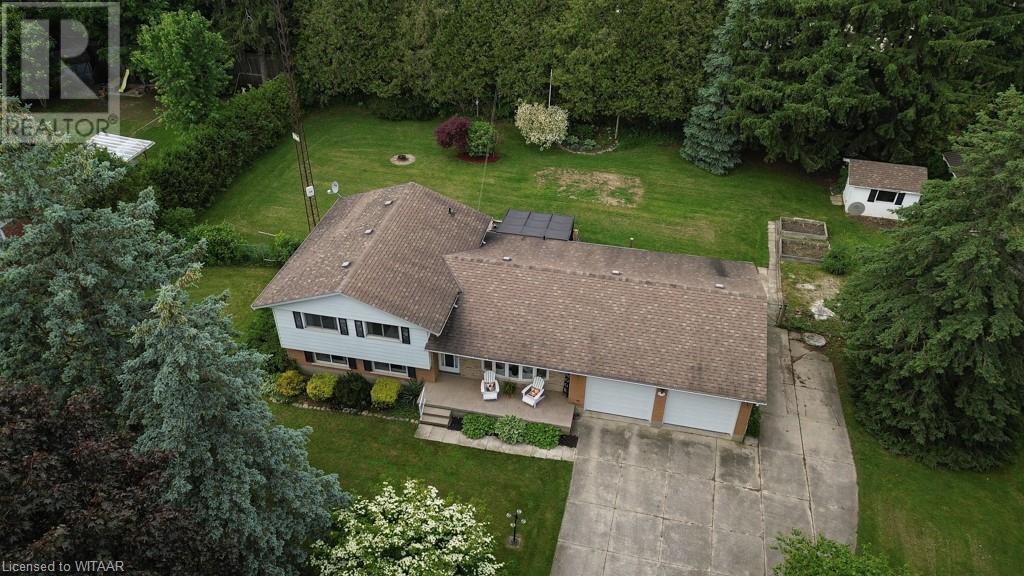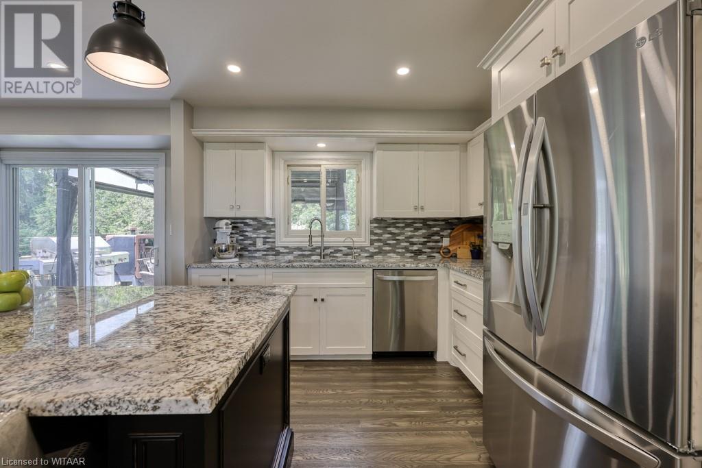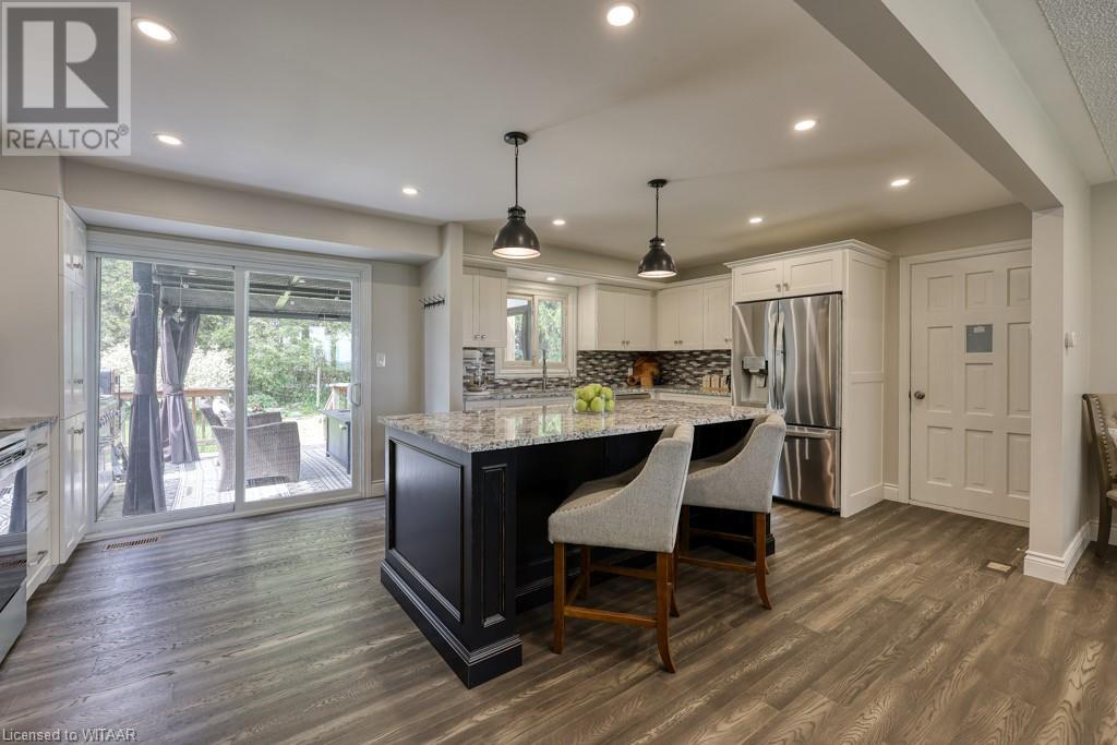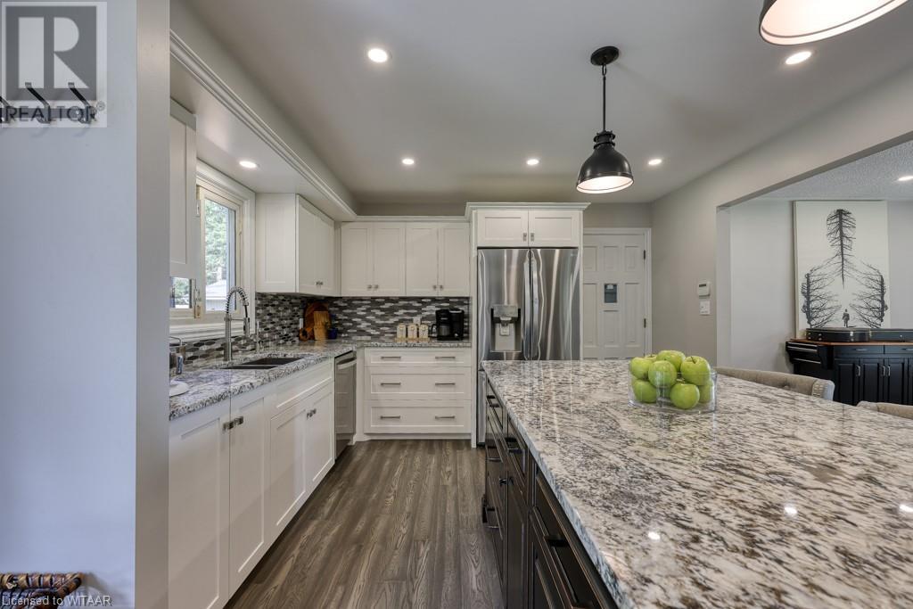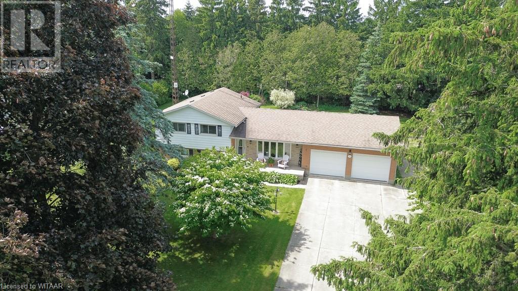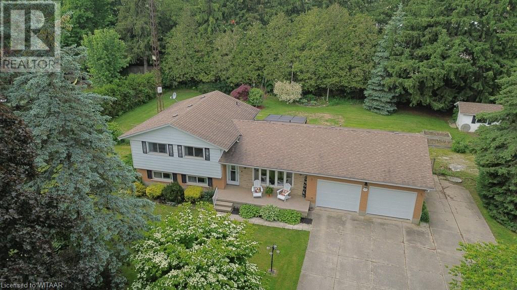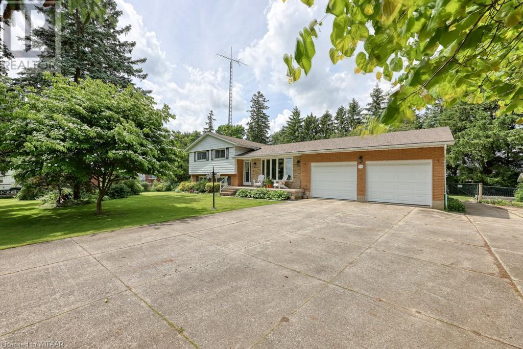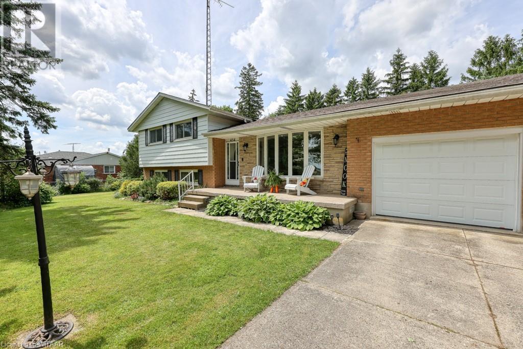 Peaceful half acre property with panoramic views! A scenic seldom traveled, tree-lined street on the edge of town leads to this serene setting & pristine 3+1 bedroom, 2 bath side split with over sized 2 car garage. Here, you’re still connected to all amenities. Mere minutes to 401 with the added bonus of privacy, a lush rural vibe & a ‘no exit’ road. Take it all in as you pull into the triple wide concrete drive. Put your feet up, relax on the sprawling porch and get a feel for the tranquility. Stepping inside, you’ll be wowed by the bright & open remodeled main floor and simply stunning kitchen! Natural light streams in & engineered hardwood flows cohesively. Crisp white cabinets contrast impeccably with the deep dark 7' island & gorgeous granite counters, SS appliances, stylish back-splash. All this accented by perfect lighting! Newer patio doors open to the back-yard & deck with gazebo. Hardwood continues into the upper where you’ll find 3 spacious bedrooms with new carpet (2024)! The primary fits a king-size bed & has double closets. Spacious, sparkling & spotless 4-pce bathroom. You’ll love the versatility of the lower level! Here, a 4th bedroom easily works as a home office or children’s playroom. Modern, spacious 2-pce bath. The sun-filled, family room is THE space to hang out! Unfinished 4th level holds huge potential for a rec/games rm & features a walk-up to the garage. What about this expansive, private & fully fenced backyard? Unwind in the newer hot tub under starlit skies, there’s room for the shop or pool of your dreams here. Handy storage shed. Lots of parking for 8+ with space for RV’s. Indulge your hobbies in the 22 x 25' insulated garage, newer overhead doors, 220 with direct access to the kitchen & basement. Notables: 6 LG appliances (2020) & dining set included, some newer windows, no rentals! Does this exceptional value & amazing location sound appealing? Don't miss out—make this enviable country-like property at 454 Haines Street your own! (id:55009)