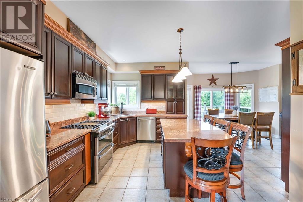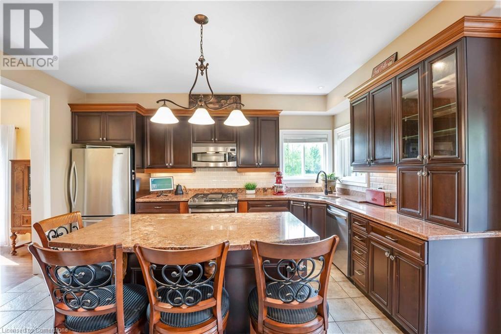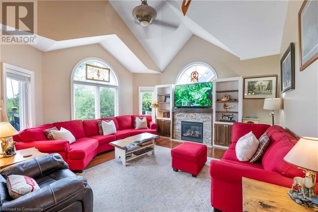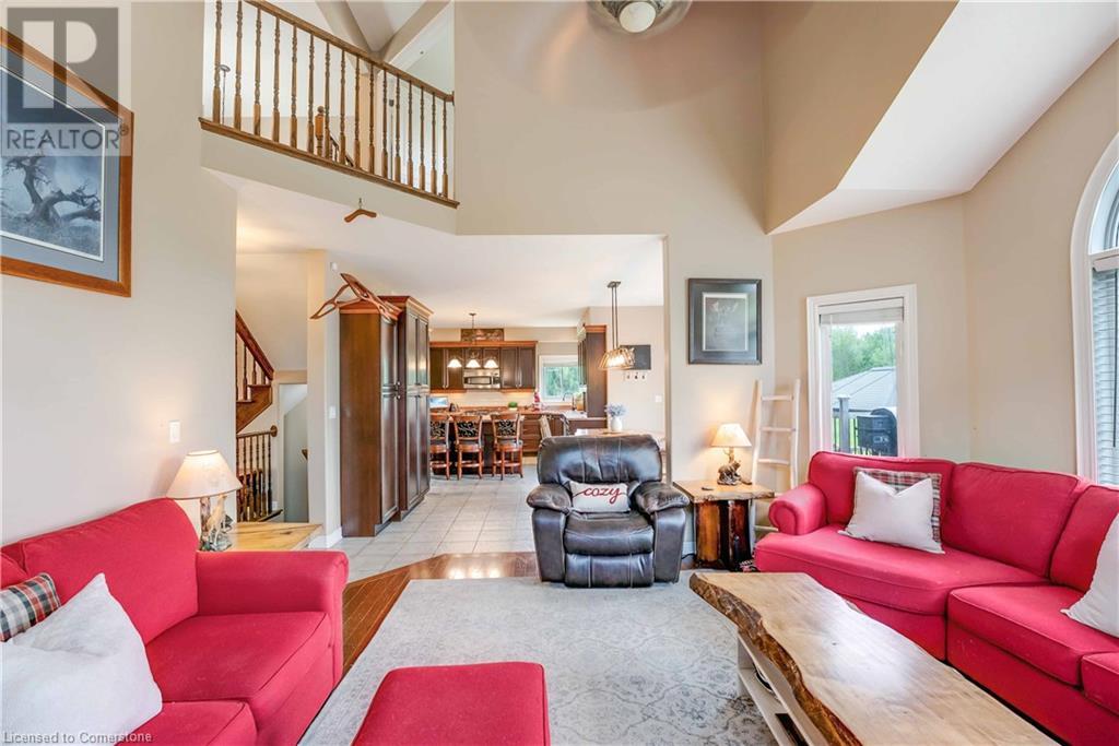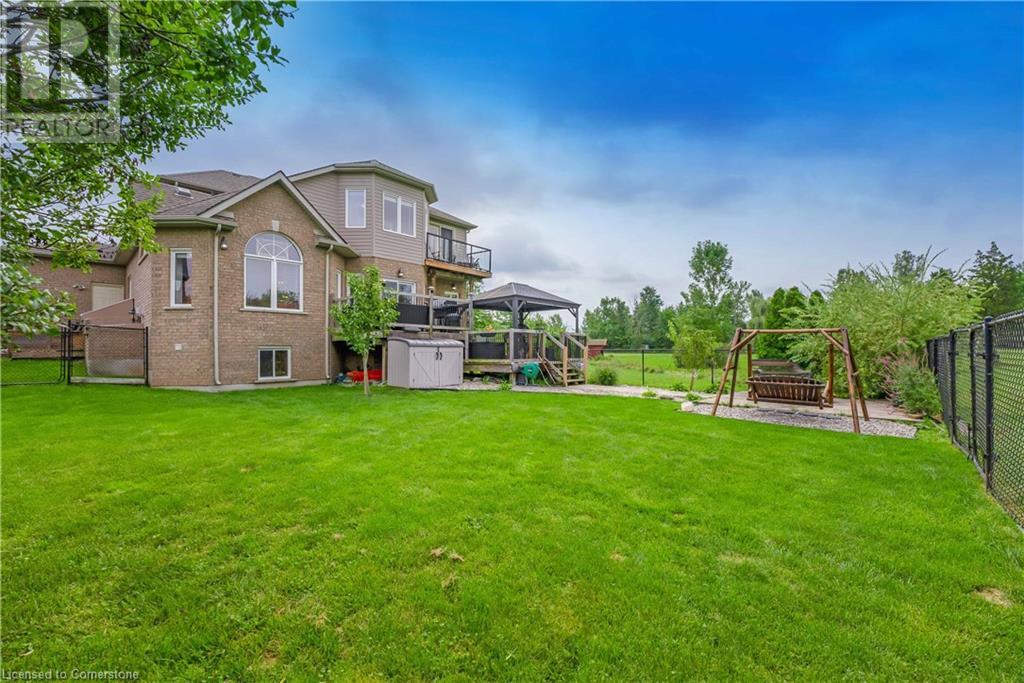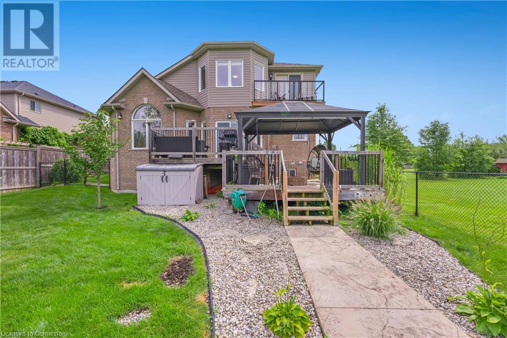 Welcome to this fabulous 2-family home tucked away at the end of a cul-de-sac in a quiet community surrounded by nature. This stunning builders model home has 5 bedrooms 4 bathrooms, with executive comforts and sophisticated upgrades in over 3,900 sq ft of finished living space. Well maintained with 9 foot ceilings on the main floor, and upgraded this home has a cottage retreat feeling. Armed alarm system by Telus,Furnace (2023) and A/C and on demand hot water heater are owned.The grand foyer, open to the dining/living for holiday gatherings. A gourmet kitchen with granite, awaits your culinary skills with an island with seating, equipped with high-end appliances GE Profile gas stove (2023) dishwasher (2024 .The Spacious great room with cathedral ceilings has pastoral views. Natural gas firplace here and in the inlaw suite.. Multi-tiered deck with gazebo and gas fire pit. Escape up the solid wood stairs to an open view of the Great room below. Enter the Primary Bedroom suite through double doors, where serene tree views relax you. Open the garden doors to fresh air and your own private balcony new in 2023. Escape to your en-suite spa bathroom with a soaker tub, separate shower, double sink vanity, granite, and its own front loading washer and dryer. The walk-in closet is spacious. There are 2 more bedrooms upstairs that share a divine 4 piece bathroom with double vanity. The Inlaw suite downstairs has a den and 2 bedrooms, full kitchen with 6 appliances, bathroom w shower. (id:55009)