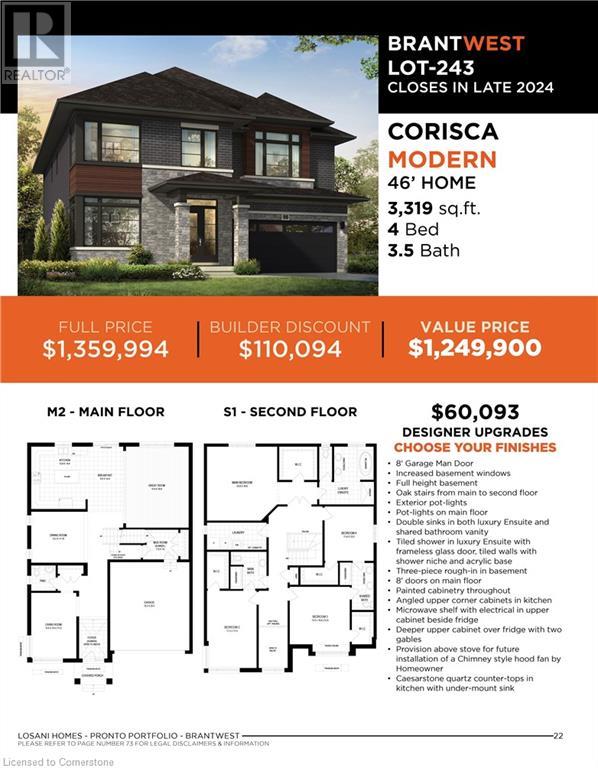 Beautiful executive 4 bed, 3.5 bathroom, 3319 sqft Corsica Modern to be built by Losani Homes in sought after Brant West. Choose your own finishes with the help of our designers. Main floor boasts stunning high ceiling entrance, 8' doors, huge windows for maximum natural light, a living room perfectly situated to be used as a home office where you can meet with clients, separate formal dinning area for entertaining, large great room, breakfast with sliders to rear yard and kitchen with angled upper corner cabinets, quartz countertops, island and microwave shelf. Oak stairs from main to second floor. Main bedroom features luxury ensuite with double sink, soaker tub, tiled shower with frameless glass door. Bed 3 and 4 enjoy a shared bathroom with double sink. Bed 2 has cheater door to main bathroom. Convenient second floor laundry. Increased basement windows, in full height basement and 3pc basement rough-in. Close to walking trails, schools and shopping. Closing late 2024. (id:55009)