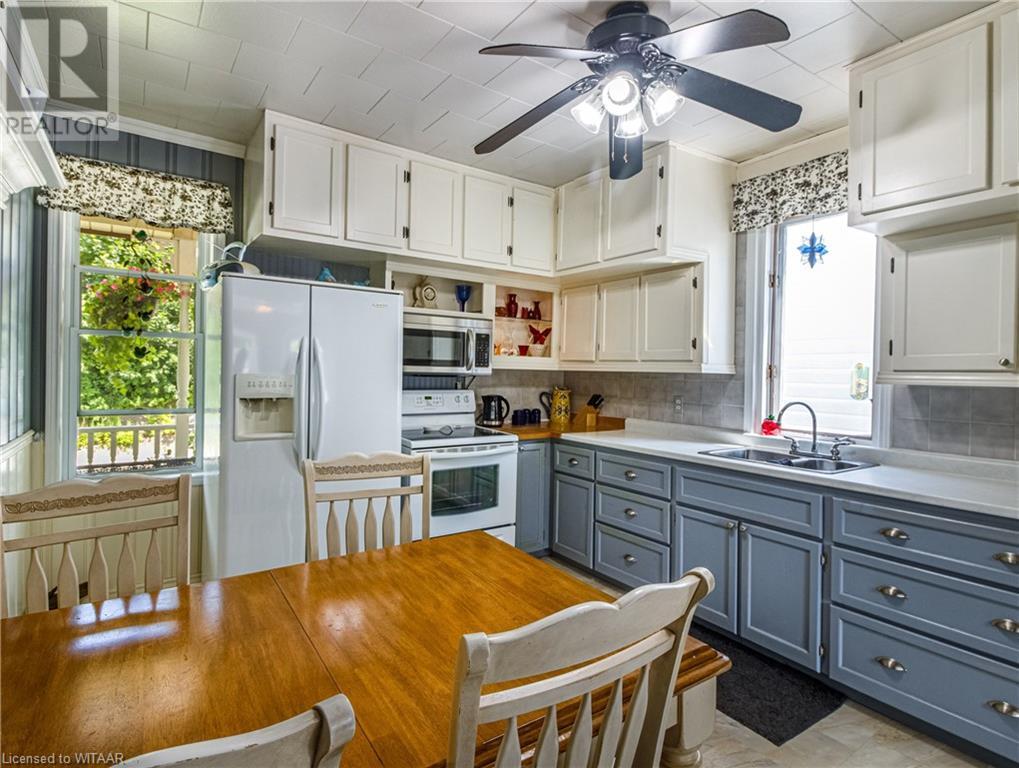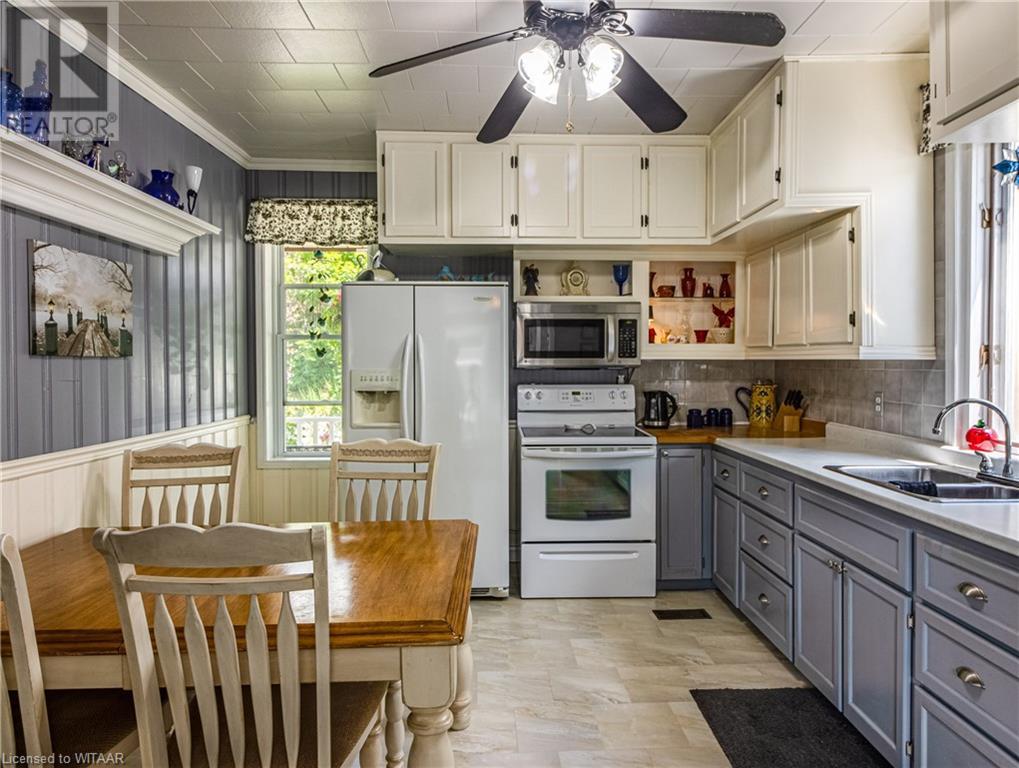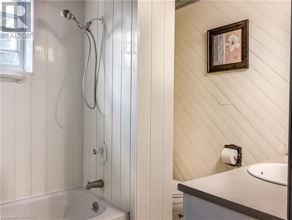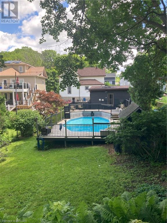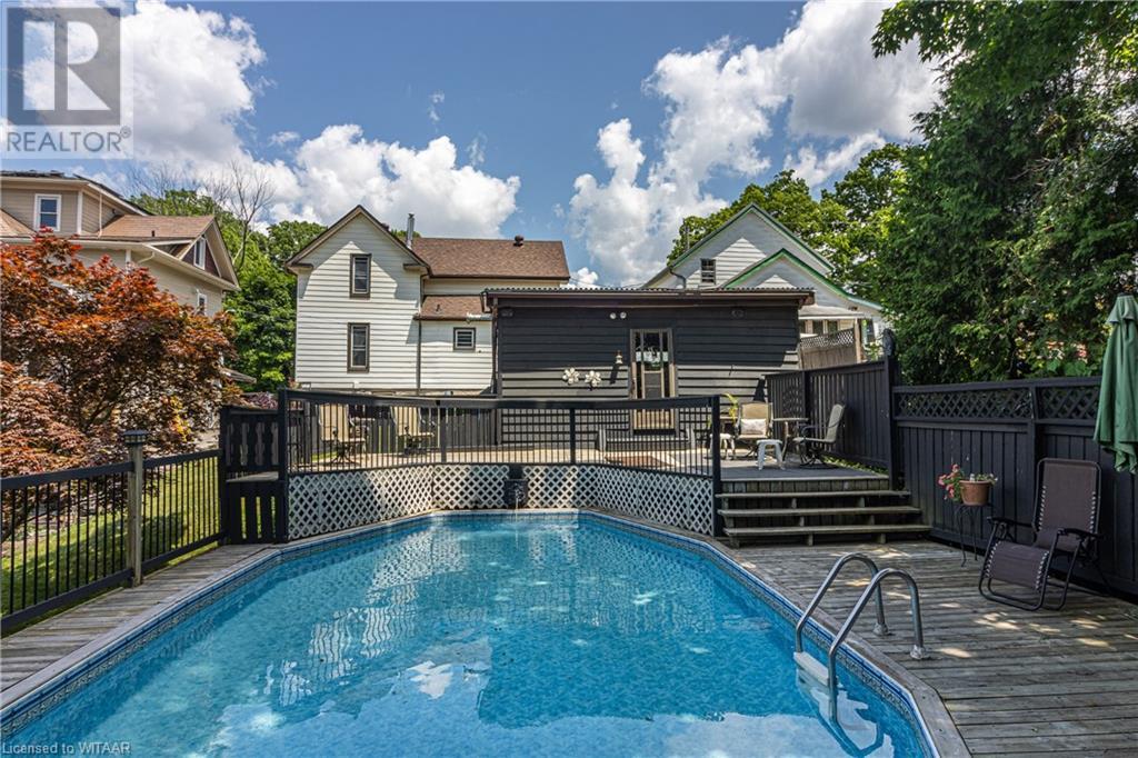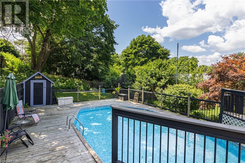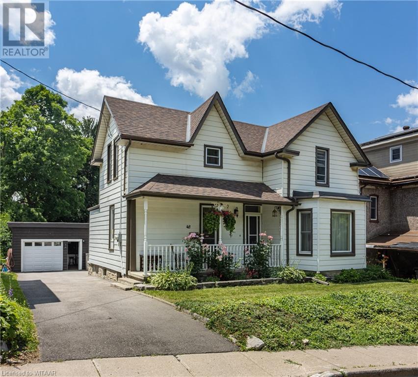 Welcome to 48 Harvey Street in desirable Hespeler. Sitting on a deep lot, this home offers something for every buyer – three bedrooms with walk in closets, a double garage for parking and hobbies, and a heated swimming pool! Walking from the covered porch and through the front door with classic transom window, be drawn into the charming comfort of the foyer with a beautiful wooden staircase. To the right of the foyer, you will find a very large living room with a stone fireplace and large bay window. To the left you will find a beautifully updated eat-in kitchen with two-tone cabinets and plenty of counter space. The main floor is rounded out by a 4-piece bathroom and large mudroom with an exit to the backyard. Upstairs is a large, bright primary bedroom with a walk-in closet, and two additional good-sized bedrooms with a jack-and-jill walk- in closet. This is all painted in warm neutrals and ready for you to make it your own. Don’t overlook the charming built-in cabinet on the landing! The basement provides a laundry area, plenty of storage, and a walk-up to the backyard. Outside, the extra long driveway with plenty of parking leads to a heated double garage – currently used as a home shop with work bench and for single vehicle parking. A rear door leads to the enclosed heated pool area. Dual level decks provide space for entertaining beneath the mature shade trees. There is also plenty of grassy space outside of the pool area in the landscaped backyard. Walking distance to parks and the lovely Speed River waterfront. This home is move-in-ready, don’t miss it! (id:55009)