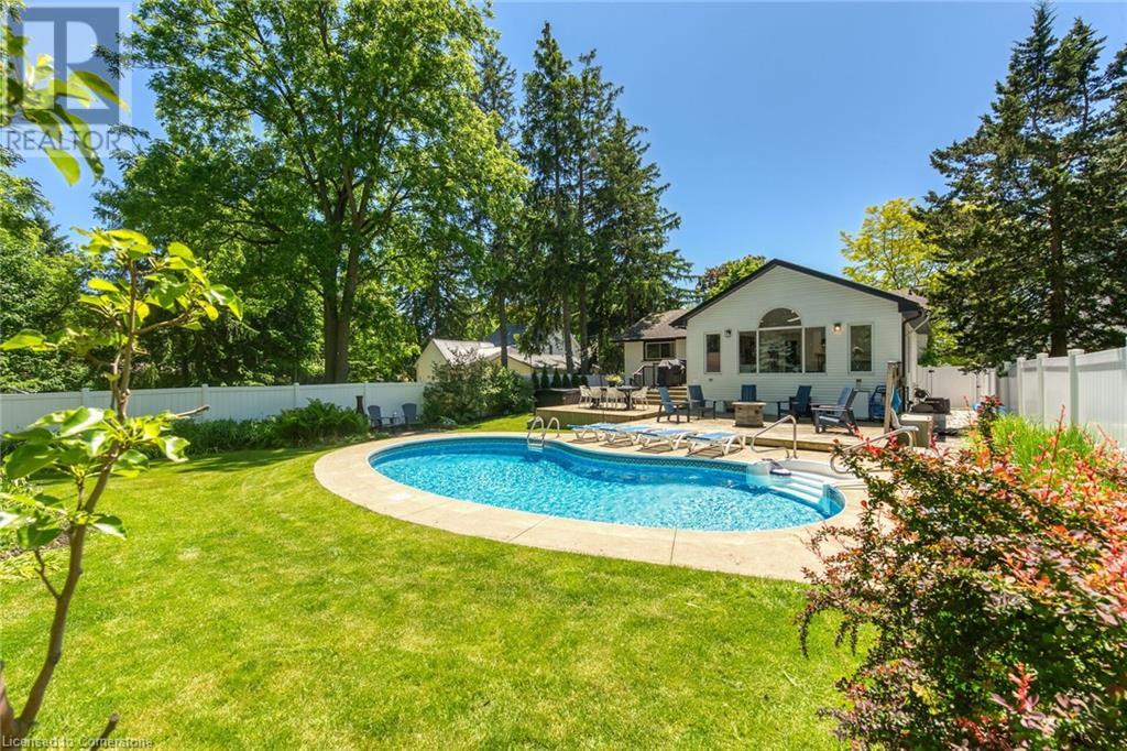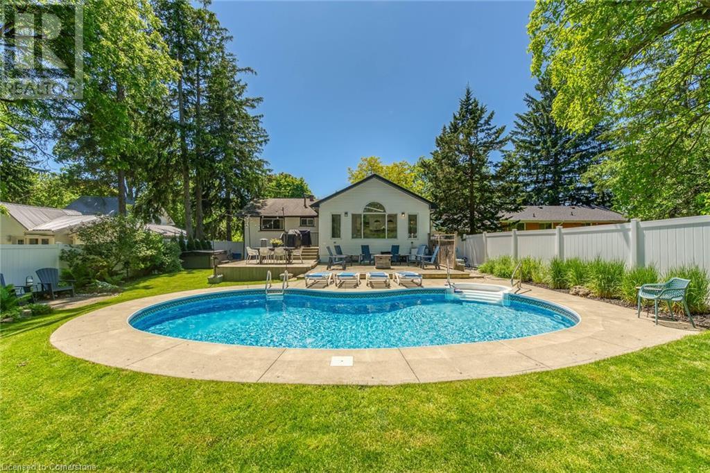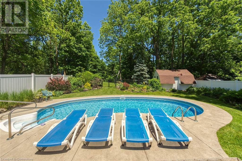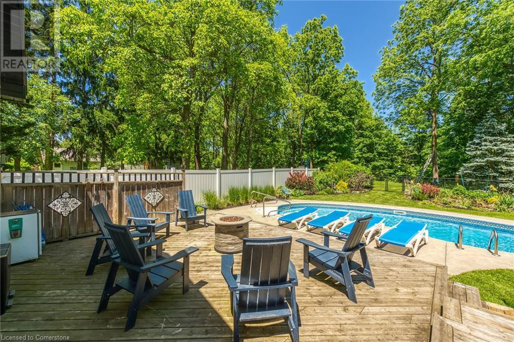 Newly renovated home on spectacular private fenced L-shaped lot. Inground heated salt water kidney shaped pool approx 14'x 30', w new heater, cement surround walkway & extensive decking. Beautifully landscaped w many shrubs, mature trees & perennials. Hip-style shed w lots of room for storage. New kitchen & appliances, new flooring throughout both levels, new vanity in bsmt bath, new skylights w high celings and sky views, new white privacy fence, all completed in 2023. Professionally painted exterior of home & shed, new furnace, new white barn style door, all completed in 2022. In-law suite potential in bsmt w kit, 3 bdrms, new roller blinds, 3pce bath w walk-in shower & private front & back entrance. 3 bdrms on main level & ensuite privilege bath. Cozy family rooms both with wood burning fireplaces. Sellers related to salesperson. (id:55009)