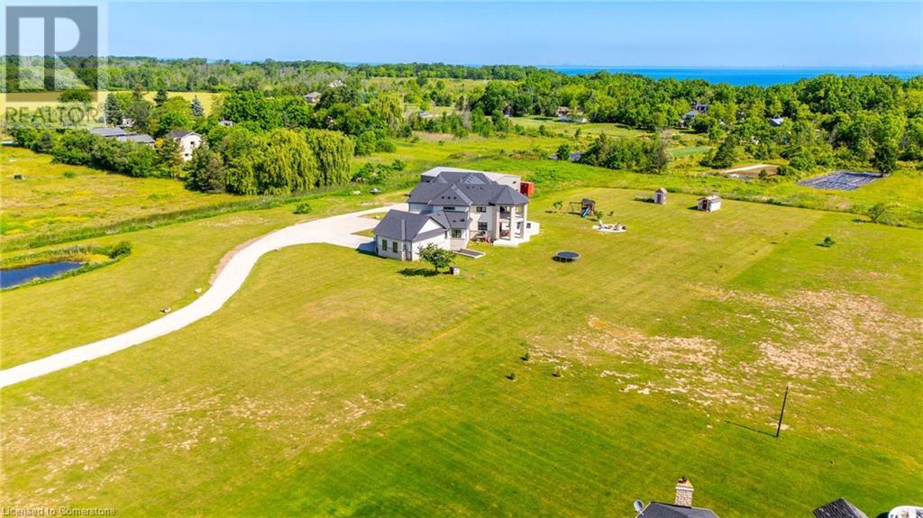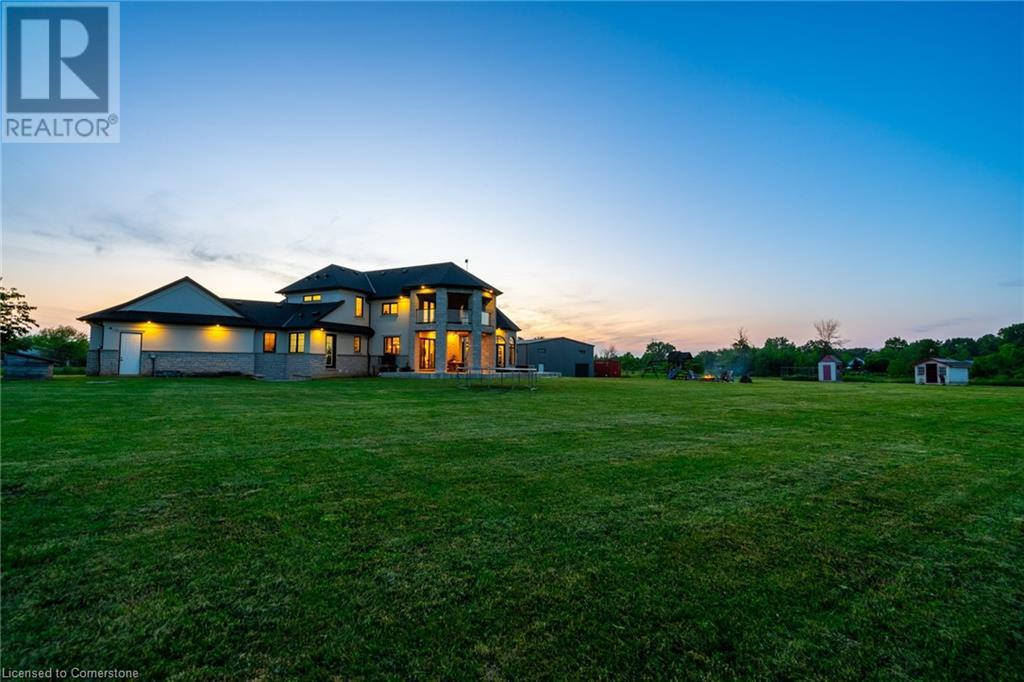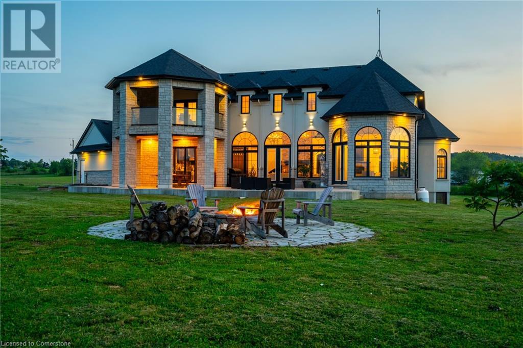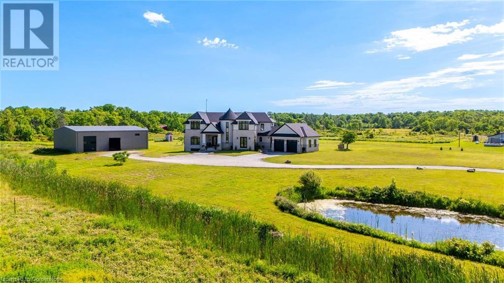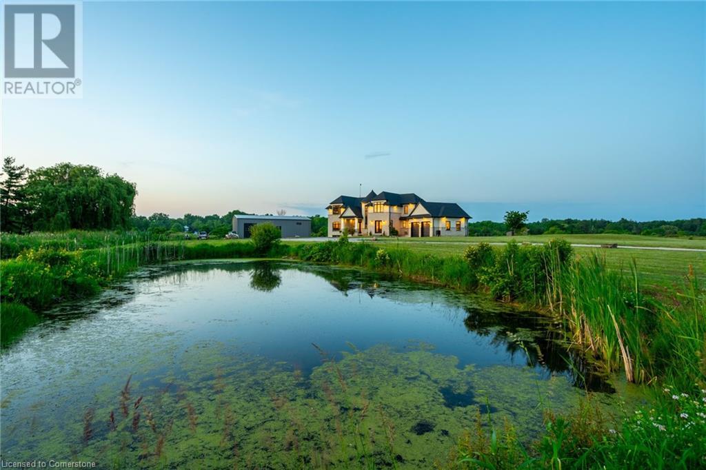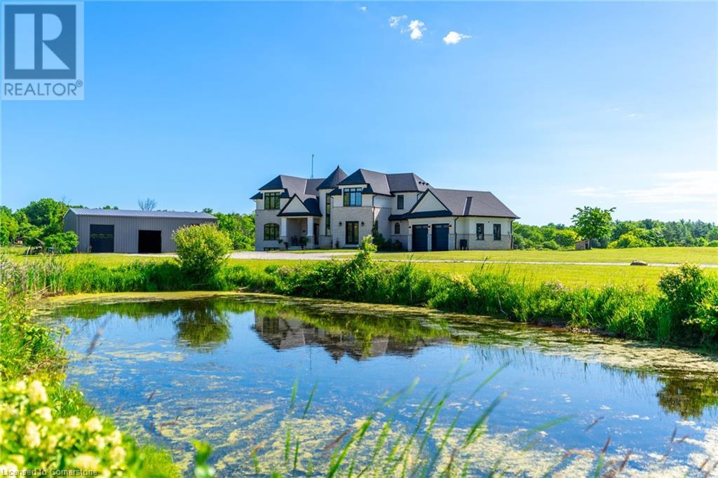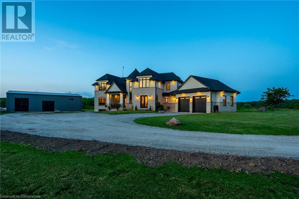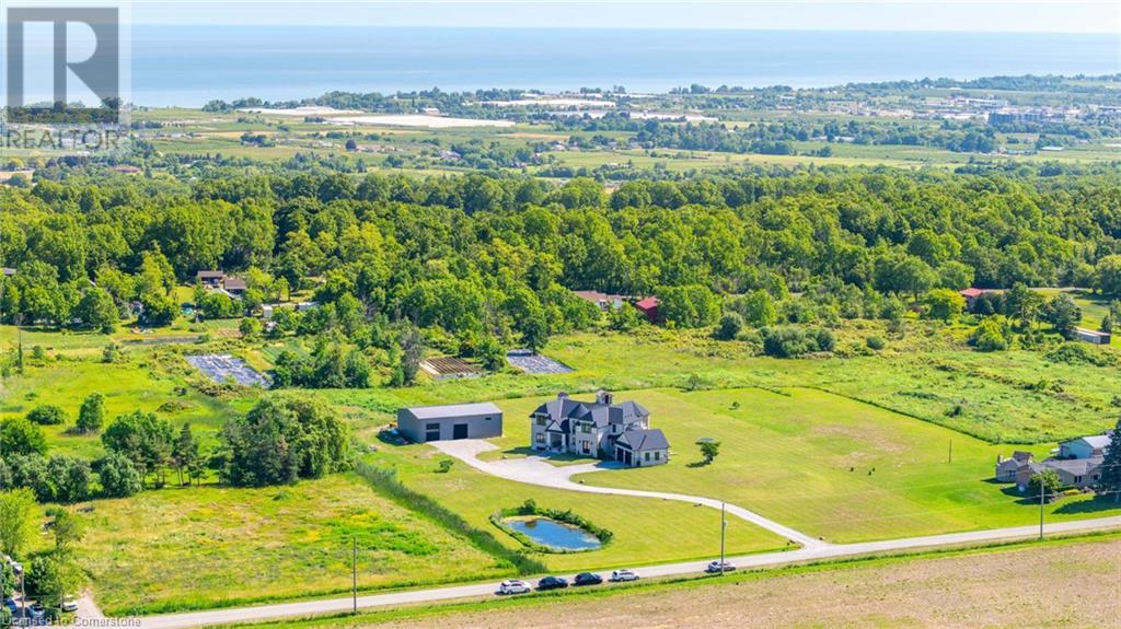 Welcome to your idyllic retreat at this stunning 10-acre property conveniently located just 4 minutes from the QEW highway making country living easier then ever! Outdoor enthusiasts will appreciate being just a 5-minute walk from the Bruce Trail and having award-winning wineries less than a kilometer away. The 2400 sqft insulated steel outbuilding with hydro provides ample space for recreational vehicle storage or hobbies. Walking in you'll be in awe of the two storey living room with stunning windows that flood the main floor with natural light and the impressive stone fireplace draws your eye up to the open second level. Indulge in the main level principal suite featuring a dressing room and ensuite with luxurious marble floors while upstairs, the 4 bedrooms share a remarkable 9-piece bathroom complete with 2 showers, 2 water closets, and 2 double vanities, ideal for large families or guests. A concrete balcony off the bedroom boasts expansive views of the picturesque surroundings. Enjoy the convenience of a geothermal heating system with 3-zone temperature control, ensuring comfort and efficiency year-round. The unspoiled lower level with a walk-up entrance is roughed in for a kitchen, 5-piece bathroom, laundry, and a 2-piece powder room, offering endless possibilities for customization. This property seamlessly blends luxury, functionality, and natural beauty, offering a serene retreat with modern conveniences and endless potential for your dream lifestyle. (id:55009)