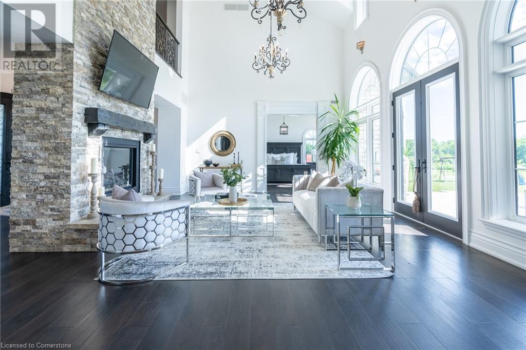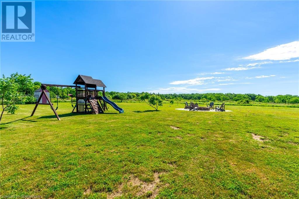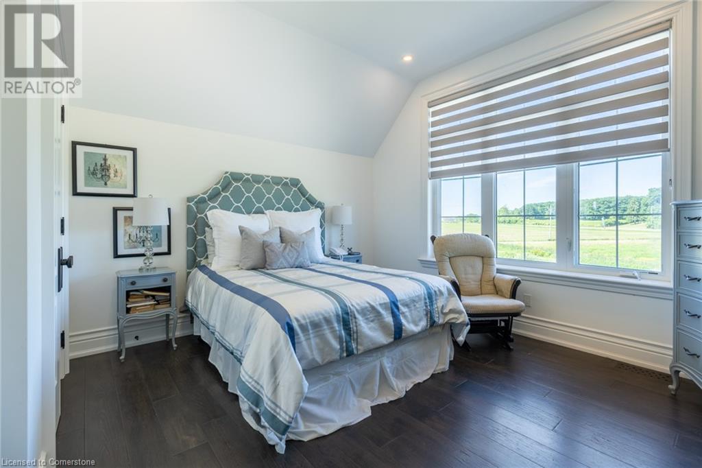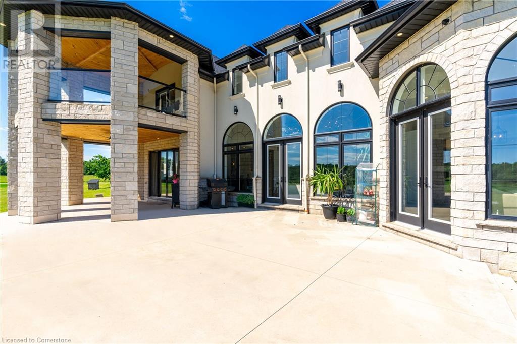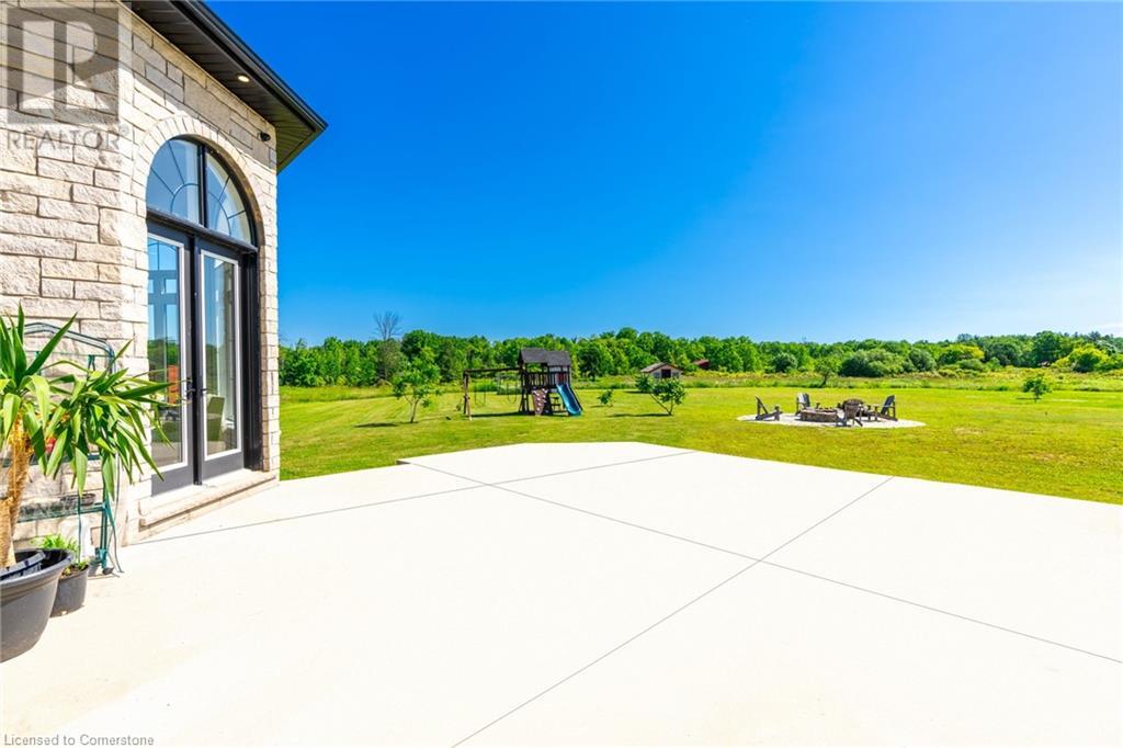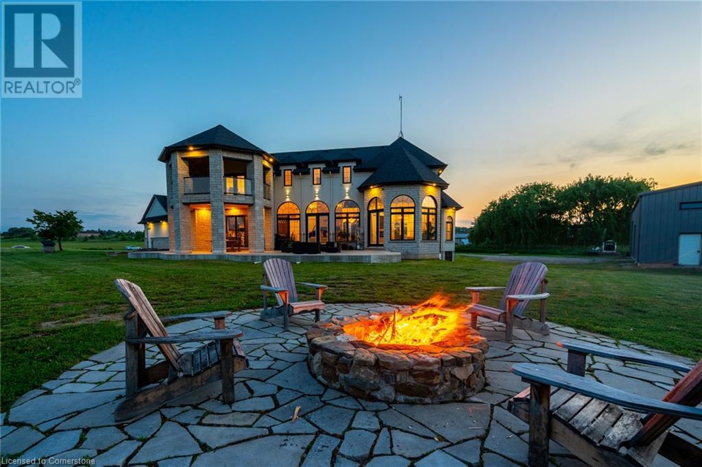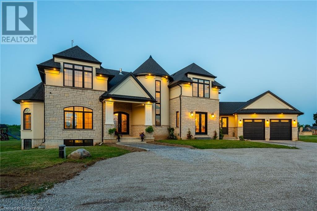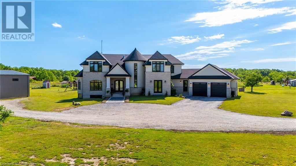 Welcome to your idyllic retreat at this stunning 10-acre property conveniently located just 4 minutes from the QEW highway making country living easier then ever! Outdoor enthusiasts will appreciate being just a 5-minute walk from the Bruce Trail and having award-winning wineries less than a kilometer away. The 2400 sqft insulated steel outbuilding with hydro provides ample space for recreational vehicle storage or hobbies. Walking in you'll be in awe of the two storey living room with stunning windows that flood the main floor with natural light and the impressive stone fireplace draws your eye up to the open second level. Indulge in the main level principal suite featuring a dressing room and ensuite with luxurious marble floors while upstairs, the 4 bedrooms share a remarkable 9-piece bathroom complete with 2 showers, 2 water closets, and 2 double vanities, ideal for large families or guests. A concrete balcony off the bedroom boasts expansive views of the picturesque surroundings. Enjoy the convenience of a geothermal heating system with 3-zone temperature control, ensuring comfort and efficiency year-round. The unspoiled lower level with a walk-up entrance is roughed in for a kitchen, 5-piece bathroom, laundry, and a 2-piece powder room, offering endless possibilities for customization. This property seamlessly blends luxury, functionality, and natural beauty, offering a serene retreat with modern conveniences and endless potential for your dream lifestyle. (id:55009)