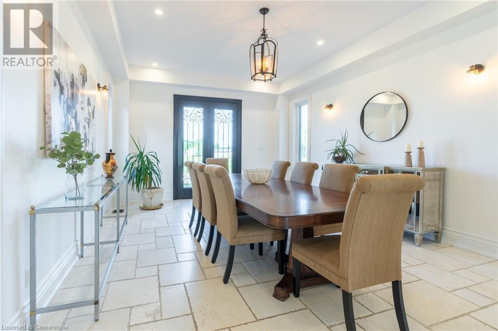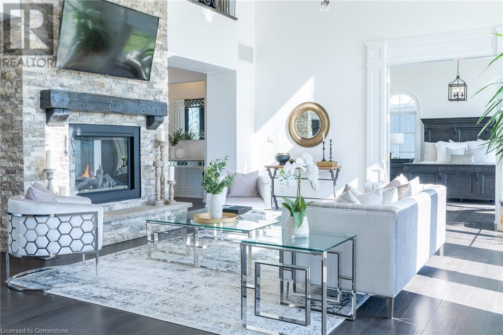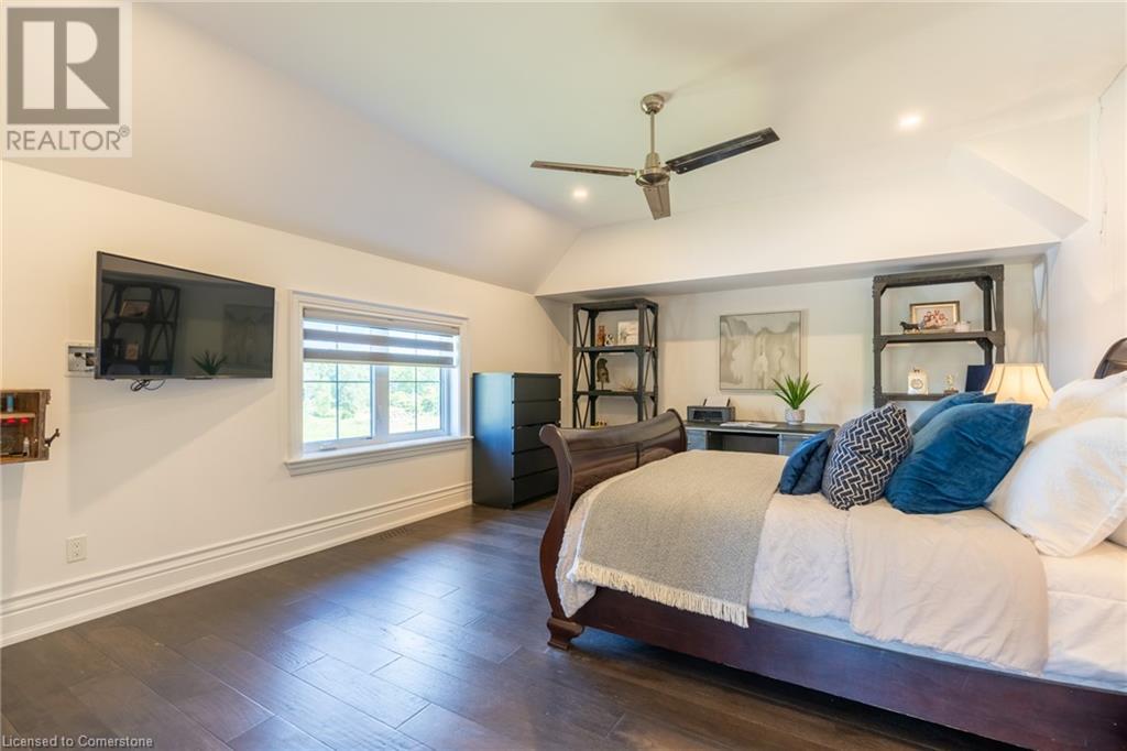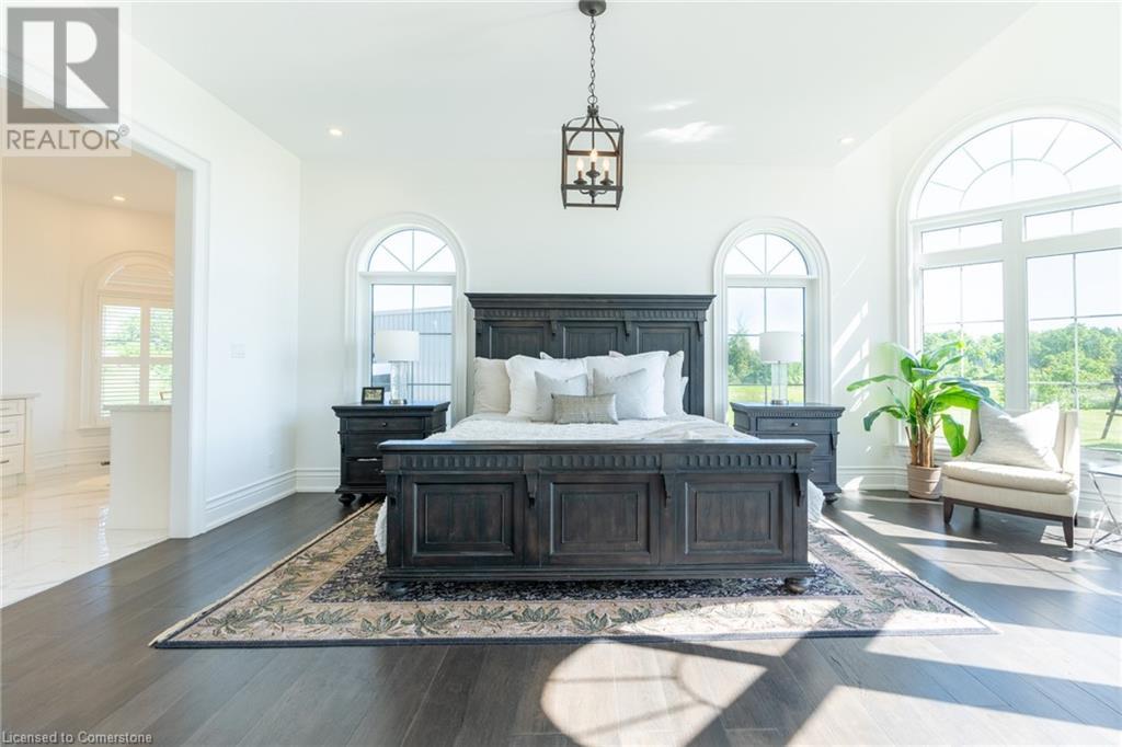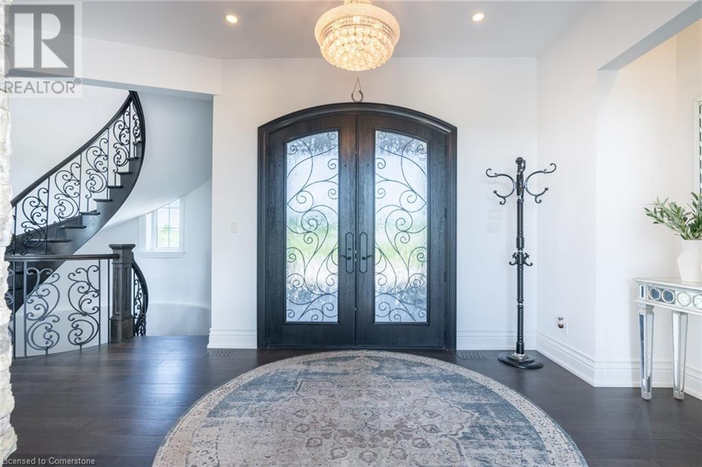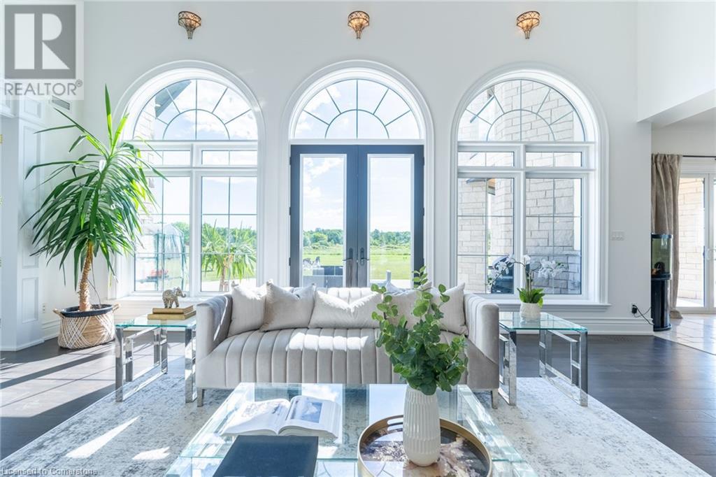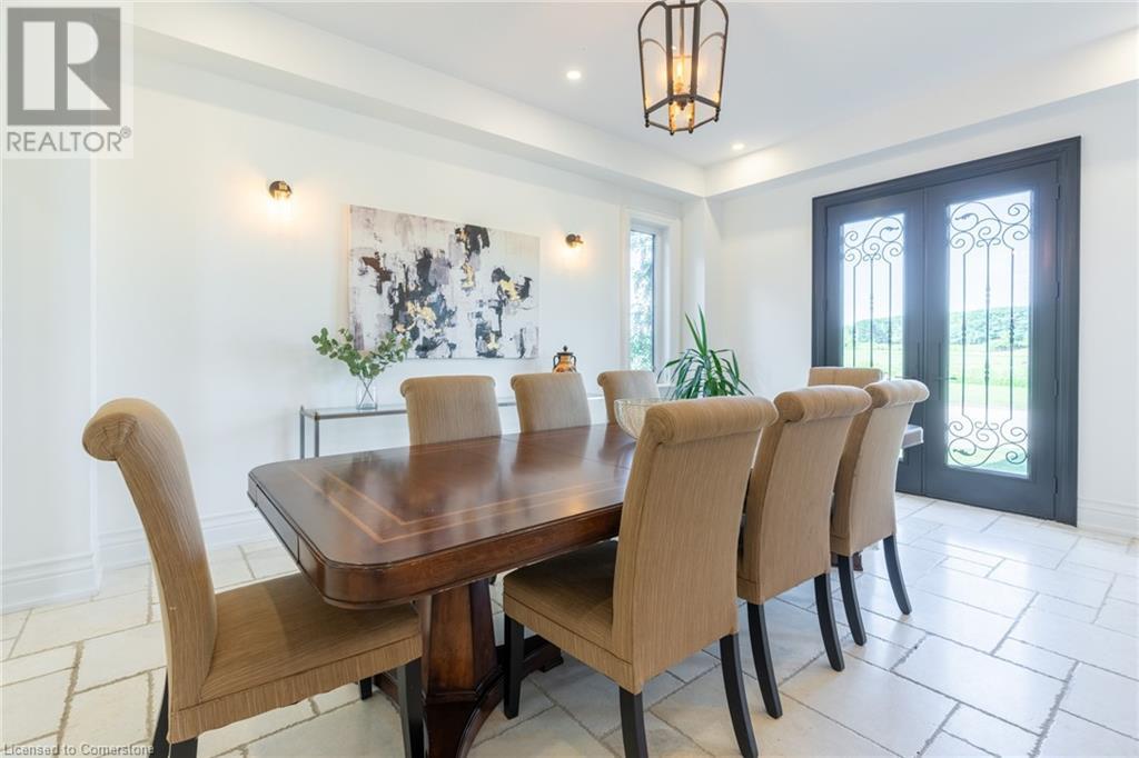 Welcome to your idyllic retreat at this stunning 10-acre property conveniently located just 4 minutes from the QEW highway making country living easier then ever! Outdoor enthusiasts will appreciate being just a 5-minute walk from the Bruce Trail and having award-winning wineries less than a kilometer away. The 2400 sqft insulated steel outbuilding with hydro provides ample space for recreational vehicle storage or hobbies. Walking in you'll be in awe of the two storey living room with stunning windows that flood the main floor with natural light and the impressive stone fireplace draws your eye up to the open second level. Indulge in the main level principal suite featuring a dressing room and ensuite with luxurious marble floors while upstairs, the 4 bedrooms share a remarkable 9-piece bathroom complete with 2 showers, 2 water closets, and 2 double vanities, ideal for large families or guests. A concrete balcony off the bedroom boasts expansive views of the picturesque surroundings. Enjoy the convenience of a geothermal heating system with 3-zone temperature control, ensuring comfort and efficiency year-round. The unspoiled lower level with a walk-up entrance is roughed in for a kitchen, 5-piece bathroom, laundry, and a 2-piece powder room, offering endless possibilities for customization. This property seamlessly blends luxury, functionality, and natural beauty, offering a serene retreat with modern conveniences and endless potential for your dream lifestyle. (id:55009)