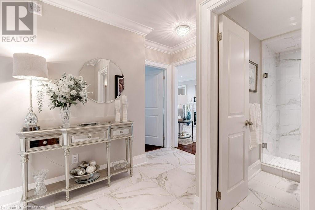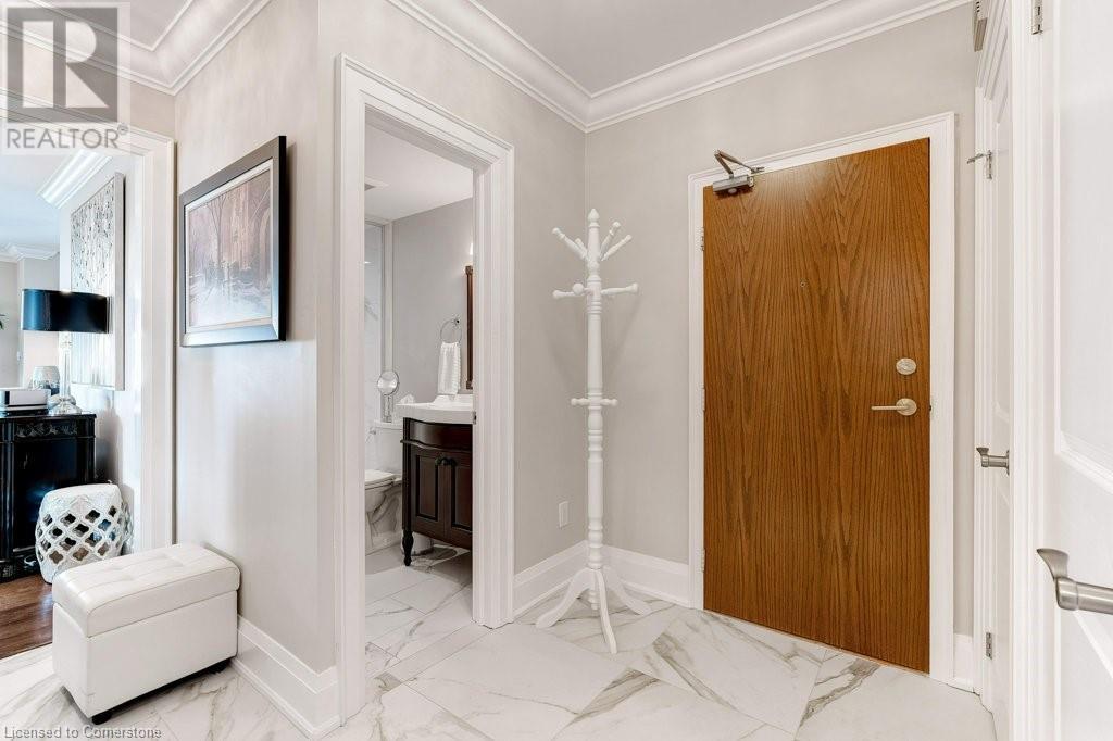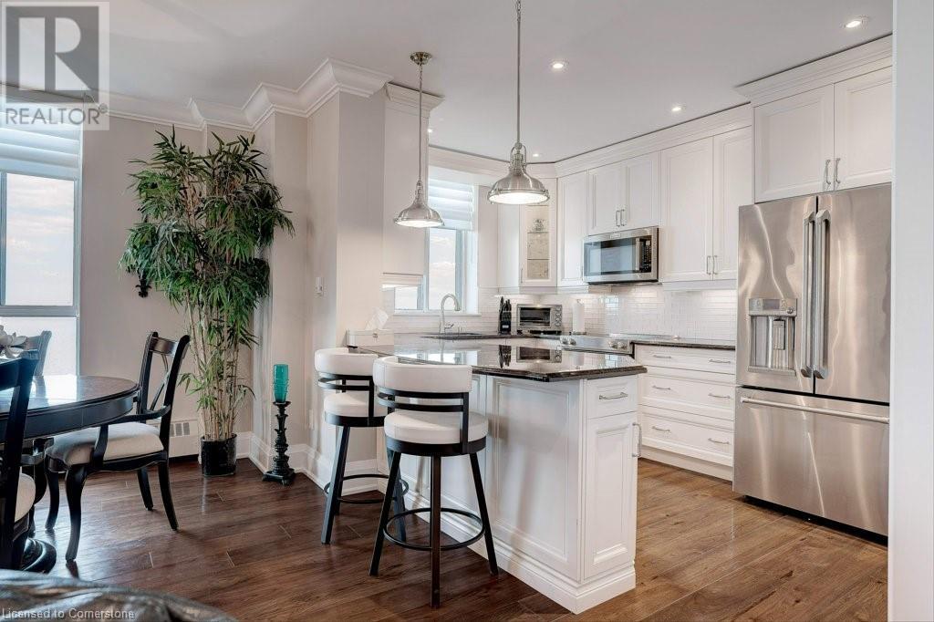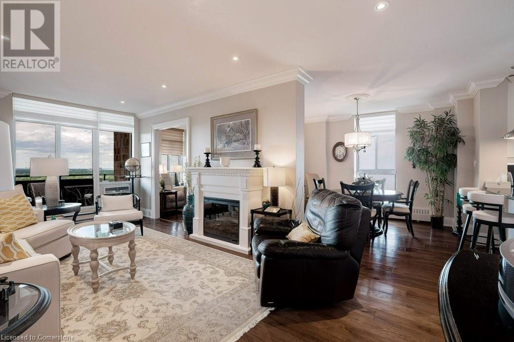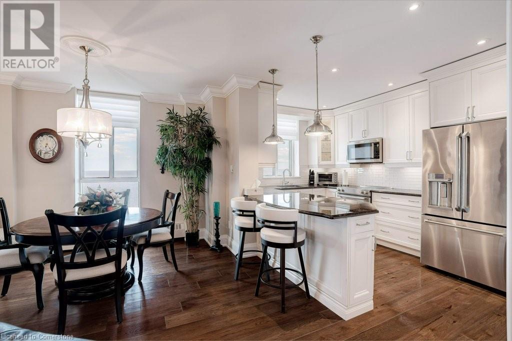 $1,077 MonthlyNOTE: NEW C/AIR/HEAT PUMP HAS BEEN INSTALLED! ADMIRAL'S WALK PENTHOUSE ON THE LAKE - FABULOUS PRIVATE CORNER SUITE, totally custom re-built in 2017. 1429 sq.ft. plus 104 Sq.ft balcony, and lake views from all six windows and the Toronto skyline. Top quality finishes through-out include stone countertops, hickory hardwood floors , heated floors in both bathrooms, mantled electric fireplace, custom detailed crown mouldings and trim throughout! Beautiful custom window blinds, ceiling fans and pot lighting compliment the FLAT ceilings . Ideal Ensuite laundry room -top quality AEG appliances. Exquisite high-end dream kitchen designed by EMERALD with Top quality SS appliances, French Dr. Fridge w/filtered water/ice/hot feature, Microwave, Dishwasher and ceramic-top stove, pot lighting, under-counter and pendant lighting and AMAZING breakfast bar. Features and Amenities: Party Room, Games rooms-- Billiards and PingPong. Workshop/Pottery, Exercise Room, His/Her Saunas and Washrooms, Library & extra Laundry area, 60 Visitor Parking, 40 underground, Auto Garage Door Remote, Security System, Fire Alarm System, Intercom, Carpet Free Apartment, Locker, Free car wash, Building & grounds (approx 3-4 acres) refurbished in 22/23. Heated inground pool with adjacent picnic bench area with gas barbeques overlooking the lake and adjacent walking paths and sitting benches. Amenities. Condo Fees include Pking #39 & Locker B19, Building Insurance, exterior maintenance, common elements, heat, hydro, natural gas, parking, and water. Great location close to shopping and 0nly a 5 minute drive to Bronte Harbour. Luxury living right on Lake Ontario in absolutely mint condition. Perfect for the discerning buyer. (id:55009)