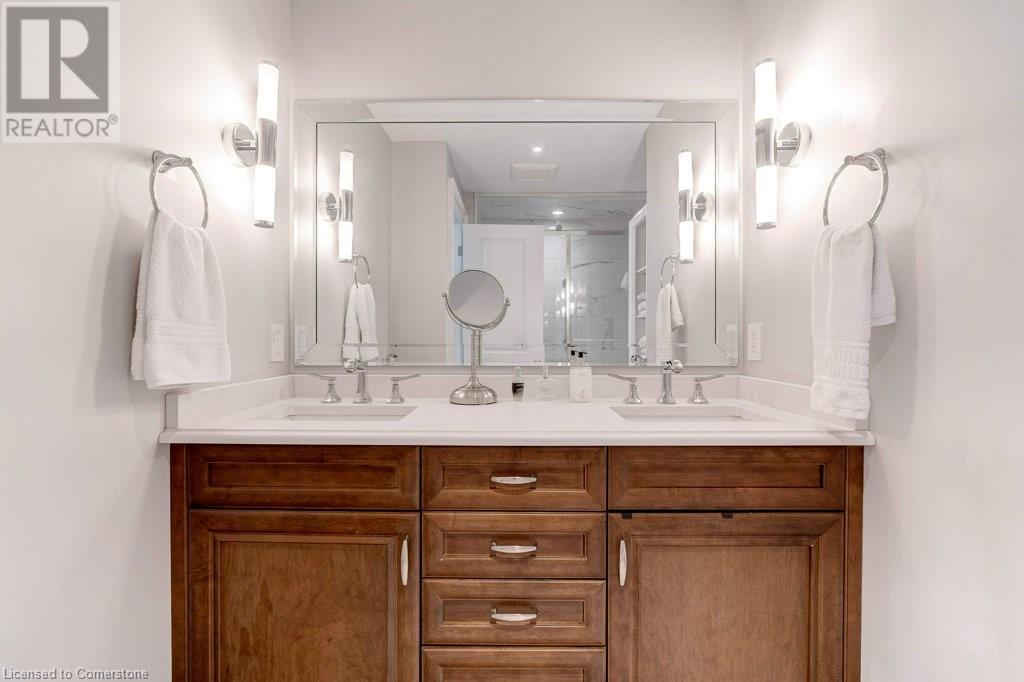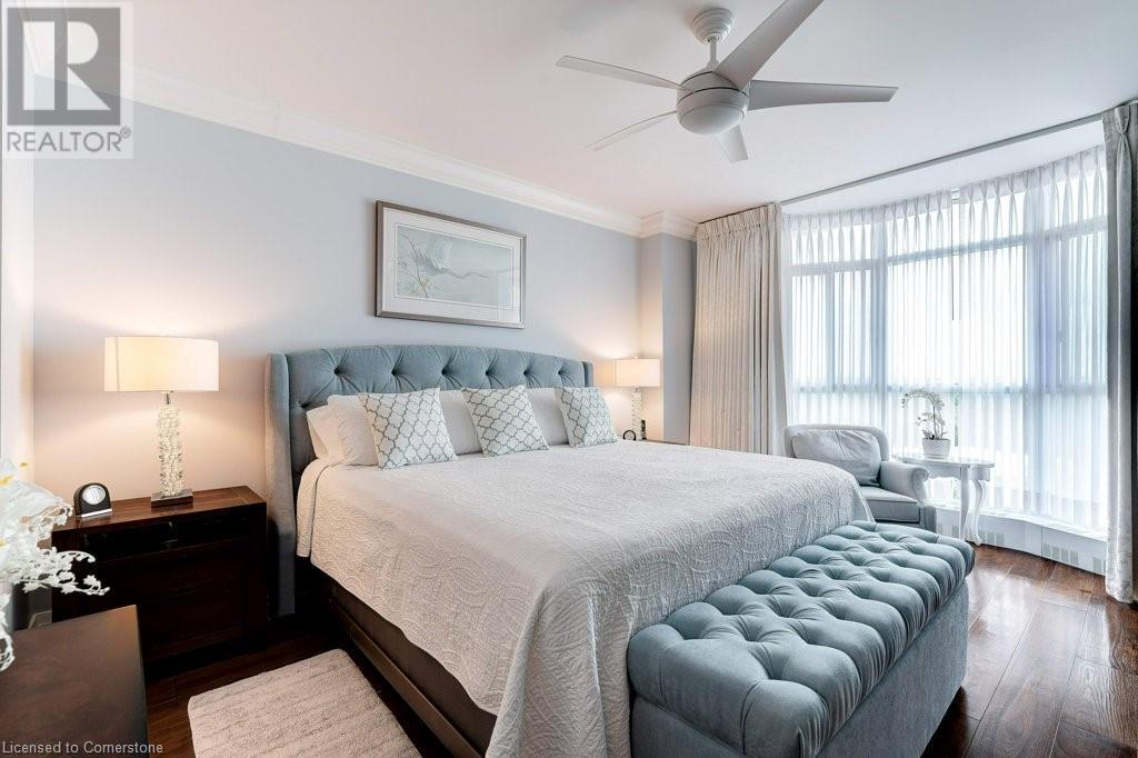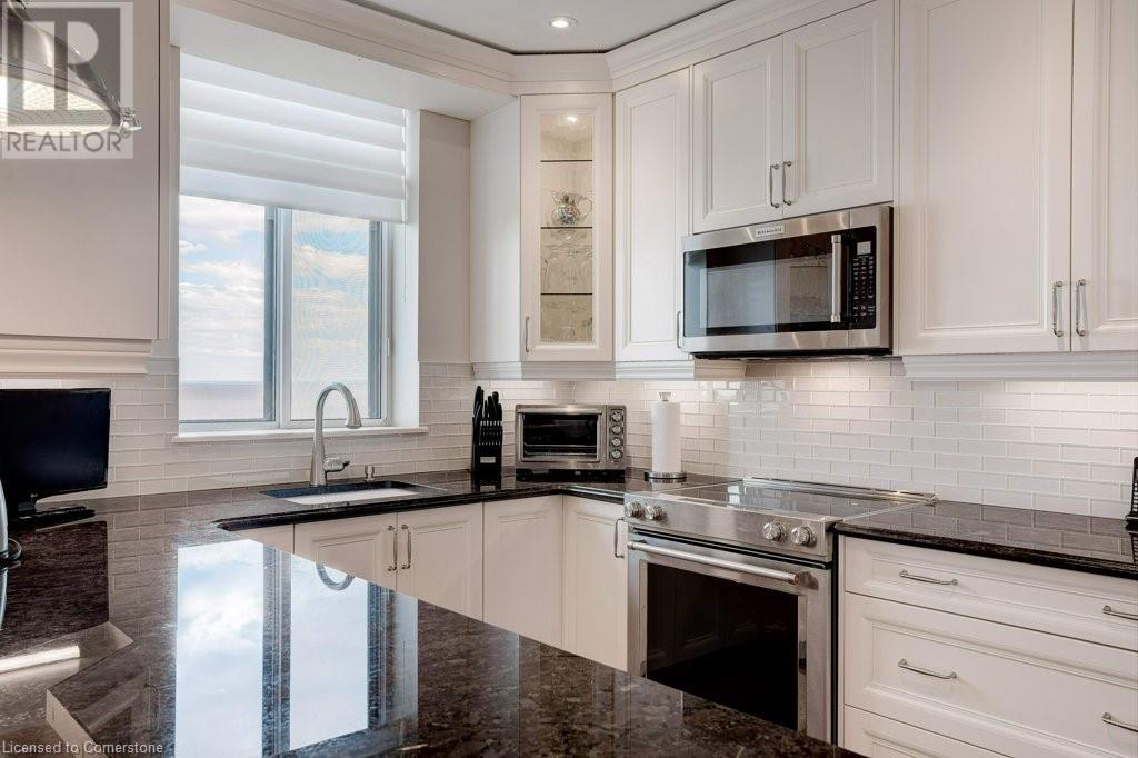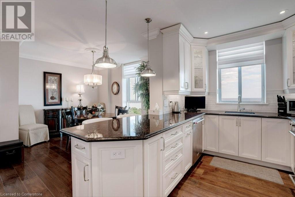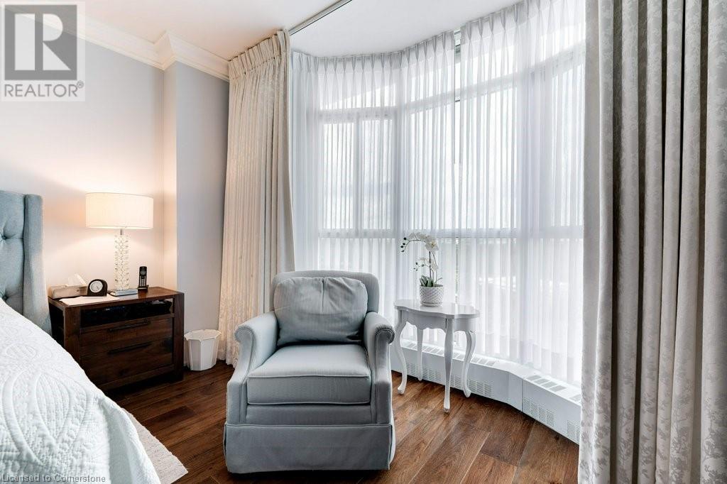 $1,077 MonthlyNOTE: NEW C/AIR/HEAT PUMP HAS BEEN INSTALLED! ADMIRAL'S WALK PENTHOUSE ON THE LAKE - FABULOUS PRIVATE CORNER SUITE, totally custom re-built in 2017. 1429 sq.ft. plus 104 Sq.ft balcony, and lake views from all six windows and the Toronto skyline. Top quality finishes through-out include stone countertops, hickory hardwood floors , heated floors in both bathrooms, mantled electric fireplace, custom detailed crown mouldings and trim throughout! Beautiful custom window blinds, ceiling fans and pot lighting compliment the FLAT ceilings . Ideal Ensuite laundry room -top quality AEG appliances. Exquisite high-end dream kitchen designed by EMERALD with Top quality SS appliances, French Dr. Fridge w/filtered water/ice/hot feature, Microwave, Dishwasher and ceramic-top stove, pot lighting, under-counter and pendant lighting and AMAZING breakfast bar. Features and Amenities: Party Room, Games rooms-- Billiards and PingPong. Workshop/Pottery, Exercise Room, His/Her Saunas and Washrooms, Library & extra Laundry area, 60 Visitor Parking, 40 underground, Auto Garage Door Remote, Security System, Fire Alarm System, Intercom, Carpet Free Apartment, Locker, Free car wash, Building & grounds (approx 3-4 acres) refurbished in 22/23. Heated inground pool with adjacent picnic bench area with gas barbeques overlooking the lake and adjacent walking paths and sitting benches. Amenities. Condo Fees include Pking #39 & Locker B19, Building Insurance, exterior maintenance, common elements, heat, hydro, natural gas, parking, and water. Great location close to shopping and 0nly a 5 minute drive to Bronte Harbour. Luxury living right on Lake Ontario in absolutely mint condition. Perfect for the discerning buyer. (id:55009)