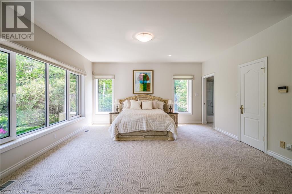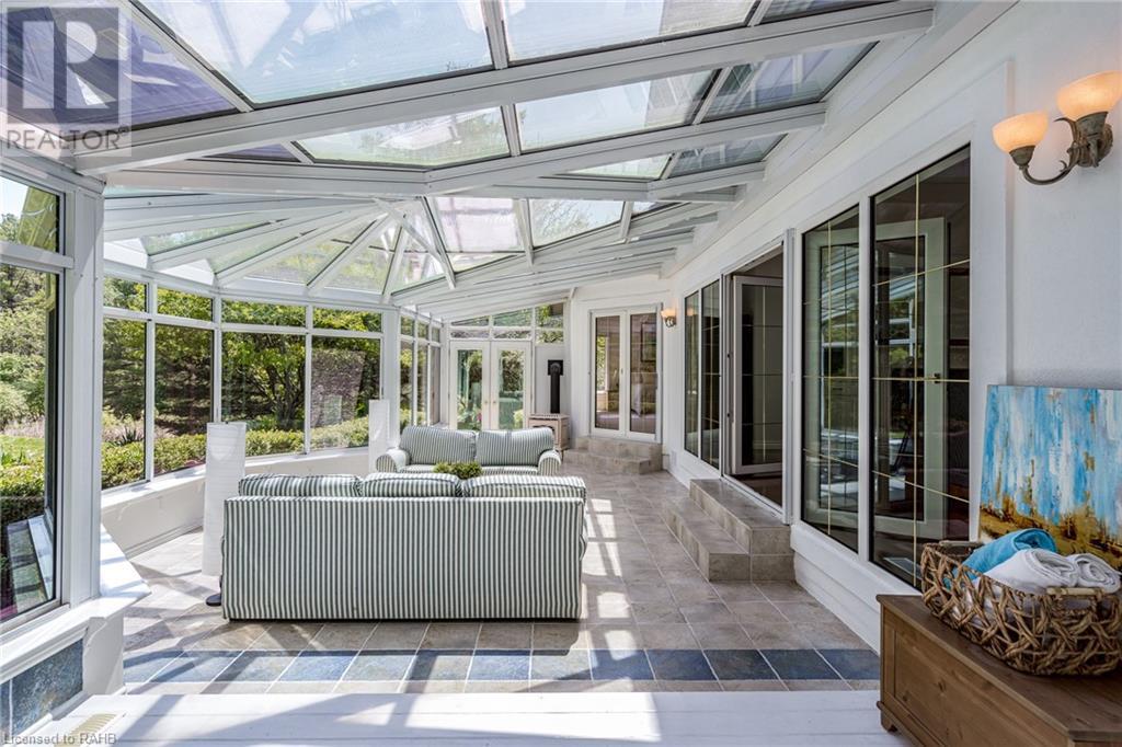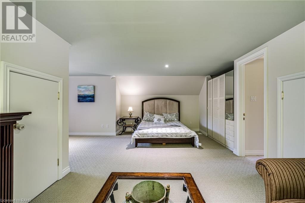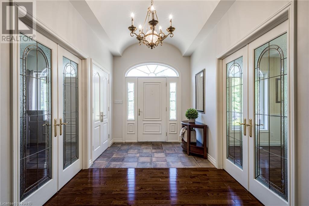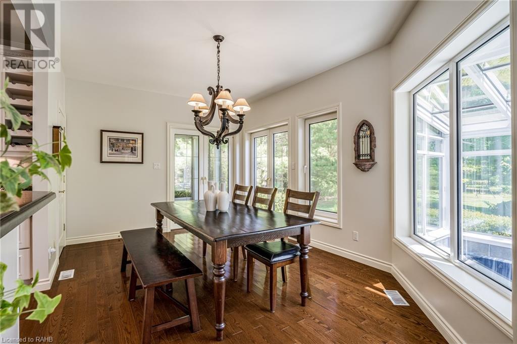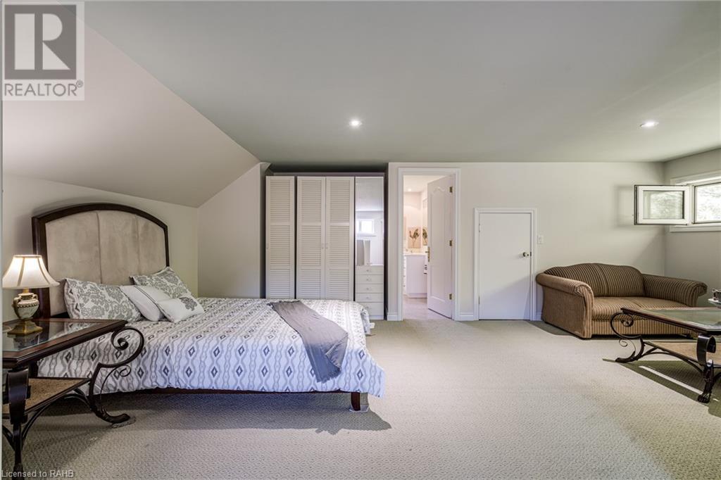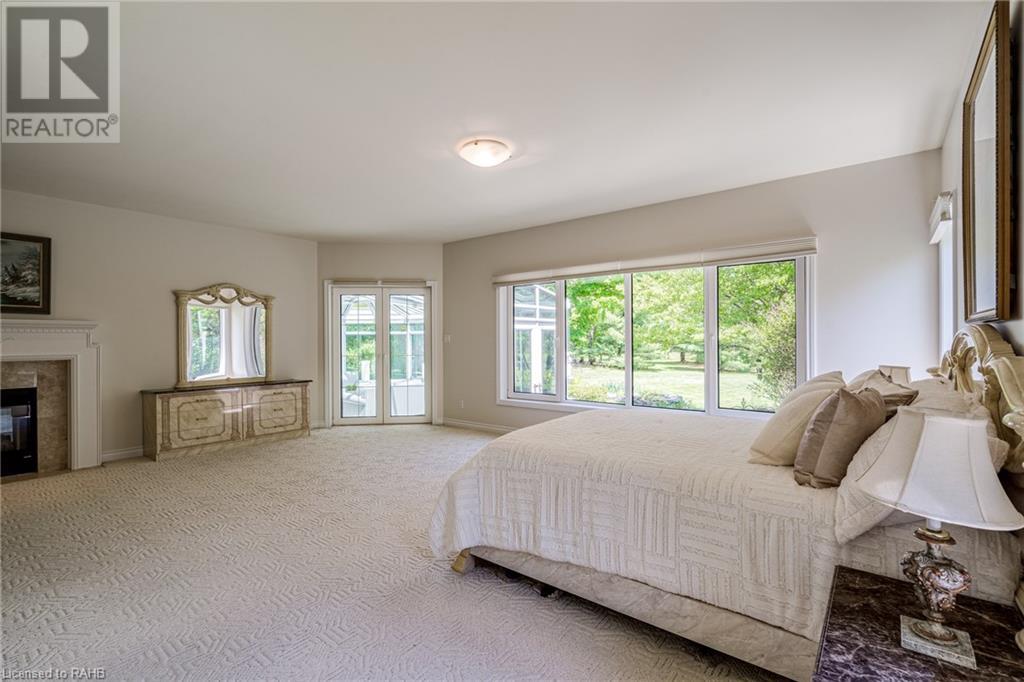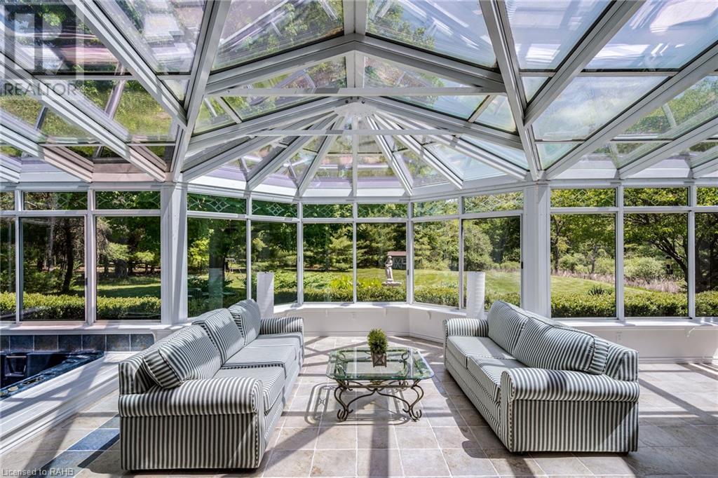 Introducing 53 Ranch Rd, a breathtaking property that offers sanctuary from fast-paced living just minutes from Ancaster, Dundas & Brantford. This custom built bungaloft is situated on a 3+ acre treed lot that offer tranquility and privacy with only one immediate neighbour. The gorgeous, professionally landscaped grounds are stunning all year long, as are the surrounding trails a streets. The long paved driveway leads to a 3 car garage with direct access to the home. Step through the front door into the grand foyer. Natural light floods the foyer & the rest of the 4000+ sqft home from the oversized top quality tilt&turn windows. You will feel at home in the gourmet eat-in kitchen, with its walk-in pantry and adjacent screened dining area. The family room is the heart of this quality home and features 13' soaring ceilings & a gas fireplace. The family room leads to the glass-enclosed solarium, with a hot-tub, conversation area and access to the backyard. Enjoy the glorious views as you unwind. The primary bedroom features a 5pc ensuite, large walk-in closet & a sitting area. 2 additional bedrooms can be found on the main floor, as well as a formal dining room off the kitchen. ln the other wing of the home, you will find a private inlaw/nanny suite, equipped with a private entrance, sitting area, bathroom & the potential for future kitchenette. Experience the tranquility of country living, minutes from city convenience. This enchanting property is unmatched. (id:55009)