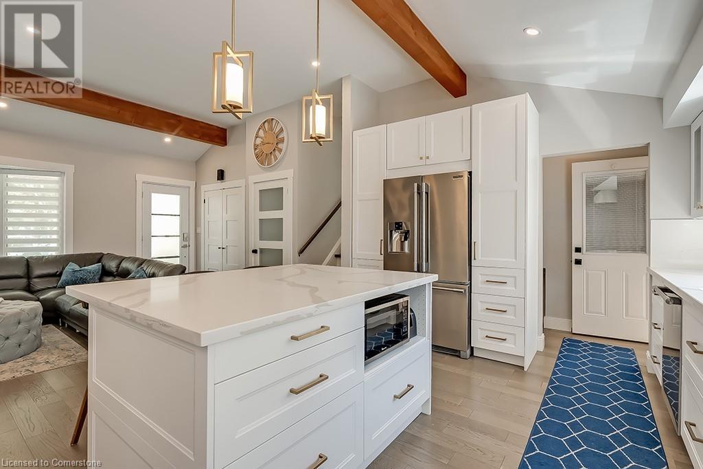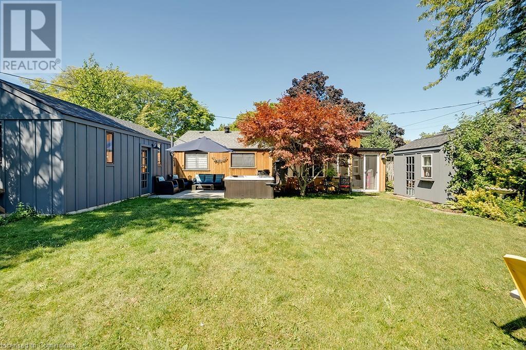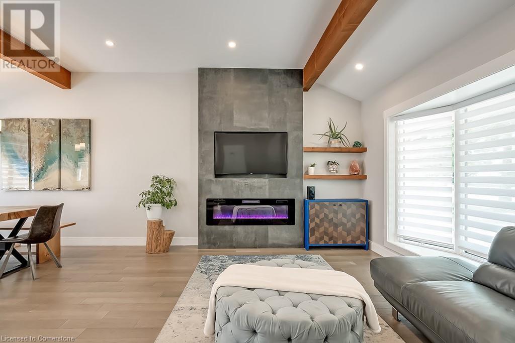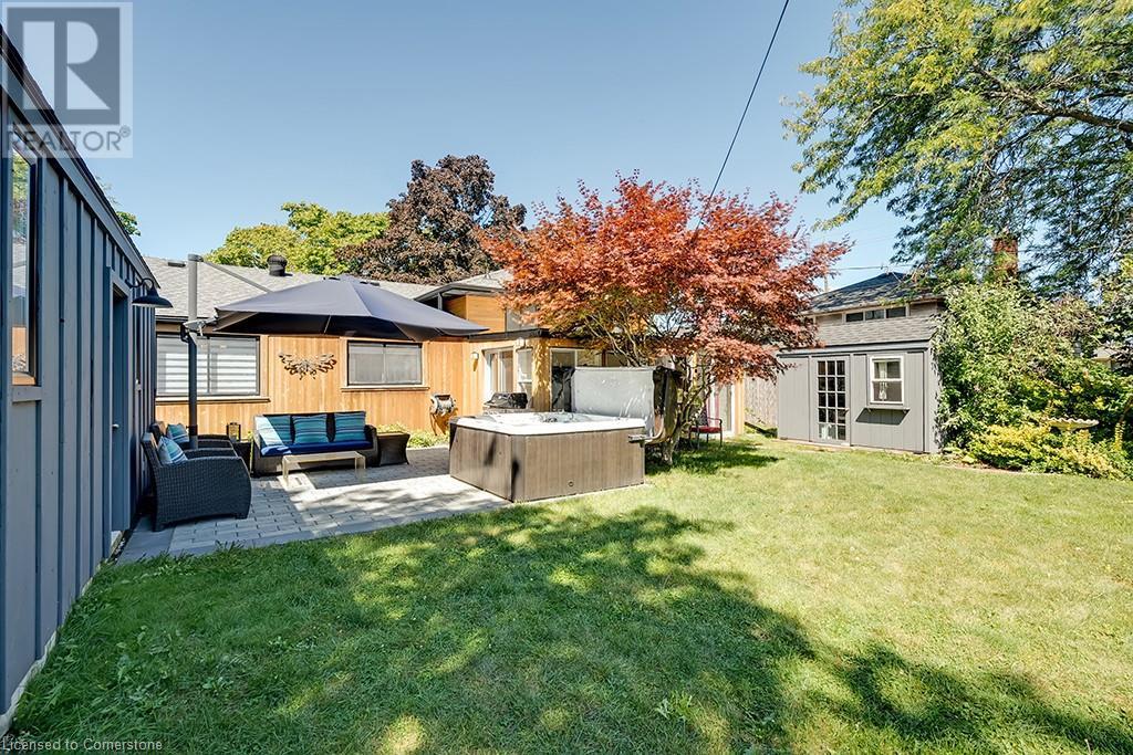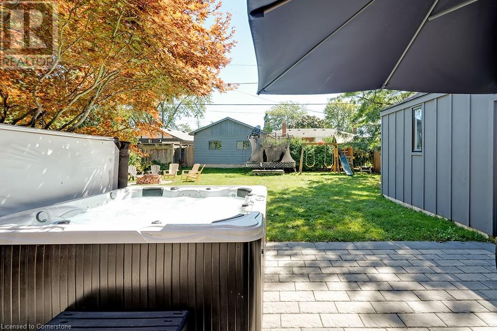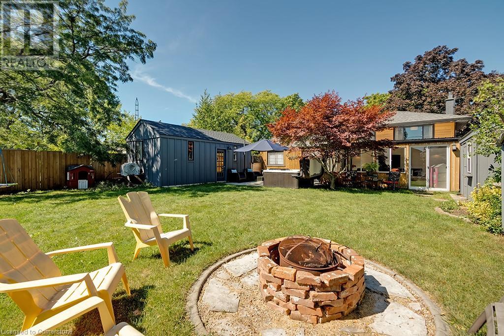 Stunning 3-level side split in sought after Elizabeth Gardens! This home features 3 bedrooms, 2 full baths, an open concept floor plan and a large backyard! This fully renovated home offer 1450 square feet of top-quality finishes plus a fully finished lower level with in-law potential! The main level has an open concept floorplan with engineered hardwood flooring, smooth ceilings and ample natural light throughout. The great room boasts vaulted ceilings, a fireplace feature wall and beautiful wood beam. The kitchen has a large island, quartz counters and stainless-steel appliances. The family room / sunroom overlooks and provides access the private backyard. The upper level has 3 bedrooms and a beautifully renovated 5-piece bath. The lower level of the home makes way to a bright rec room with a gas fireplace, 3-piece bathroom, a laundry room with kitchenette, a 2nd staircase to the exterior and plenty of storage space. The landscaped exterior has amazing curb appeal and boasts a private yard with a large custom shed, stone patio with hot tub, an oversized detached single car garage, a double wide driveway! This home is located close to all amenities- schools, parks and public transportation! (id:55009)