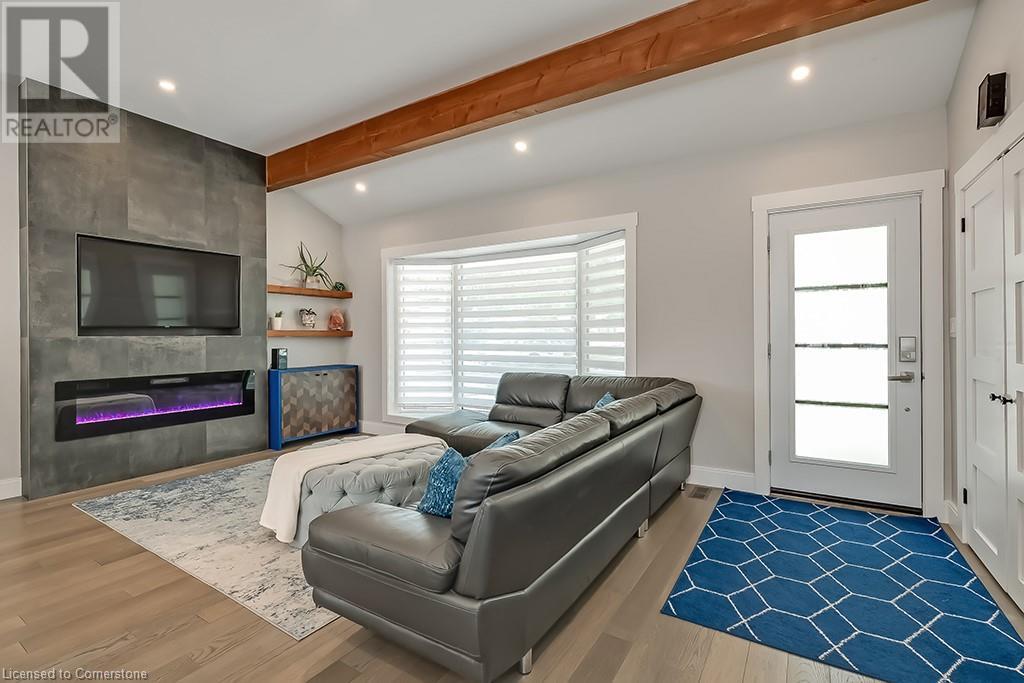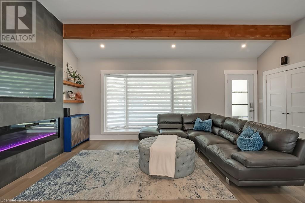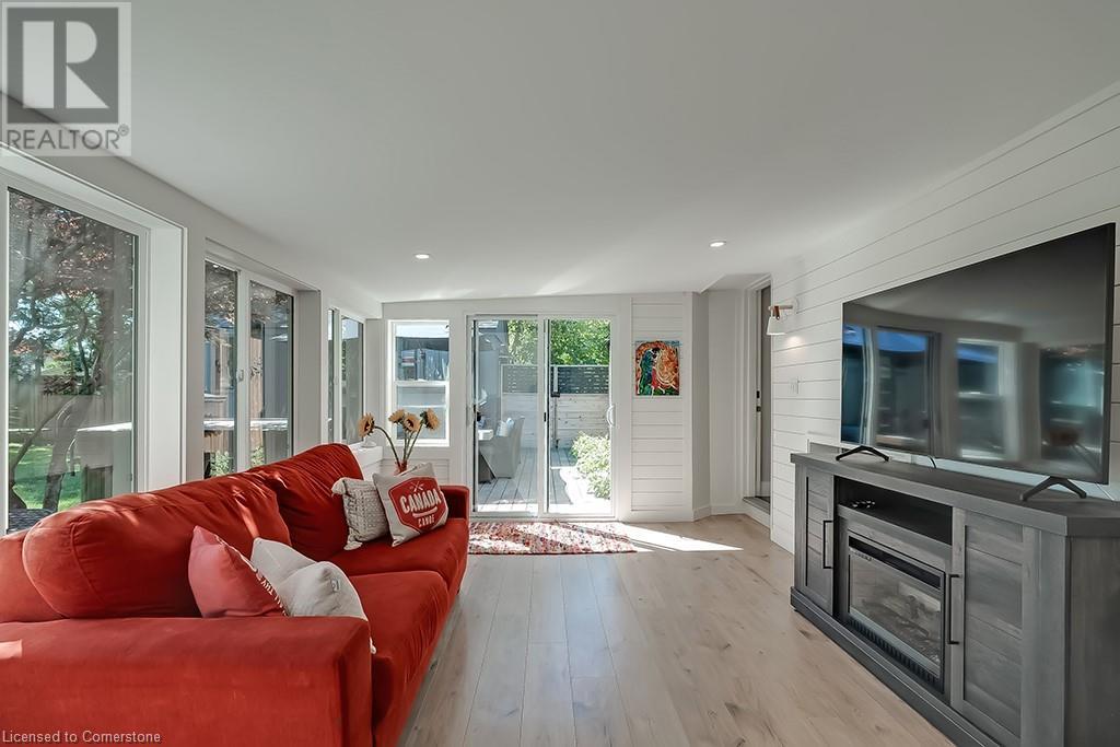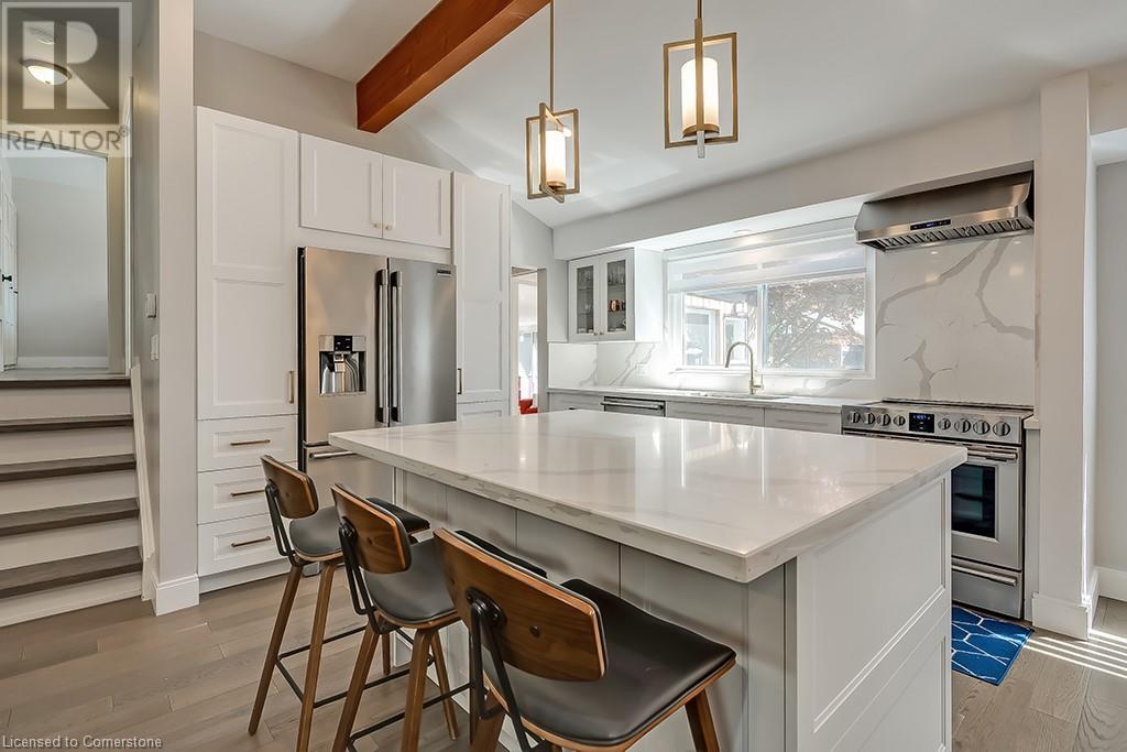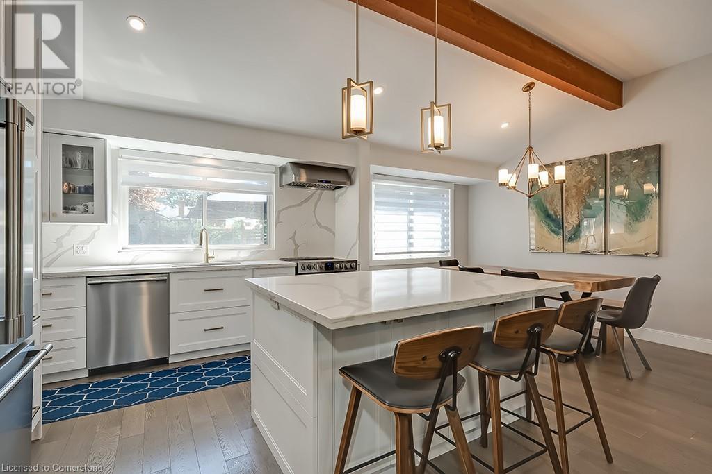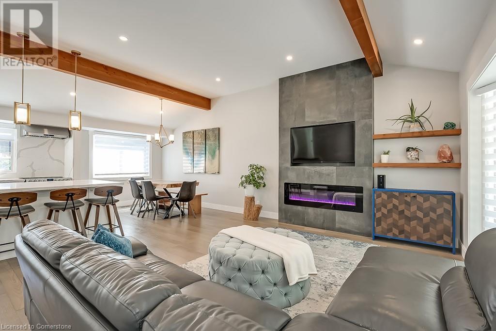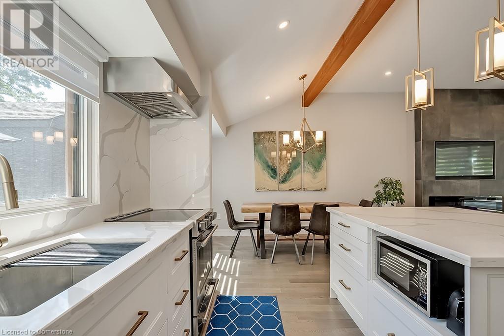 Stunning 3-level side split in sought after Elizabeth Gardens! This home features 3 bedrooms, 2 full baths, an open concept floor plan and a large backyard! This fully renovated home offer 1450 square feet of top-quality finishes plus a fully finished lower level with in-law potential! The main level has an open concept floorplan with engineered hardwood flooring, smooth ceilings and ample natural light throughout. The great room boasts vaulted ceilings, a fireplace feature wall and beautiful wood beam. The kitchen has a large island, quartz counters and stainless-steel appliances. The family room / sunroom overlooks and provides access the private backyard. The upper level has 3 bedrooms and a beautifully renovated 5-piece bath. The lower level of the home makes way to a bright rec room with a gas fireplace, 3-piece bathroom, a laundry room with kitchenette, a 2nd staircase to the exterior and plenty of storage space. The landscaped exterior has amazing curb appeal and boasts a private yard with a large custom shed, stone patio with hot tub, an oversized detached single car garage, a double wide driveway! This home is located close to all amenities- schools, parks and public transportation! (id:55009)
