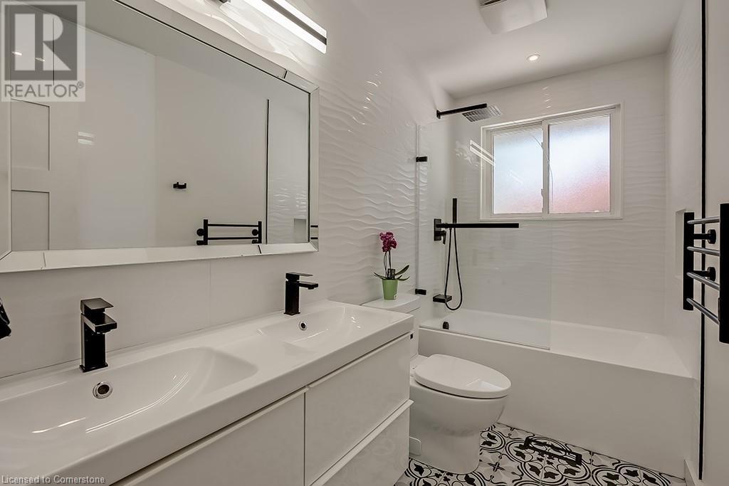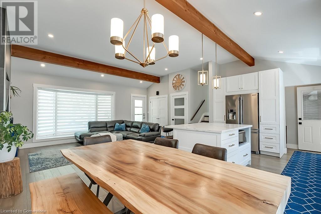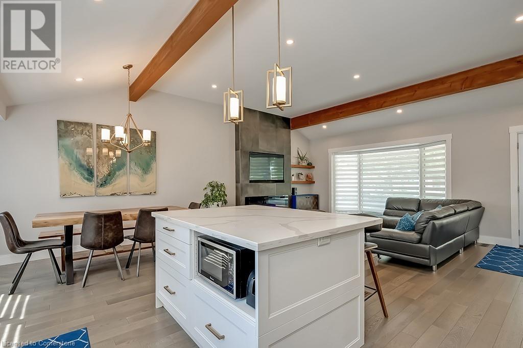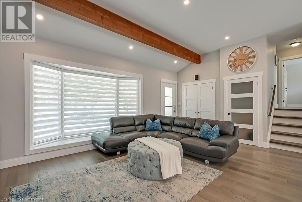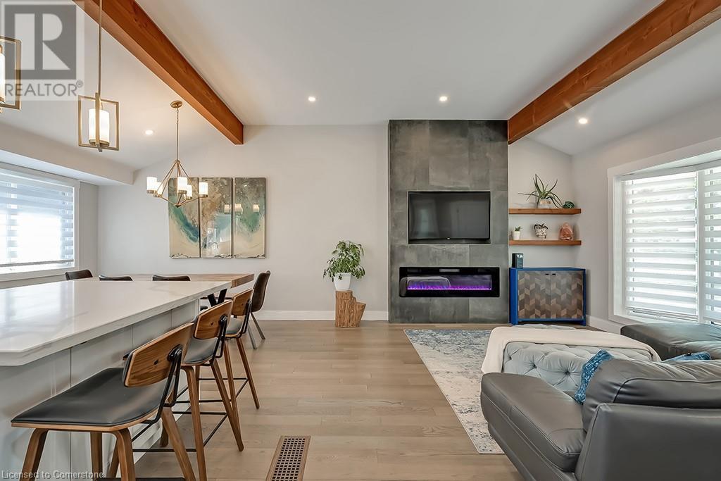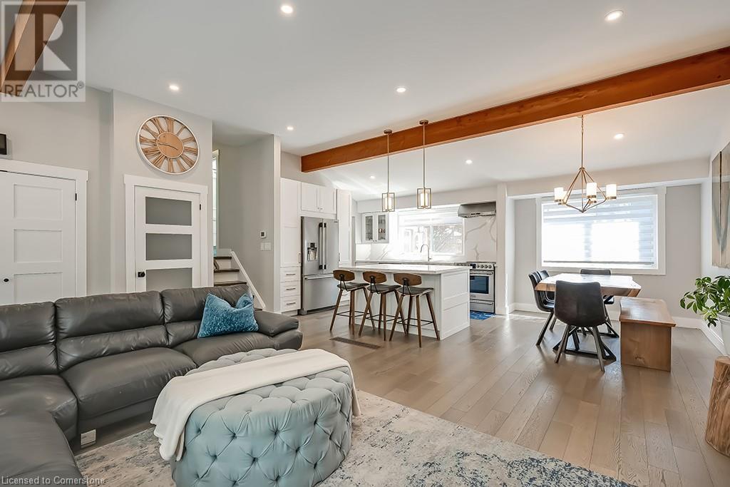 Stunning 3-level side split in sought after Elizabeth Gardens! This home features 3 bedrooms, 2 full baths, an open concept floor plan and a large backyard! This fully renovated home offer 1450 square feet of top-quality finishes plus a fully finished lower level with in-law potential! The main level has an open concept floorplan with engineered hardwood flooring, smooth ceilings and ample natural light throughout. The great room boasts vaulted ceilings, a fireplace feature wall and beautiful wood beam. The kitchen has a large island, quartz counters and stainless-steel appliances. The family room / sunroom overlooks and provides access the private backyard. The upper level has 3 bedrooms and a beautifully renovated 5-piece bath. The lower level of the home makes way to a bright rec room with a gas fireplace, 3-piece bathroom, a laundry room with kitchenette, a 2nd staircase to the exterior and plenty of storage space. The landscaped exterior has amazing curb appeal and boasts a private yard with a large custom shed, stone patio with hot tub, an oversized detached single car garage, a double wide driveway! This home is located close to all amenities- schools, parks and public transportation! (id:55009)