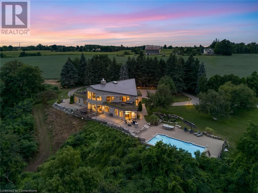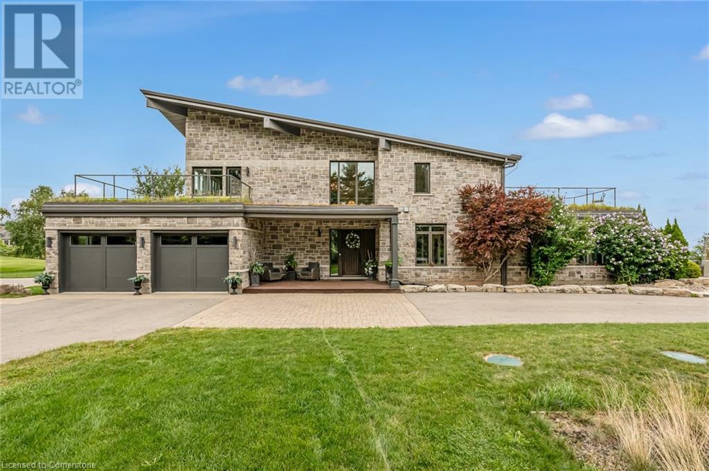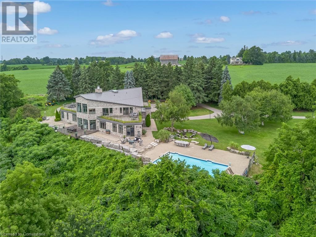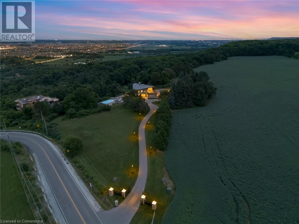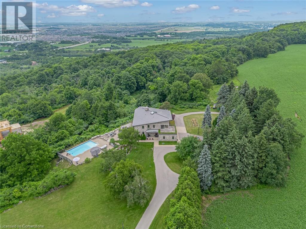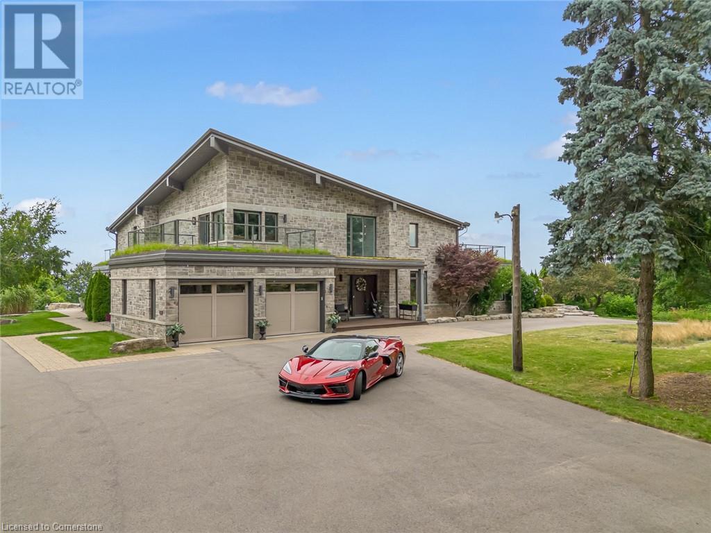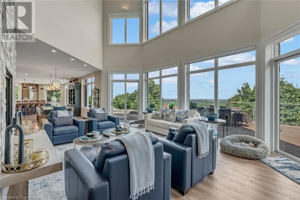 Set against the backdrop of a stunning escarpment estate, this magnificent terrace home embodies the essence of modern opulence across a lush 13.5-acre vista. Experience the pinnacle of architectural excellence in a dwelling that seamlessly integrates avant-garde design with the serene embrace of nature. Enter a realm of sophistication within this 6,085 square foot sanctuary, featuring exquisite finishes and an sprawling open-concept layout accentuated by soaring 24-foot ceilings and floor to ceiling glass walls that invite an abundance of natural light to highlight every luxurious detail. The gourmet kitchen is a culinary masterpiece, equipped with top-of-the-line appliances and a chic central island, ideal for hosting unforgettable gatherings that will captivate your guests. This residence offers five lavish bedrooms and seven indulgent bathrooms, including a tranquil primary suite on the main level, complete with a spa-inspired ensuite for unparalleled relaxation. A separate suite provides additional accommodation, perfect for a nanny, in-laws, or teenagers desiring their own retreat. The rambling grounds celebrate the beauty of nature, featuring a newly constructed concrete pool and picturesque pathways that meander through enchanting woodlands, complete with a charming soothing stream. With generous parking for many vehicles, this home serves as a private haven for those who appreciate both seclusion and grandeur. The exterior boasts exceptional insulation for energy efficiency, while ten walkouts lead to Malibu-style decks, adorned with a unusual green roof edge and elegant glass balusters, capturing breathtaking views of Southern Ontario. 2.5-acre field adjacent to the residence presents the perfect opportunity for an equestrian addition. This property transcends mere real estate; it is a declaration of an extraordinary lifestyle. Welcome to a home where each day unfolds like an exclusive retreat. (id:55009)