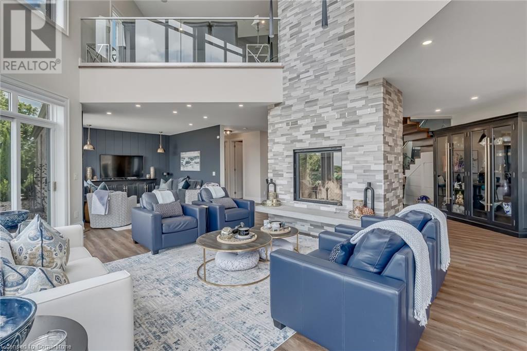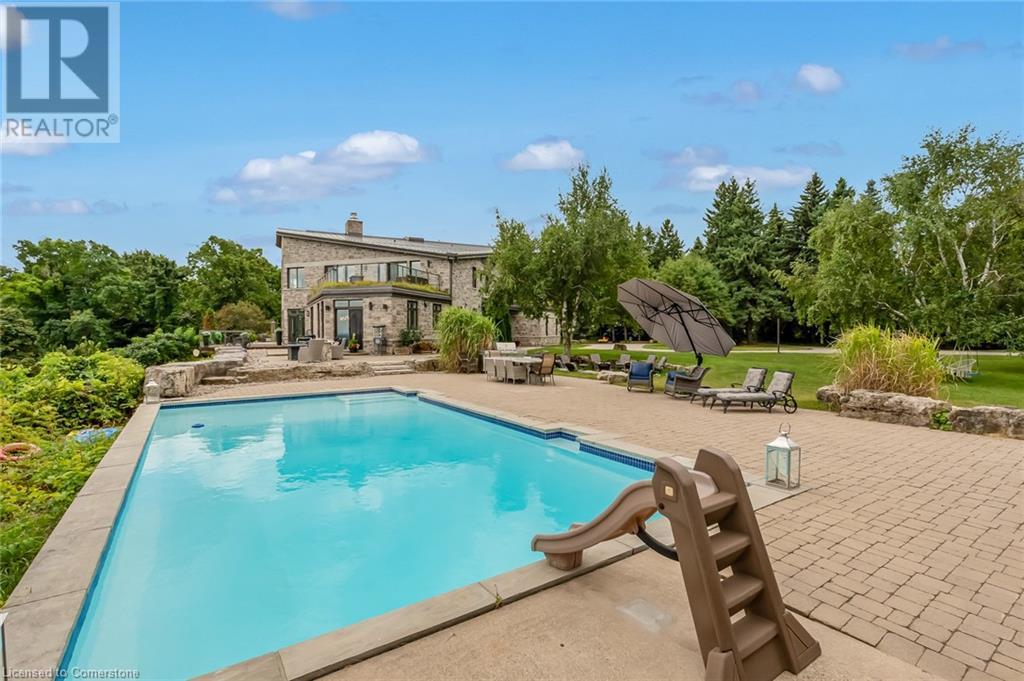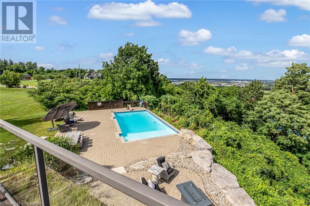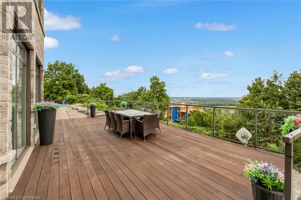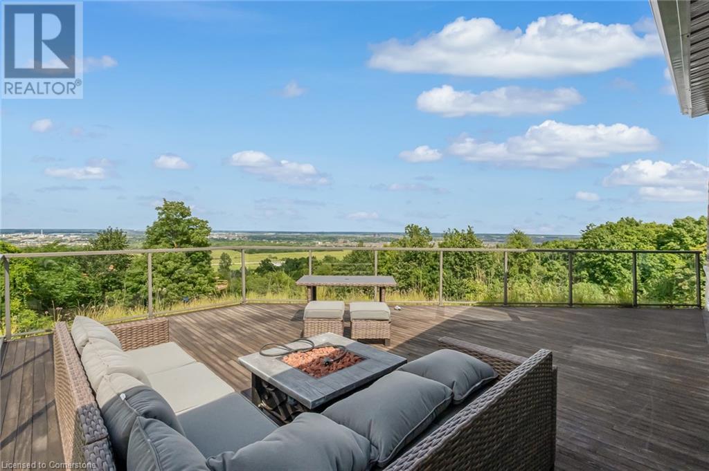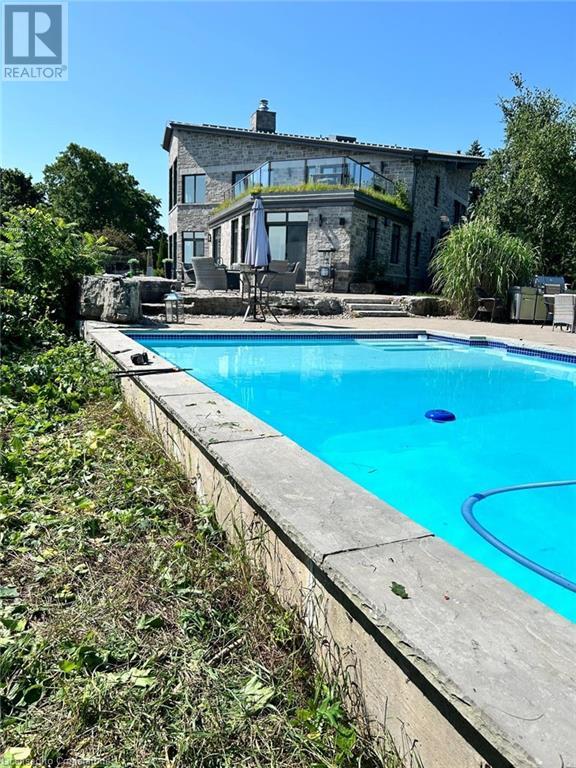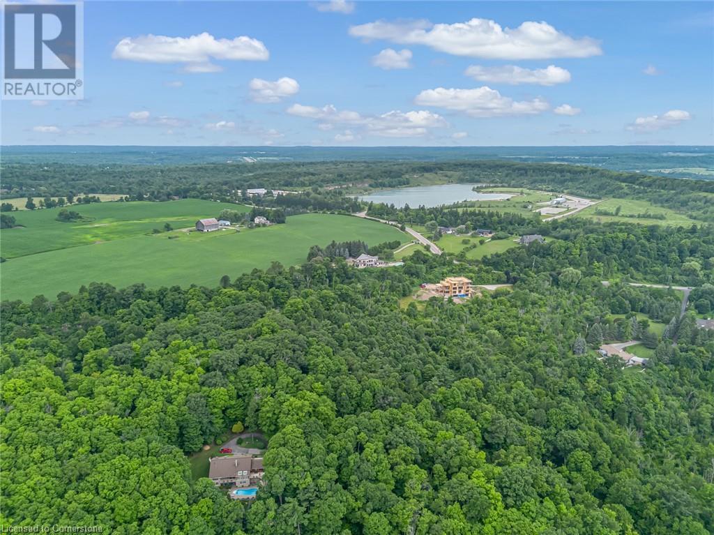 Set against the backdrop of a stunning escarpment estate, this magnificent terrace home embodies the essence of modern opulence across a lush 13.5-acre vista. Experience the pinnacle of architectural excellence in a dwelling that seamlessly integrates avant-garde design with the serene embrace of nature. Enter a realm of sophistication within this 6,085 square foot sanctuary, featuring exquisite finishes and an sprawling open-concept layout accentuated by soaring 24-foot ceilings and floor to ceiling glass walls that invite an abundance of natural light to highlight every luxurious detail. The gourmet kitchen is a culinary masterpiece, equipped with top-of-the-line appliances and a chic central island, ideal for hosting unforgettable gatherings that will captivate your guests. This residence offers five lavish bedrooms and seven indulgent bathrooms, including a tranquil primary suite on the main level, complete with a spa-inspired ensuite for unparalleled relaxation. A separate suite provides additional accommodation, perfect for a nanny, in-laws, or teenagers desiring their own retreat. The rambling grounds celebrate the beauty of nature, featuring a newly constructed concrete pool and picturesque pathways that meander through enchanting woodlands, complete with a charming soothing stream. With generous parking for many vehicles, this home serves as a private haven for those who appreciate both seclusion and grandeur. The exterior boasts exceptional insulation for energy efficiency, while ten walkouts lead to Malibu-style decks, adorned with a unusual green roof edge and elegant glass balusters, capturing breathtaking views of Southern Ontario. 2.5-acre field adjacent to the residence presents the perfect opportunity for an equestrian addition. This property transcends mere real estate; it is a declaration of an extraordinary lifestyle. Welcome to a home where each day unfolds like an exclusive retreat. (id:55009)