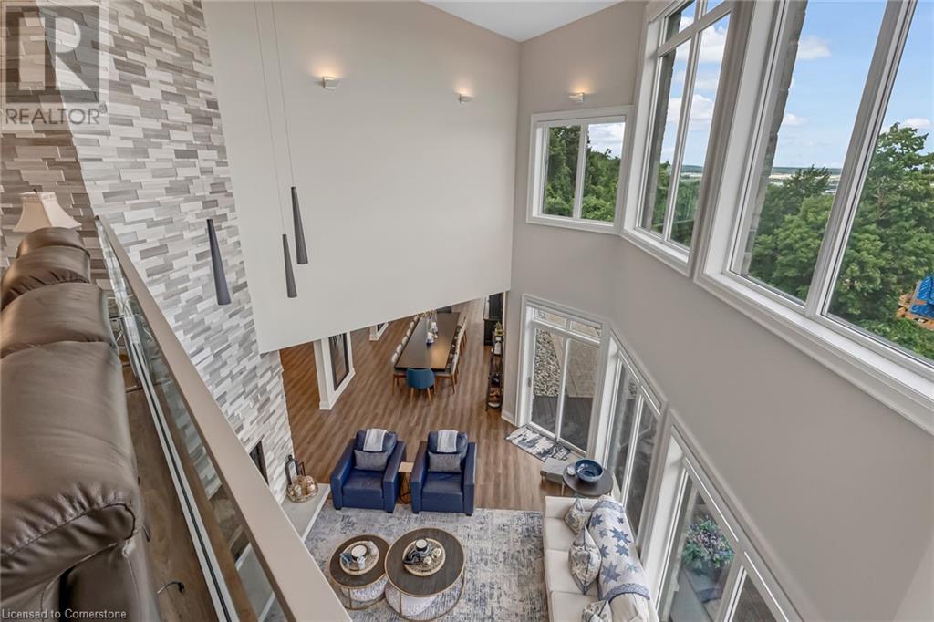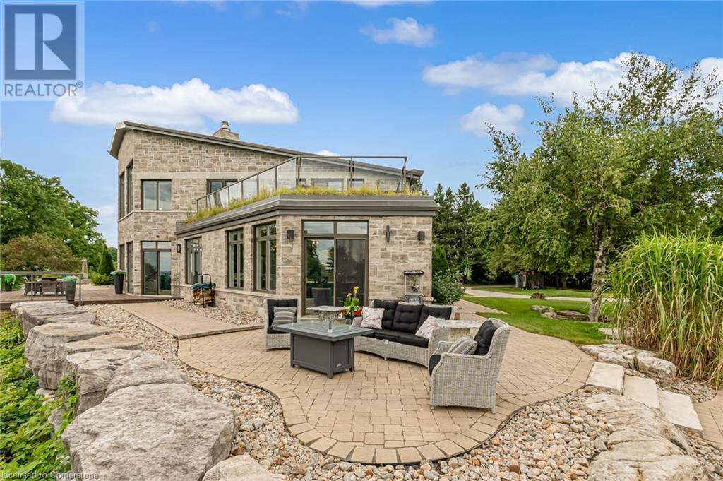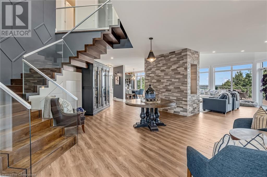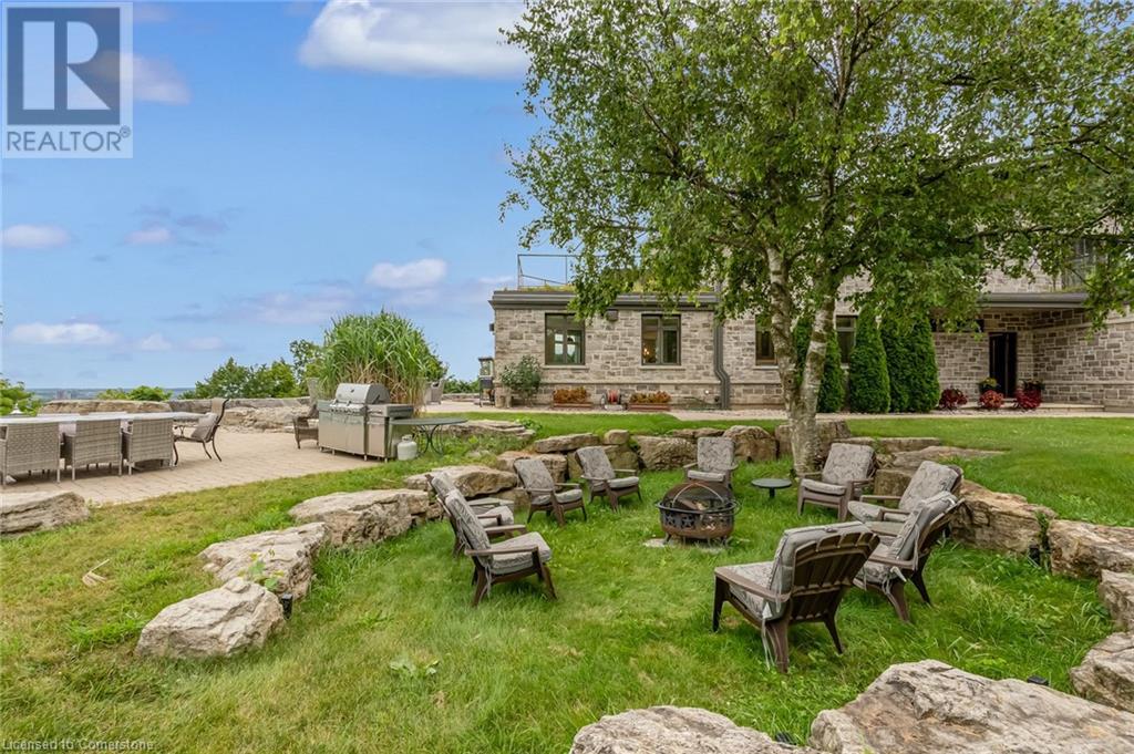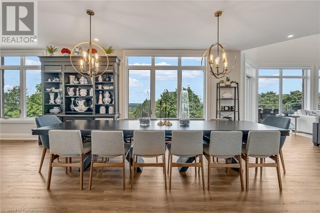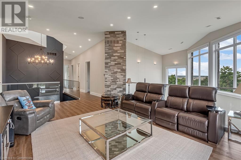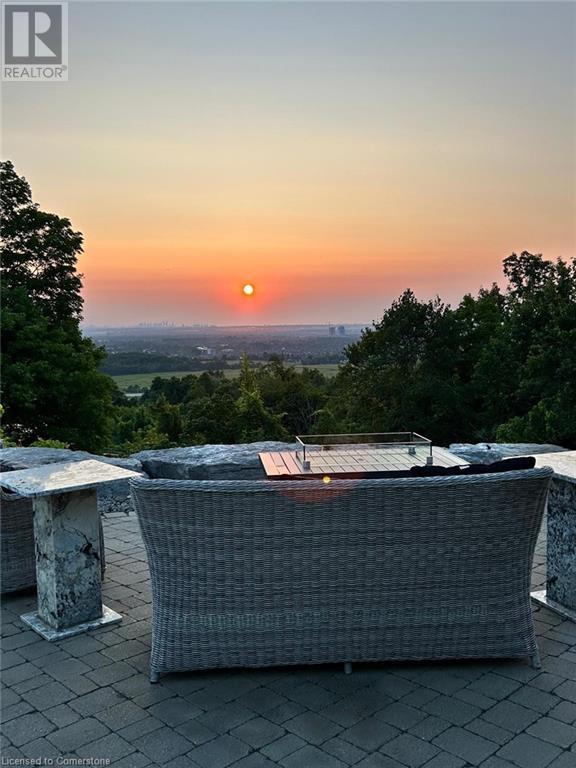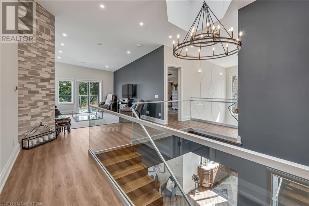 Set against the backdrop of a stunning escarpment estate, this magnificent terrace home embodies the essence of modern opulence across a lush 13.5-acre vista. Experience the pinnacle of architectural excellence in a dwelling that seamlessly integrates avant-garde design with the serene embrace of nature. Enter a realm of sophistication within this 6,085 square foot sanctuary, featuring exquisite finishes and an sprawling open-concept layout accentuated by soaring 24-foot ceilings and floor to ceiling glass walls that invite an abundance of natural light to highlight every luxurious detail. The gourmet kitchen is a culinary masterpiece, equipped with top-of-the-line appliances and a chic central island, ideal for hosting unforgettable gatherings that will captivate your guests. This residence offers five lavish bedrooms and seven indulgent bathrooms, including a tranquil primary suite on the main level, complete with a spa-inspired ensuite for unparalleled relaxation. A separate suite provides additional accommodation, perfect for a nanny, in-laws, or teenagers desiring their own retreat. The rambling grounds celebrate the beauty of nature, featuring a newly constructed concrete pool and picturesque pathways that meander through enchanting woodlands, complete with a charming soothing stream. With generous parking for many vehicles, this home serves as a private haven for those who appreciate both seclusion and grandeur. The exterior boasts exceptional insulation for energy efficiency, while ten walkouts lead to Malibu-style decks, adorned with a unusual green roof edge and elegant glass balusters, capturing breathtaking views of Southern Ontario. 2.5-acre field adjacent to the residence presents the perfect opportunity for an equestrian addition. This property transcends mere real estate; it is a declaration of an extraordinary lifestyle. Welcome to a home where each day unfolds like an exclusive retreat. (id:55009)