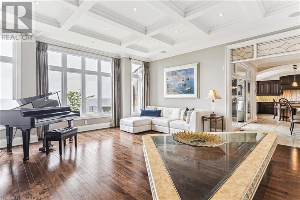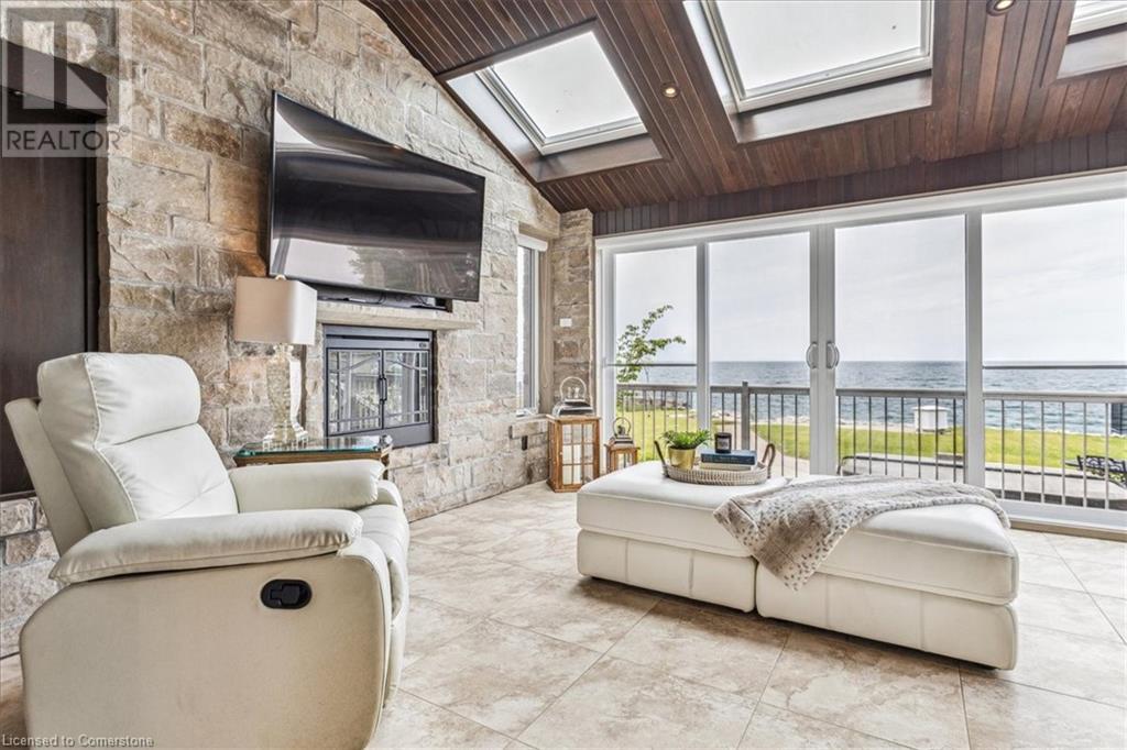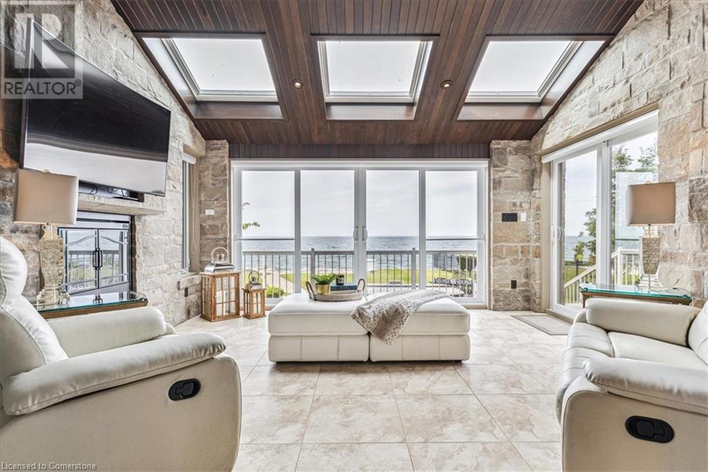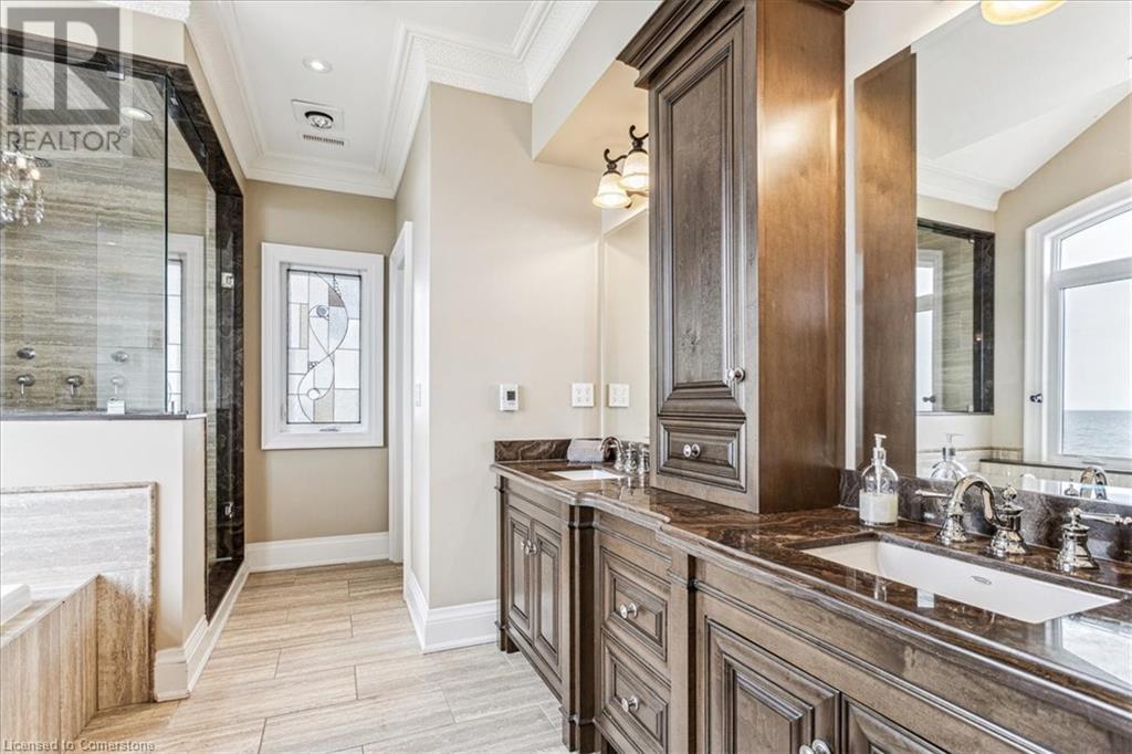 This is an Exceptional Custom built Lakefront home on the shores of Lake Ontario with a recently fortified Sea wall and stone steps to the water’s edge. Rarely does a home in this location, and of this caliber come to market. This home was built by the Home Builder for himself. Over 4700 sq ft above grade plus a partially finished basement. Truly a home to be viewed live to appreciate all the notable features that draw you in. High ceilings on all three levels with multi-layered tray and coffered ceilings, ease of access home elevator with four stops including the garage. The dream garage has three full spaces plus two car/boat power lifts for incredible utility and vehicle storage. Designer finishes throughout including granite, hardwood and porcelain floors, next level custom trim, ceiling and millwork unique only to this home, 3 gas fireplaces, 4 generous sized bedrooms all with ensuites, primary bedroom with walk-out to private balcony, main floor office with built-in cabinets, glass filled sunroom for maximum natural light and incredible views of the lake beyond, custom interior glass and transom windows, entertain in the dining room fit for a dozen or more guests, enjoy the indoor swim spa all year round, and the security of a whole home generator. This home just may have it all! (id:55009)