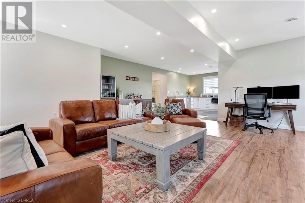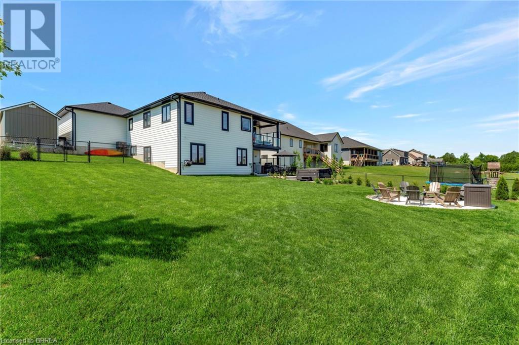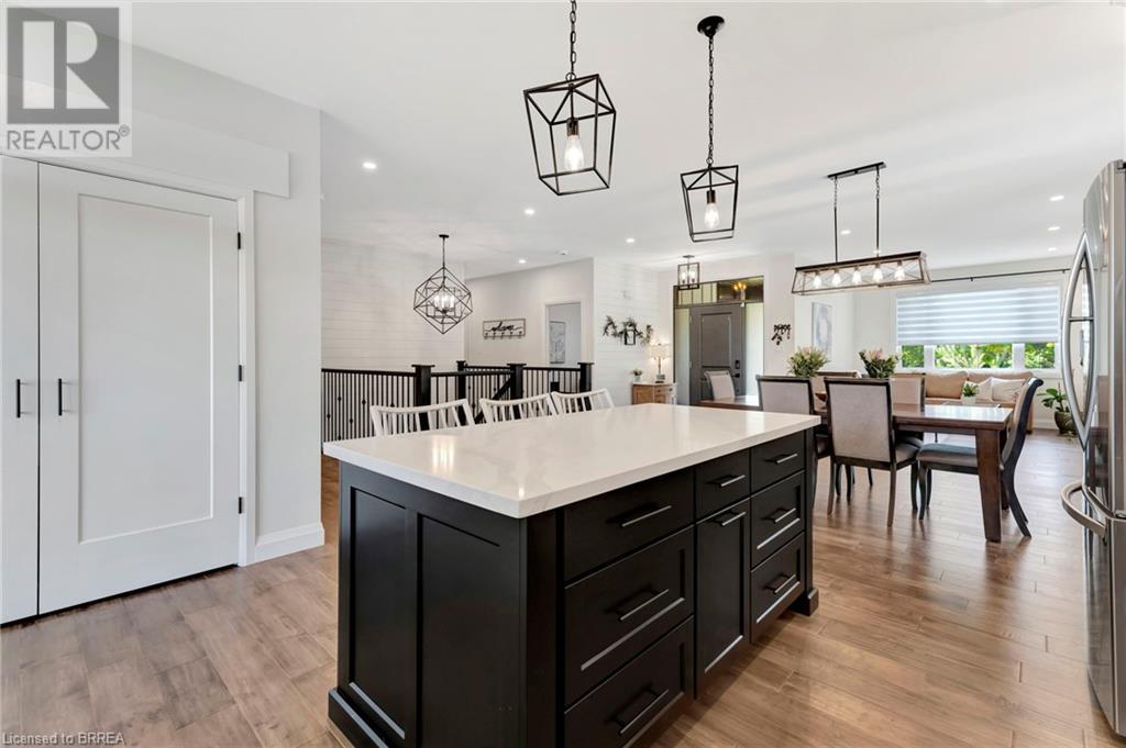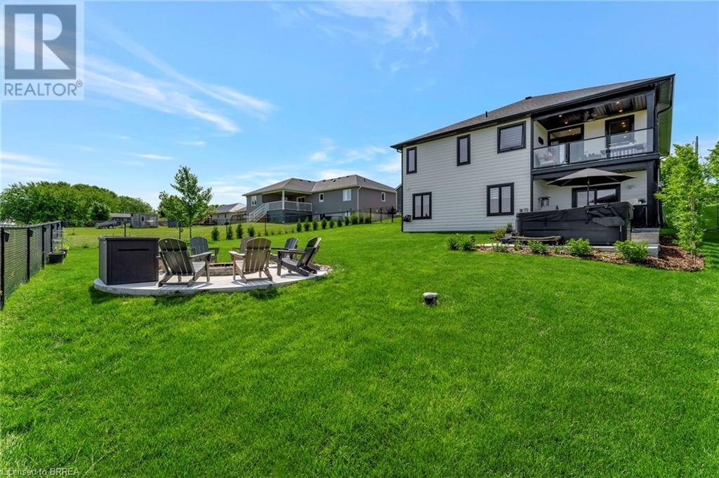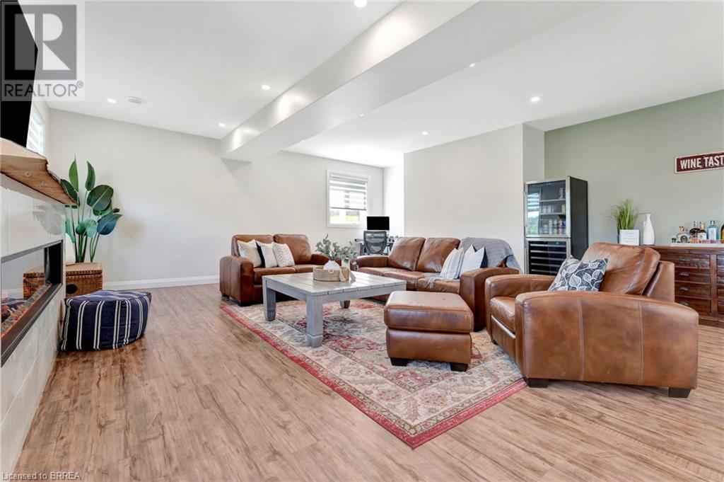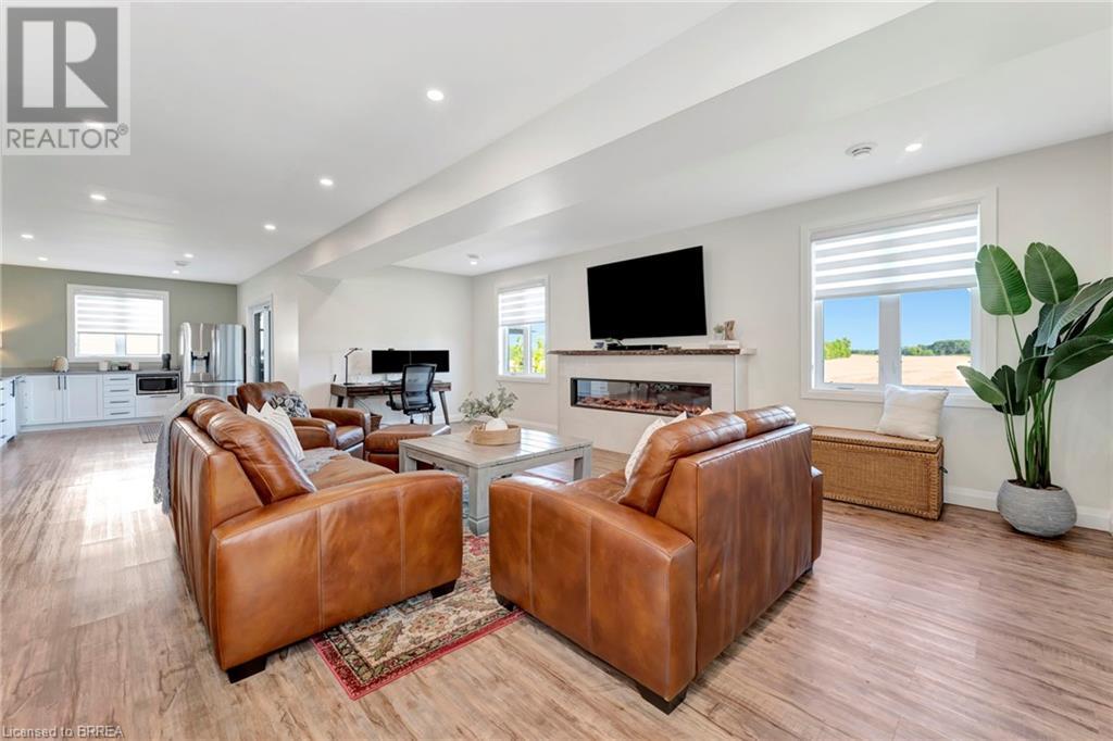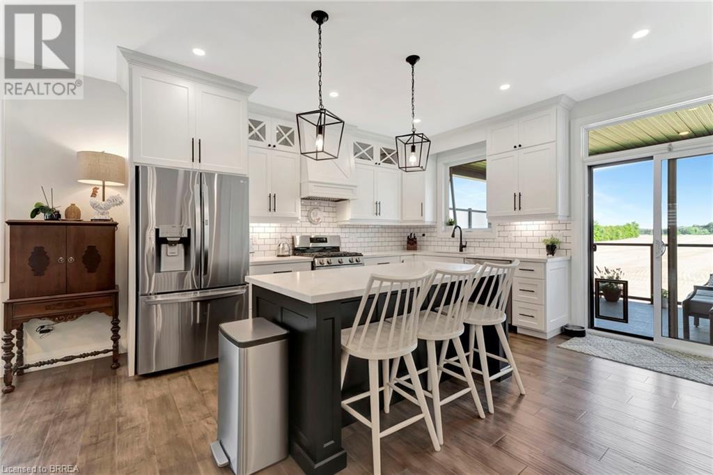 This exceptional home is a true gem, designed to impress with its stunning features and attention to detail. With over 3,000 sq ft of thoughtfully crafted living space, it offers both style and comfort. Step into the open-concept main floor, where elegant design meets modern convenience. You'll find a custom kitchen complete with extended height cabinets, upper glass door fronts, sleek quartz countertops, a classic subway tile backsplash, and a two-toned island—perfect for culinary adventures or casual dining. The spacious pantry adds a practical touch. The main floor flows seamlessly, enhanced by upgraded light fixtures and refined window treatments, leading to a bright and airy living space with walkout access to an elevated covered deck. Perfect for summer entertaining, it invites you to enjoy the best of indoor-outdoor living. The primary suite is a private oasis, featuring a luxurious 4-piece ensuite with a double vanity and a contemporary black hexagon-tiled shower and floors, providing a spa-like retreat at home. This level also offers two additional bedrooms, including a flexible space perfect for a home office, along with a stylish 4-piece bathroom and a convenient main-floor laundry room. Downstairs, the finished lower level is all about comfort and relaxation, boasting a large recreation room with a cozy fireplace, two additional bedrooms, and another chic 4-piece bathroom complete with a glass shower and double vanity. Step outside to the covered lower patio and enjoy the serene views of the surrounding fields or gather around the firepit for memorable evenings under the stars. (id:55009)