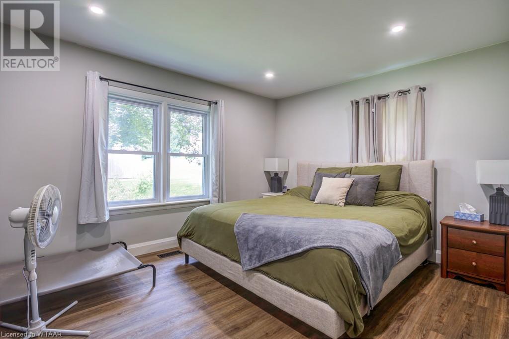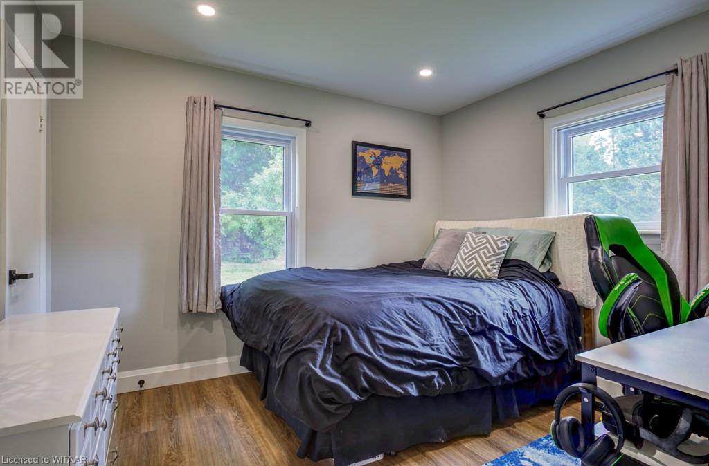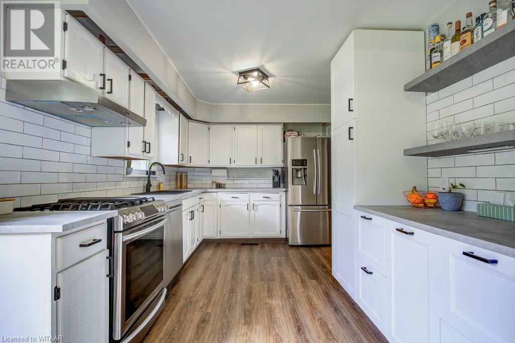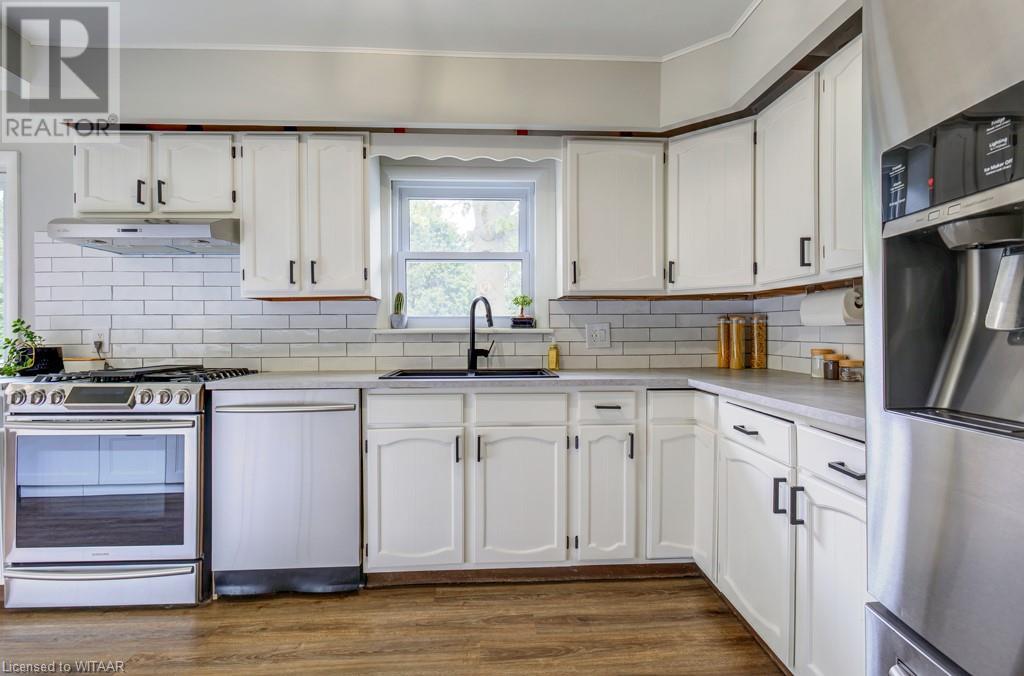 Discover this hidden gem, tucked away on a private dead-end road in a prime location of Tillsonburg. This charming 3-bedroom, 1-bath home sits on a nearly 3/4 acre lot adorned with mature trees, creating a serene, park-like setting while still being close to all amenities. The home boasts stylish interior enhancements that blend functionality and modern elegance. Most of the main level has undergone a total transformation, featuring new flooring, a complete bathroom overhaul with beautiful fixtures, and an incredible kitchen with new countertops, backsplash, ample storage, a coffee bar, and gleaming stainless steel appliances. Other significant updates include newer windows, a water softener, a patio door, a furnace (2019), central air (2020), and a 200-amp service. The upper level currently features one large bedroom and additional versatile space ideal for a hobby room or office. The high-ceiling, full basement layout, has a separate entrance and offers potential for extra storage or even more additional living space. The detached garage/shop, shed, and barn provide a world of possibilities for future enhancement to create the ultimate oasis, right in town. This property is truly, a rare and exceptional find. Come check it out! (id:55009)