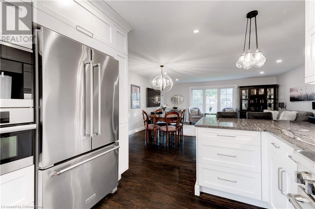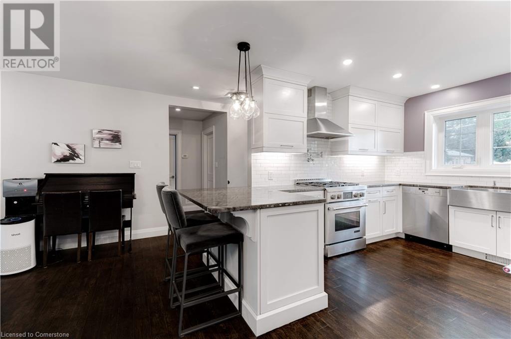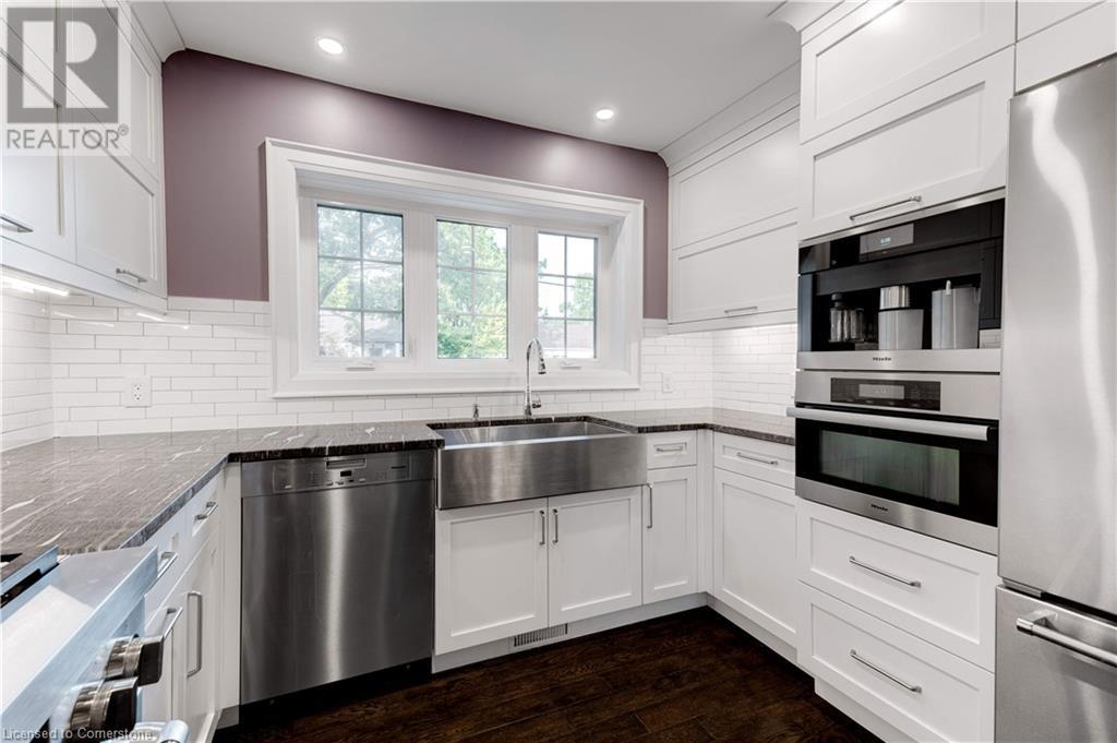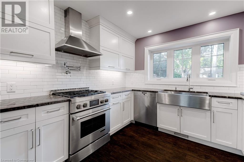 Timeless design with a perfect blend of traditional and contemporary elements and situated in the heart of downtown Burlington. The open concept main floor features well-proportioned rooms, featuring a magnificent great room, kitchen, two bedrooms including an ensuite bath in the primary bedroom. Main floor den/ office with wall of windows and a walkout to a private lush setting. The fully finished lower level offers great versatility, potential income or in-law suite. This level features a 3rd bedroom, kitchenette, bathroom, family room, laundry & storage. Experience the taste of local restaurants, Art Centre, shop at trendy stores and enjoy the summer festivities at Spencer Smith Lakefront Park. (id:55009)