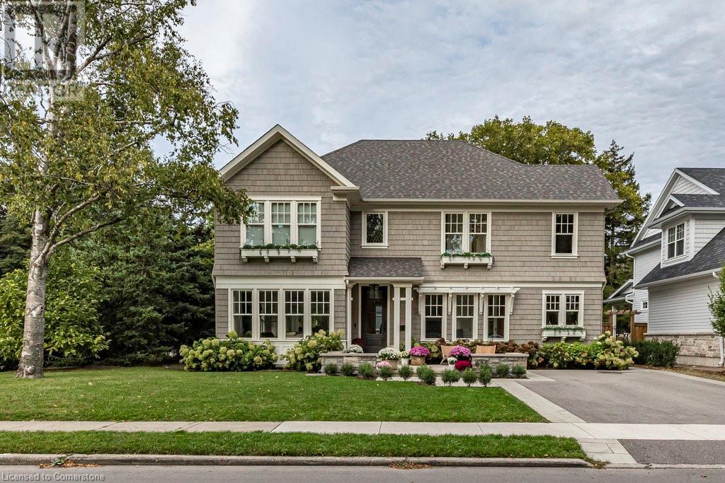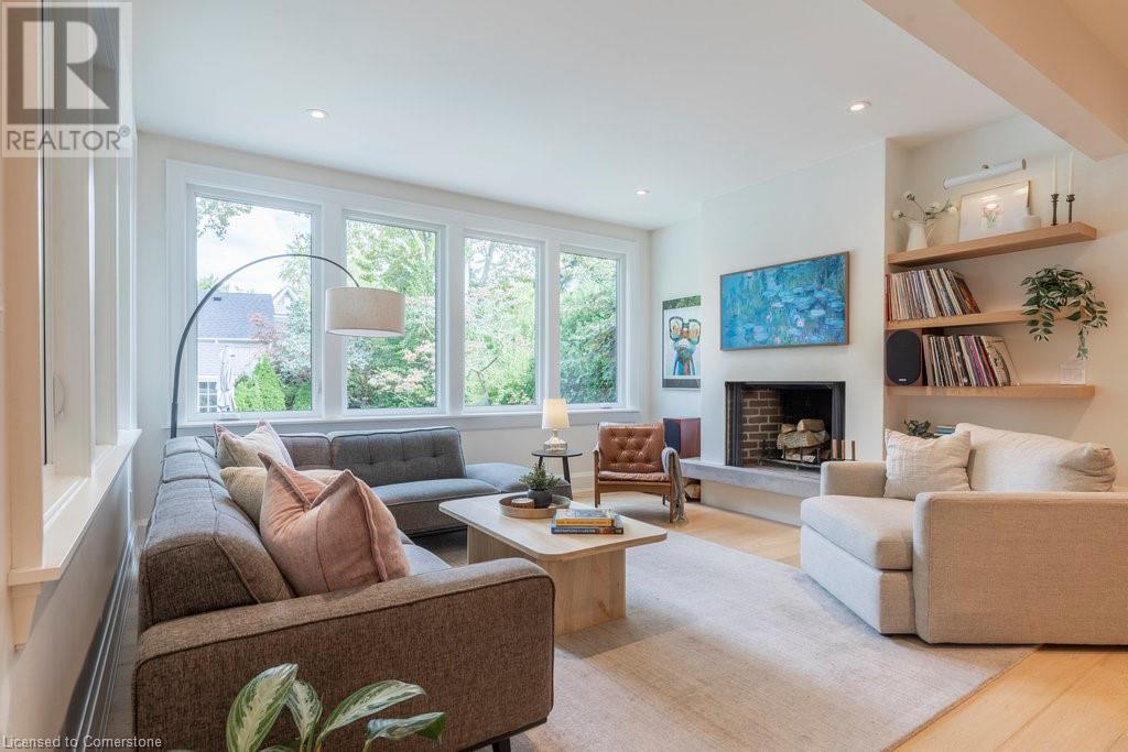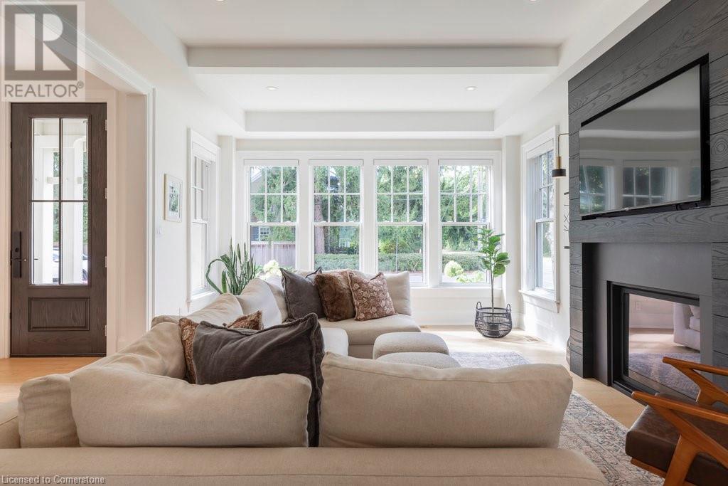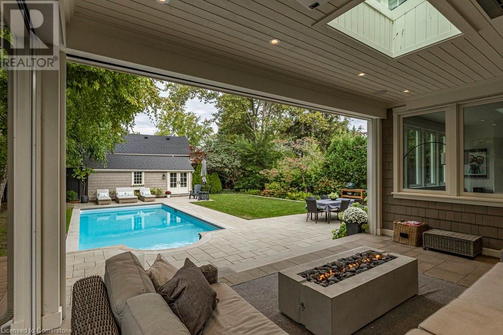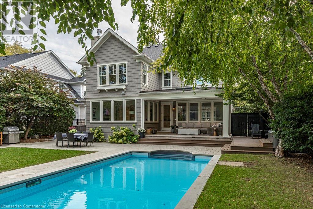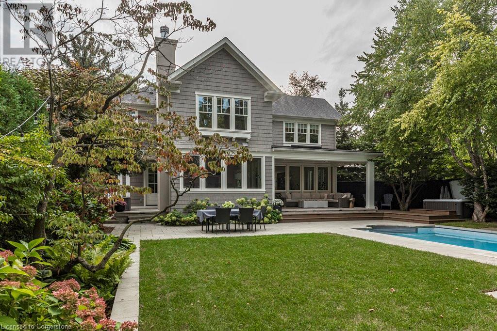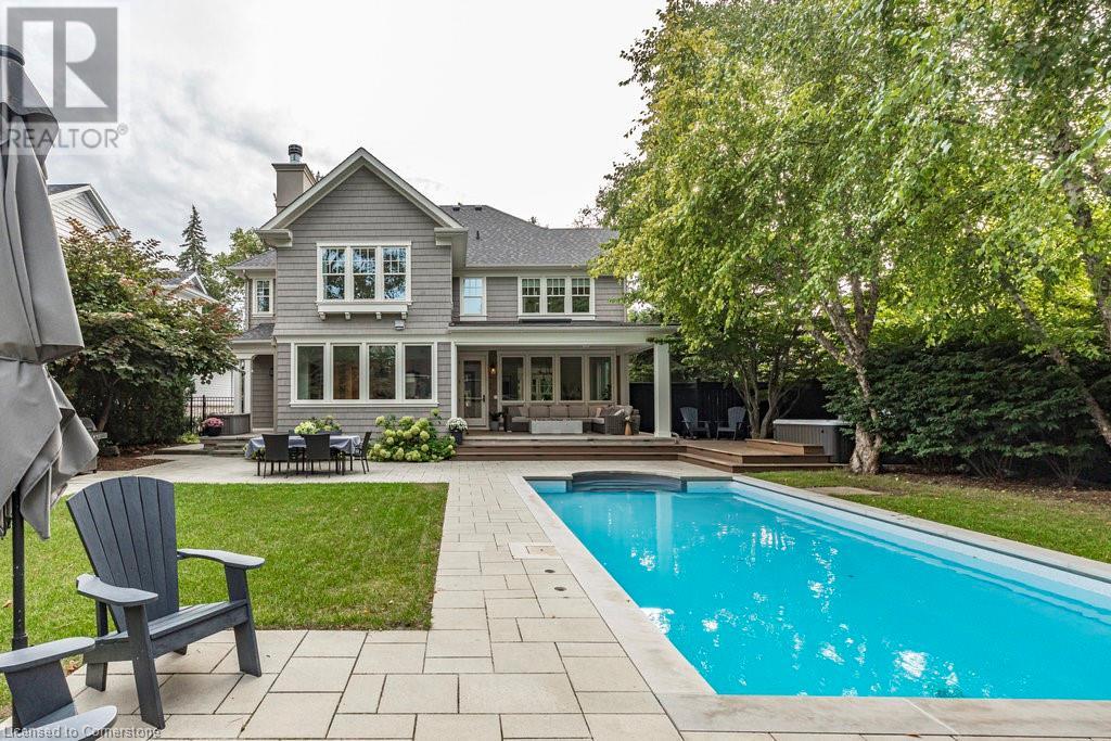 Experience luxury, comfort, and practicality in this custom home designed by award-winning architect John Williams in downtown Burlington. With over 50 windows, the home is bathed in natural light, creating a bright and airy atmosphere. Every detail in this one-of-a-kind gem reflects thoughtful design and quality craftsmanship. Upon entering, you'll notice the difference a custom-built home makes. The layout is ideal for growing families and entertaining, featuring heated floors, a spacious walk-in pantry with a second fridge, and a convenient water bottle refill station. A separate mudroom entrance adds extra storage to keep your family organized. The home exudes charm and character rarely found in newer builds. The open-concept kitchen centers around a traditional wood-burning fireplace, perfect for family gatherings or quiet evenings. A separate family room and main floor office or craft room provide additional functionality. Upstairs, there are four spacious bedrooms, including a luxurious primary suite. The three beautifully designed bathrooms feature rain showers for a spa-like experience. The backyard is a private oasis, professionally landscaped with mature trees. It includes a newly lined pool, hot tub, and a heated covered porch equipped with automated screens, a projector, and a gas fire pit—ideal for year-round relaxation or entertaining. At the front, an oversized courtyard sitting area offers a peaceful retreat. The detached single-car garage comes with a Tesla charger, and there's parking for four cars, ensuring ample space for family and guests. Additionally, the unfinished lower level with 9-foot ceilings provides incredible potential to expand and add value to this remarkable property. (id:55009)