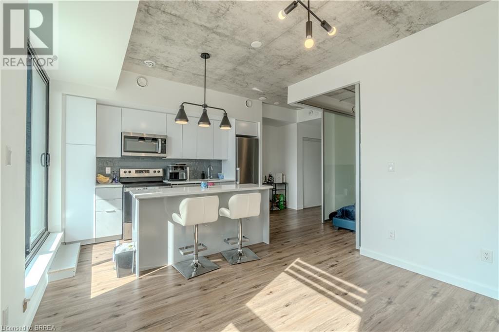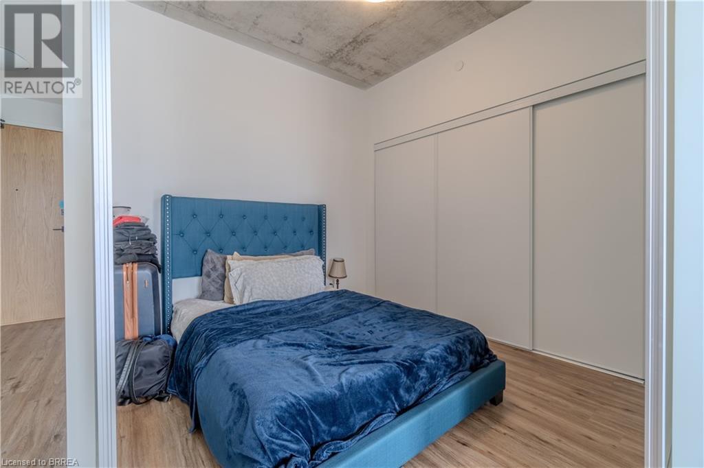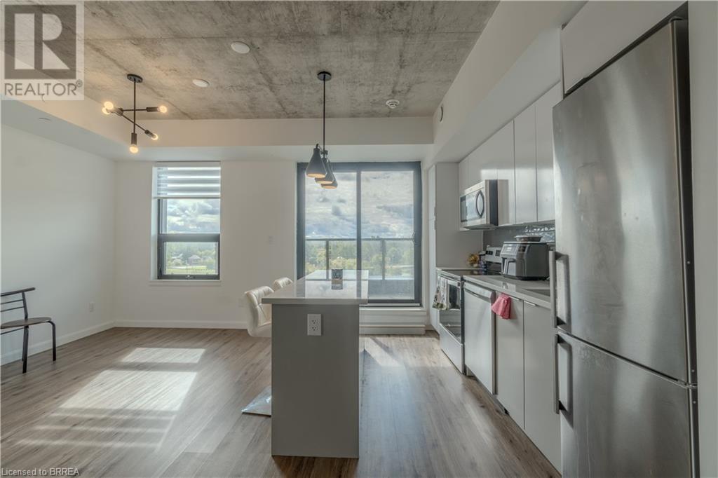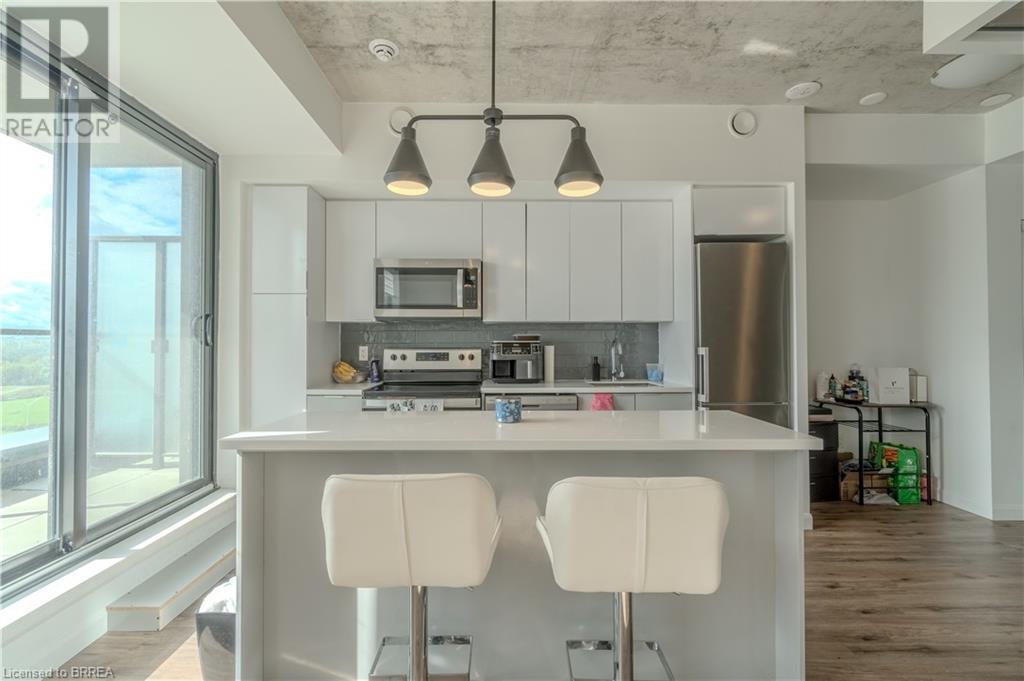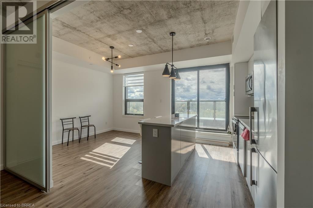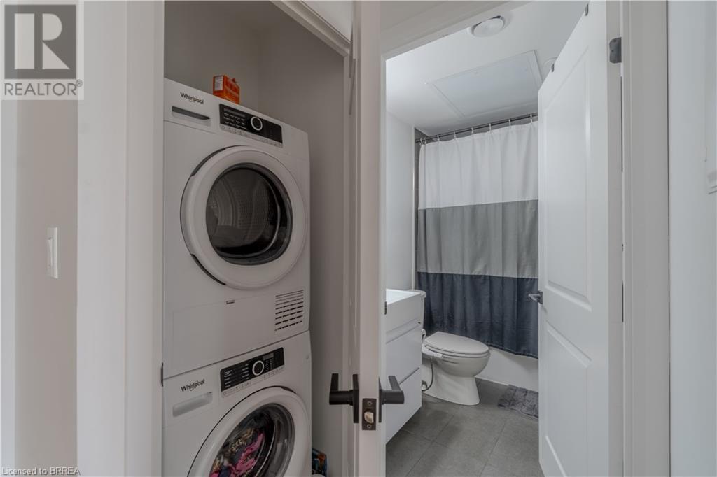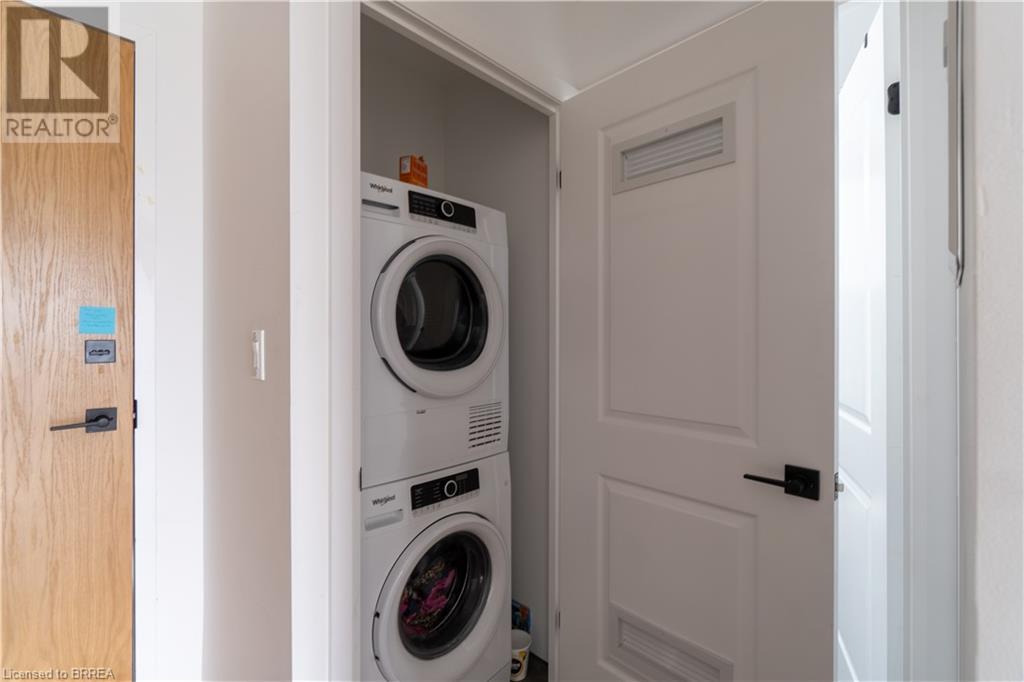 Welcome to your stylish urban retreat at 7 Erie Ave in Brantford! This modern 1-bedroom, 1-bathroom condo offers contemporary living with sleek finishes, an open-concept layout, and large windows that fill the space with natural light. The kitchen features stainless steel appliances, quartz countertops, and ample cabinet space, flowing into a cozy living area with access to a private balcony. The bedroom includes generous closet space. In-suite laundry adds convenience, and residents enjoy access to premium amenities such as a fitness center, social lounge, and secure parking. Located near the Grand River, parks, schools, public transit, and downtown amenities. (id:55009)