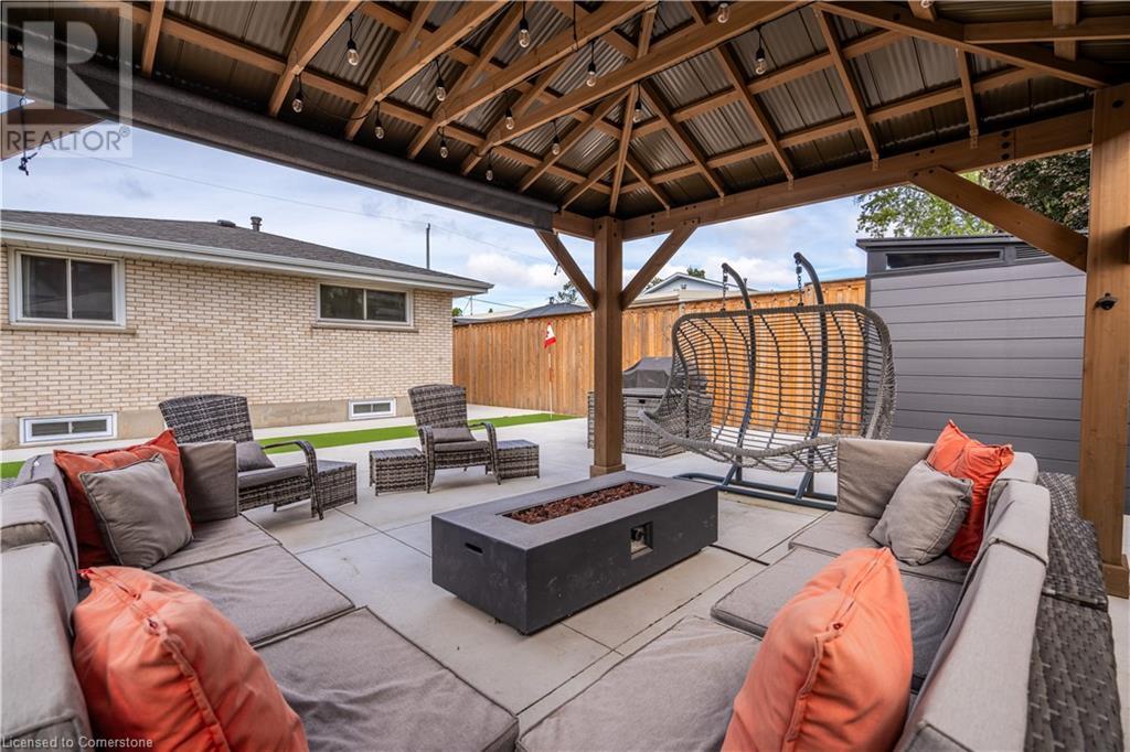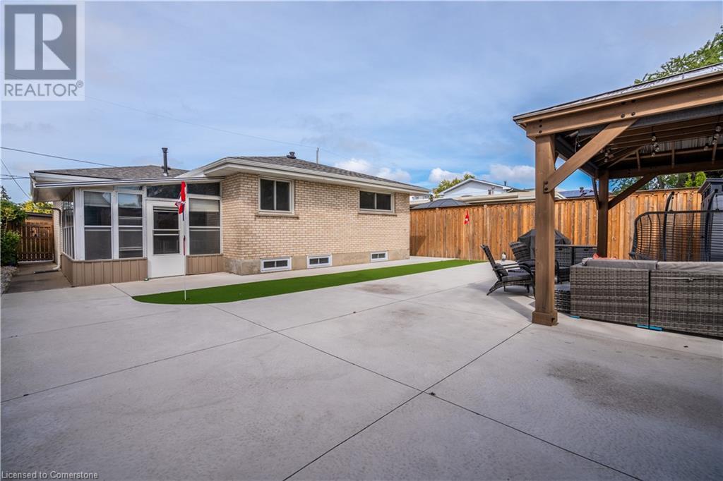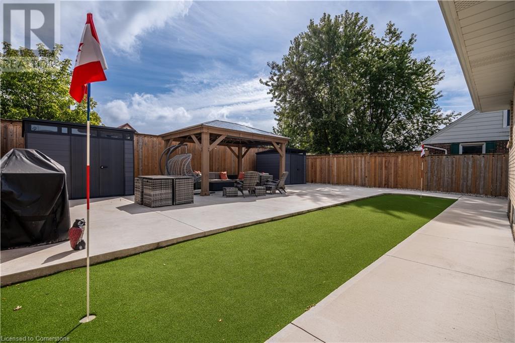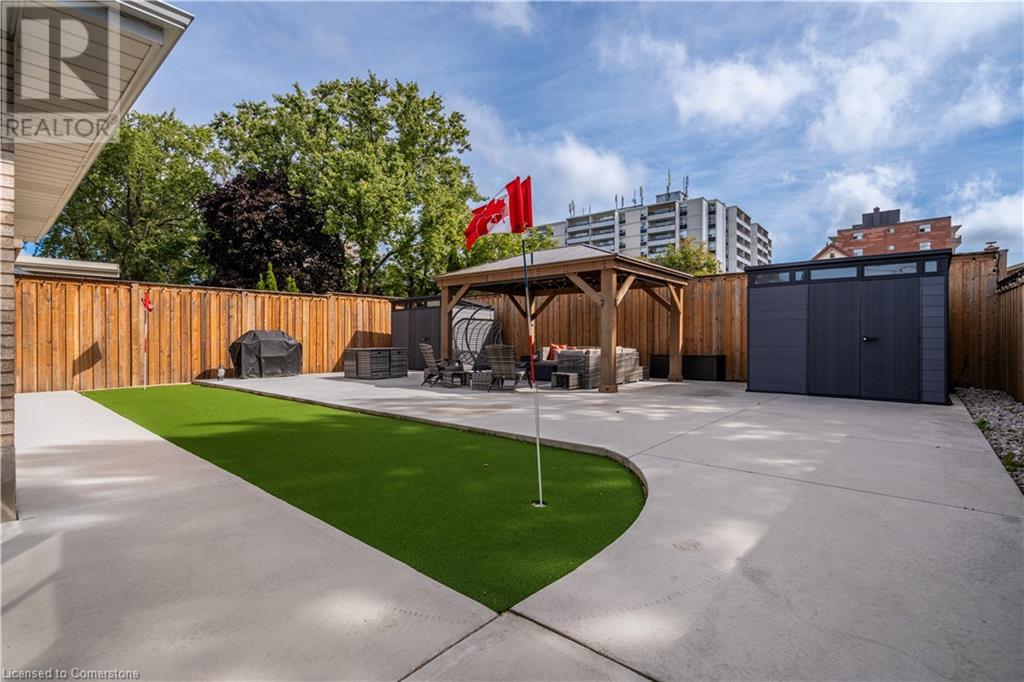 Located on a quiet Crescent in the family-friendly Lawfield neighbourhood, this raised bungalow has impressive curb appeal. Entering within the foyer, you will be warmly welcomed by a stone accent wall before heading up into the living/dining that is flooded with bay window's natural light. The main floor consists of a living/dining, kitchen, 3 good-sized bedrooms, and a 4 piece bath. Making your way downstairs, you will find a fully renovated lower level w/ a large rec room w/ fireplace, bedroom w/ massive walk-in closet, 3 piece bath w/ heated floors, oversized laundry room and separate entrance up to sunroom for potential in-law suite. Finish your days off and enjoy weekends in the backyard oasis, an entertainer's and golfer's dream with a large cabana and putting greens! Just minutes away from schools, shopping, highway access, amenities and more. Sq Ft Approximate. (id:55009)
