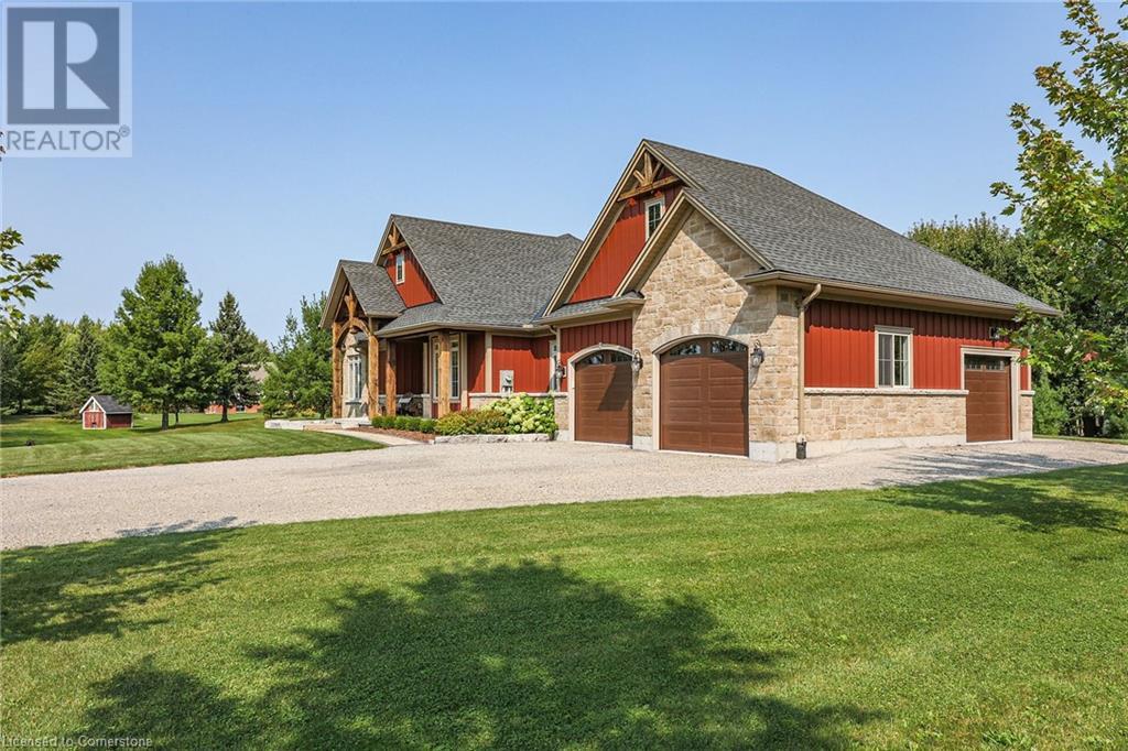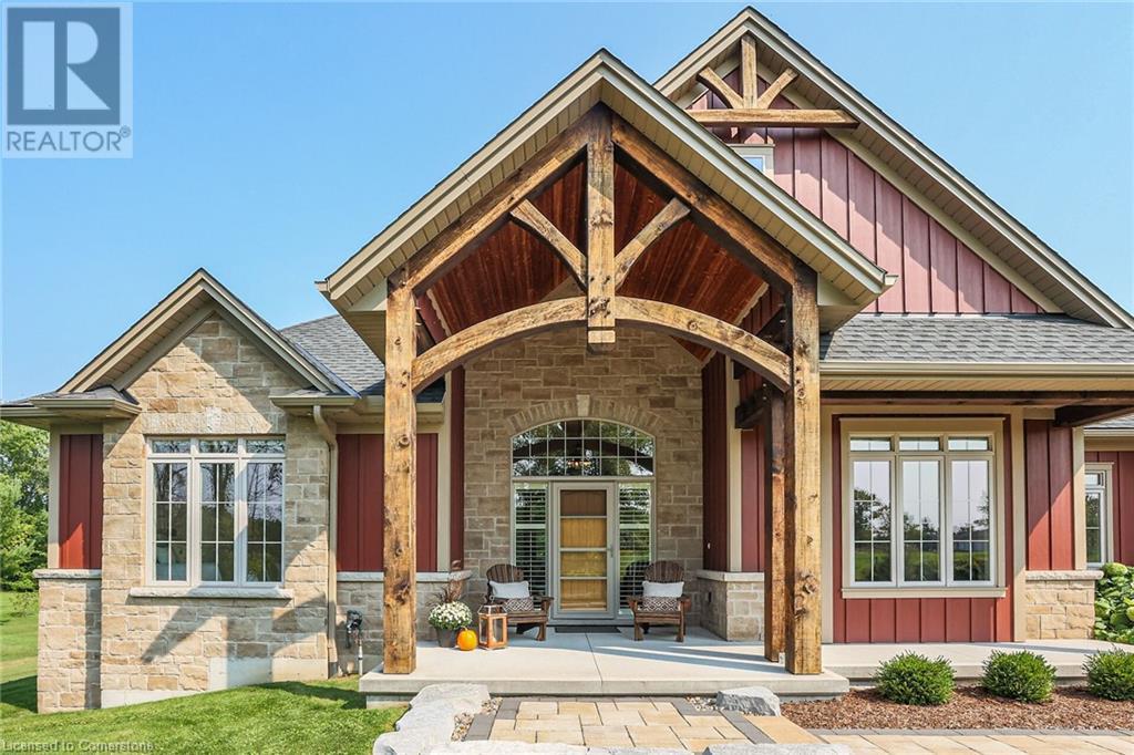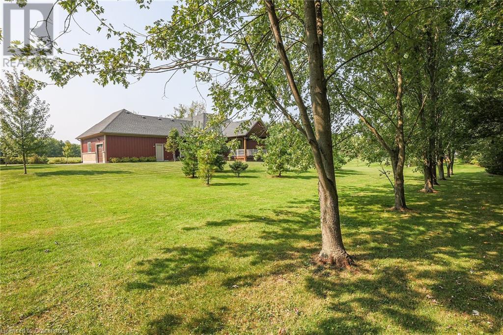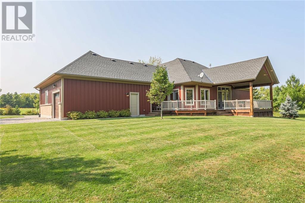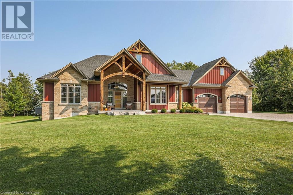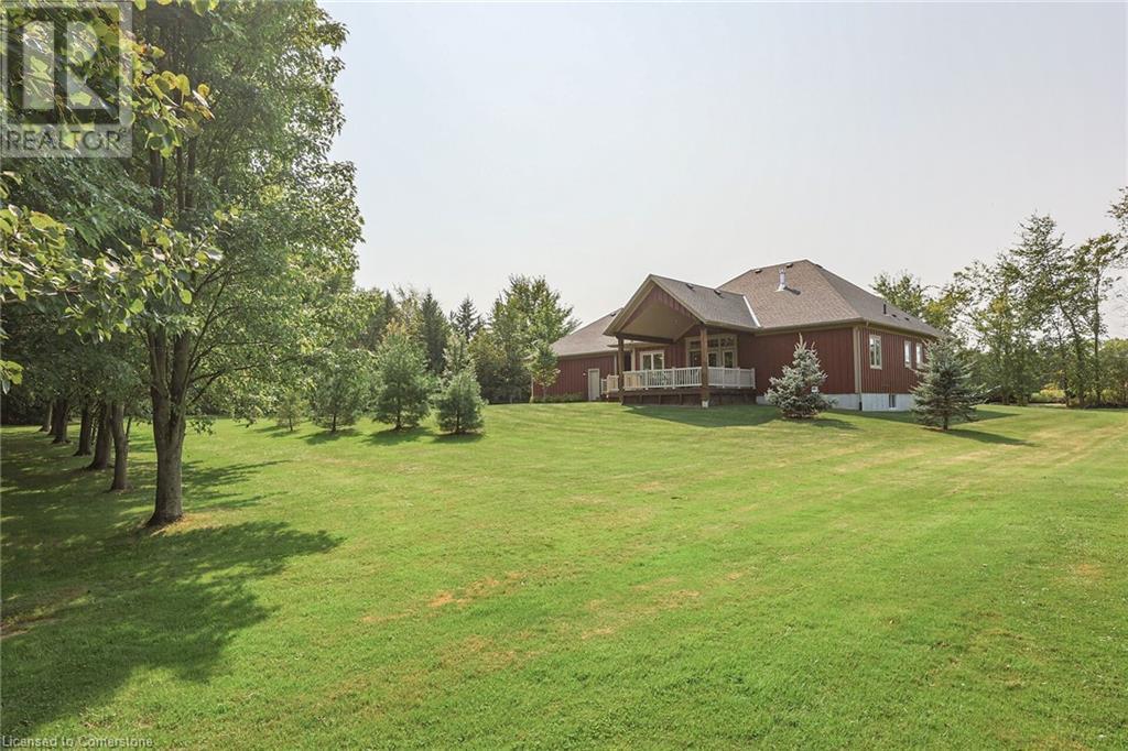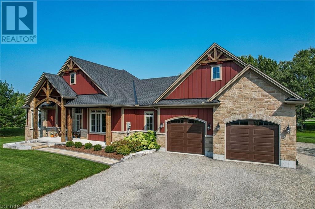 ‘Rarely offered’ custom executive bungalow in the desirable hamlet of Byng – just minutes to the Dunnville town core. Built in 2018, this attractive home sits on a treed lot of nearly one acre adjacent to Byng Conservation Park and steps to the Grand River. A timber-framed covered porch offers a “Grand” welcome into a defined foyer accented w/ crown moulding & arched openings. Your eyes are drawn to the soaring cathedral ceiling of the living room tastefully finished w/ t&g pine, wood beam accents, and a cozy stone gas f/p. Seamlessly connected to a dining area, featuring a tray ceiling, overlooks the rear yard. The ‘magazine-worthy’ kitchen offers ample cabinetry, quartz countertops, breakfast peninsula, & warm lighting. The master bedroom is located right off the living room & is spacious in size, finished with carpeting & crown moulding, & has a large walk-in closet, and a 4pc ensuite. MF is completed w/ a second bedroom, 2pc bath/laundry combo, and a front den/office that could be converted into a 3rd bedroom. Basement is a clean slate awaiting your finishes – has vinyl flooring and rough in bath. Garage has a tonne of room (29x26) with three wood grain overhead doors. Extras: upgraded Hardie board siding, 280sf of composite decking, 9’ ceilings thru-out, 200AMP hydro service, 6000+gallon cistern, +++! Seize this opportunity where luxury meets nature, & location meets convenience! (id:55009)