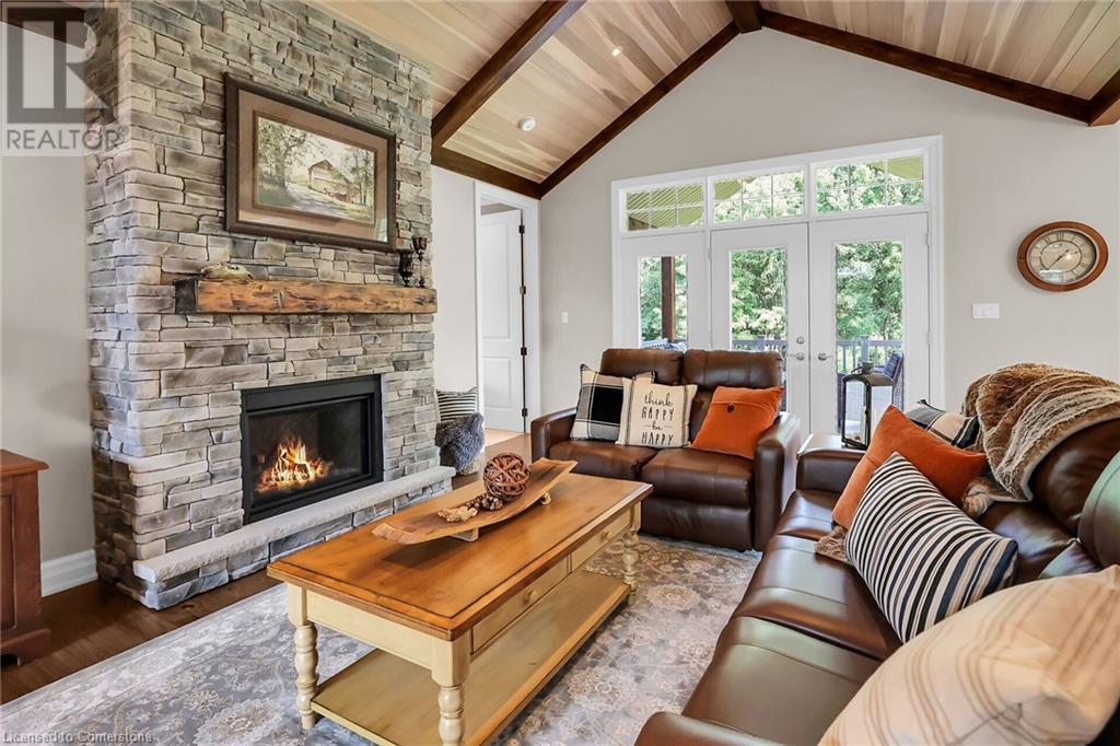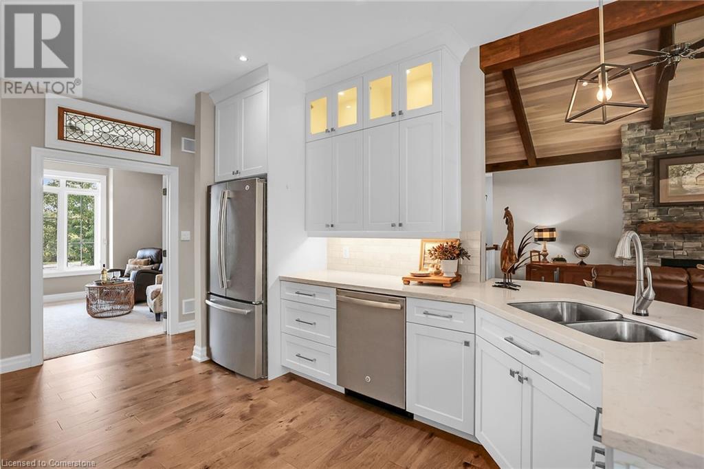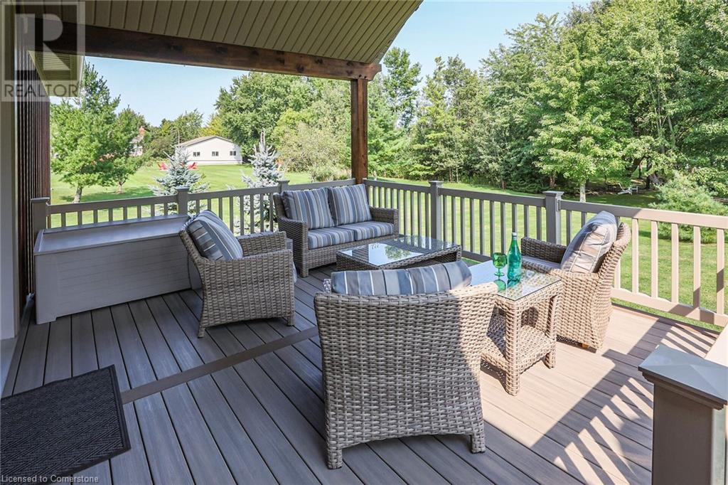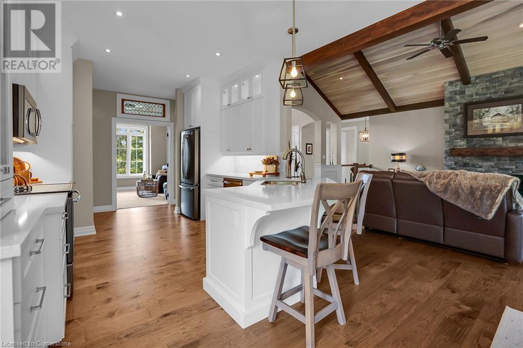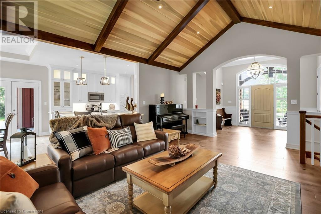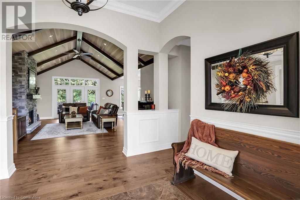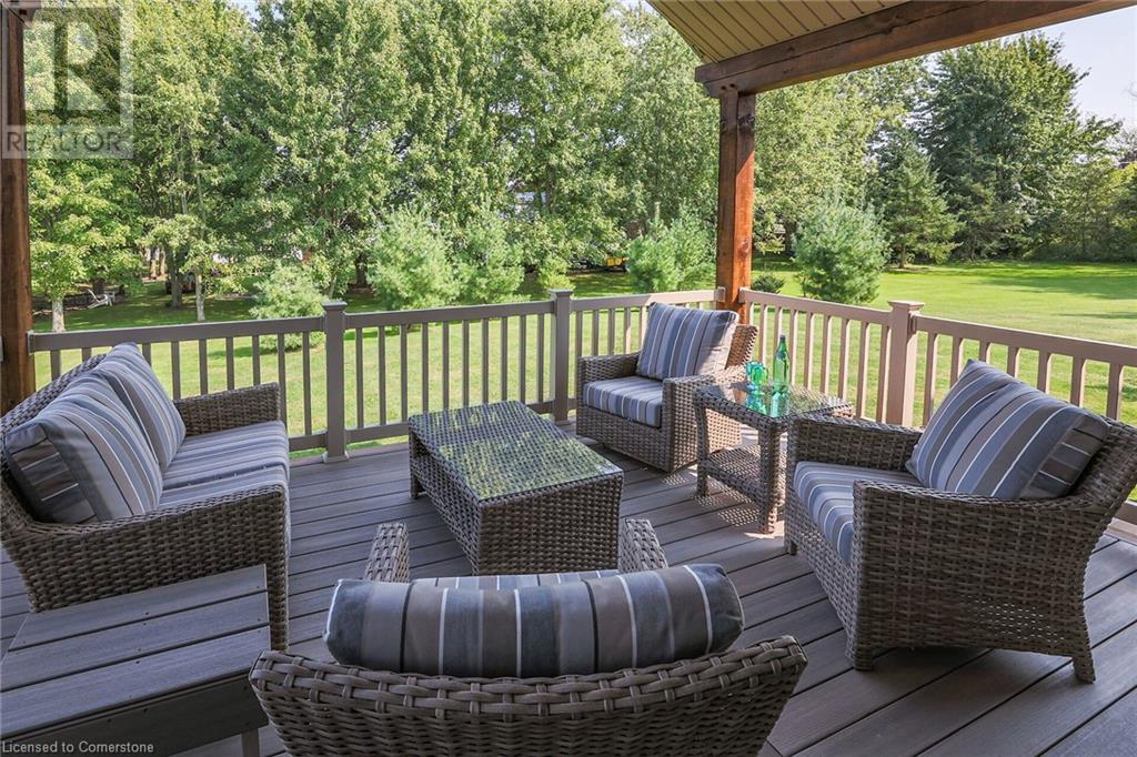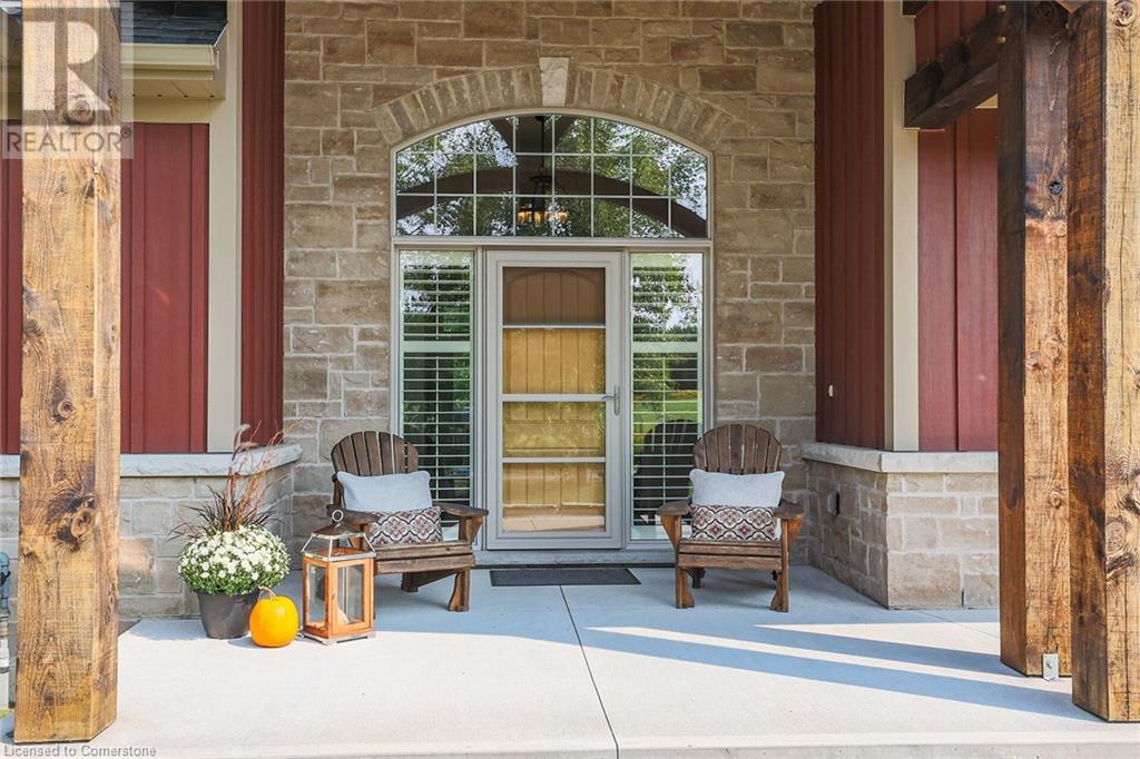 ‘Rarely offered’ custom executive bungalow in the desirable hamlet of Byng – just minutes to the Dunnville town core. Built in 2018, this attractive home sits on a treed lot of nearly one acre adjacent to Byng Conservation Park and steps to the Grand River. A timber-framed covered porch offers a “Grand” welcome into a defined foyer accented w/ crown moulding & arched openings. Your eyes are drawn to the soaring cathedral ceiling of the living room tastefully finished w/ t&g pine, wood beam accents, and a cozy stone gas f/p. Seamlessly connected to a dining area, featuring a tray ceiling, overlooks the rear yard. The ‘magazine-worthy’ kitchen offers ample cabinetry, quartz countertops, breakfast peninsula, & warm lighting. The master bedroom is located right off the living room & is spacious in size, finished with carpeting & crown moulding, & has a large walk-in closet, and a 4pc ensuite. MF is completed w/ a second bedroom, 2pc bath/laundry combo, and a front den/office that could be converted into a 3rd bedroom. Basement is a clean slate awaiting your finishes – has vinyl flooring and rough in bath. Garage has a tonne of room (29x26) with three wood grain overhead doors. Extras: upgraded Hardie board siding, 280sf of composite decking, 9’ ceilings thru-out, 200AMP hydro service, 6000+gallon cistern, +++! Seize this opportunity where luxury meets nature, & location meets convenience! (id:55009)