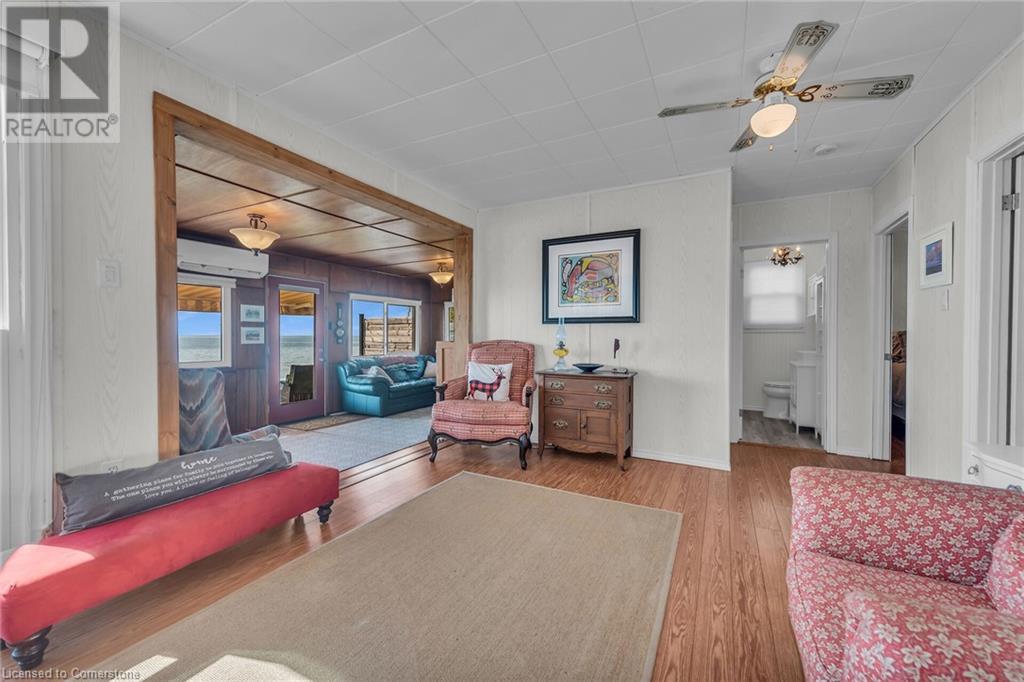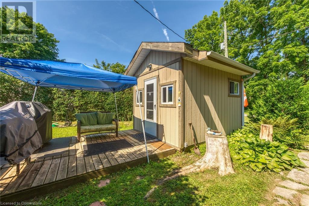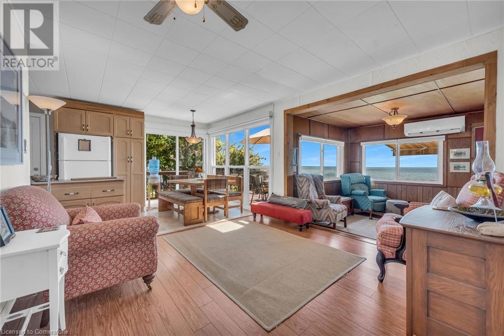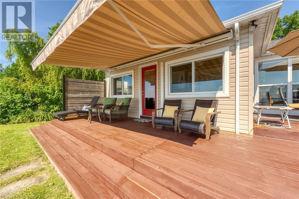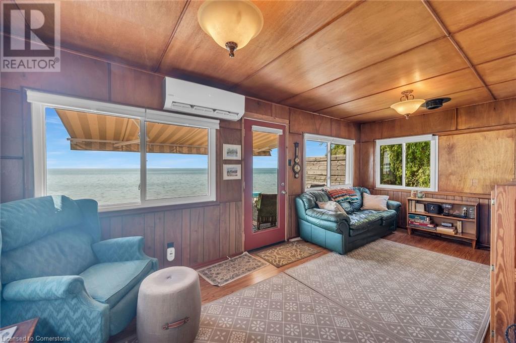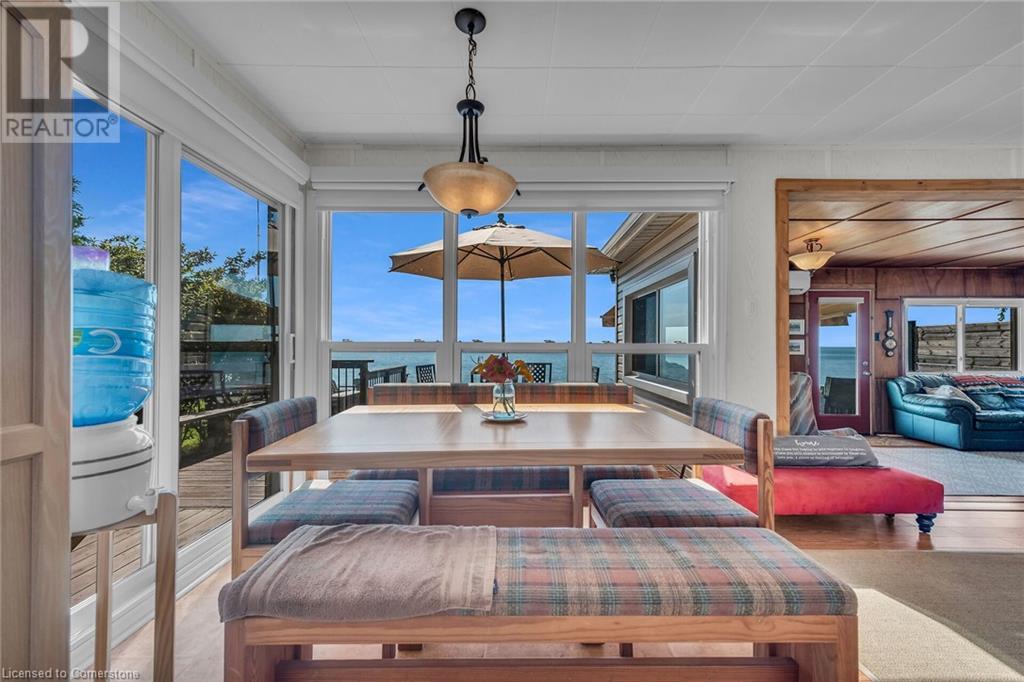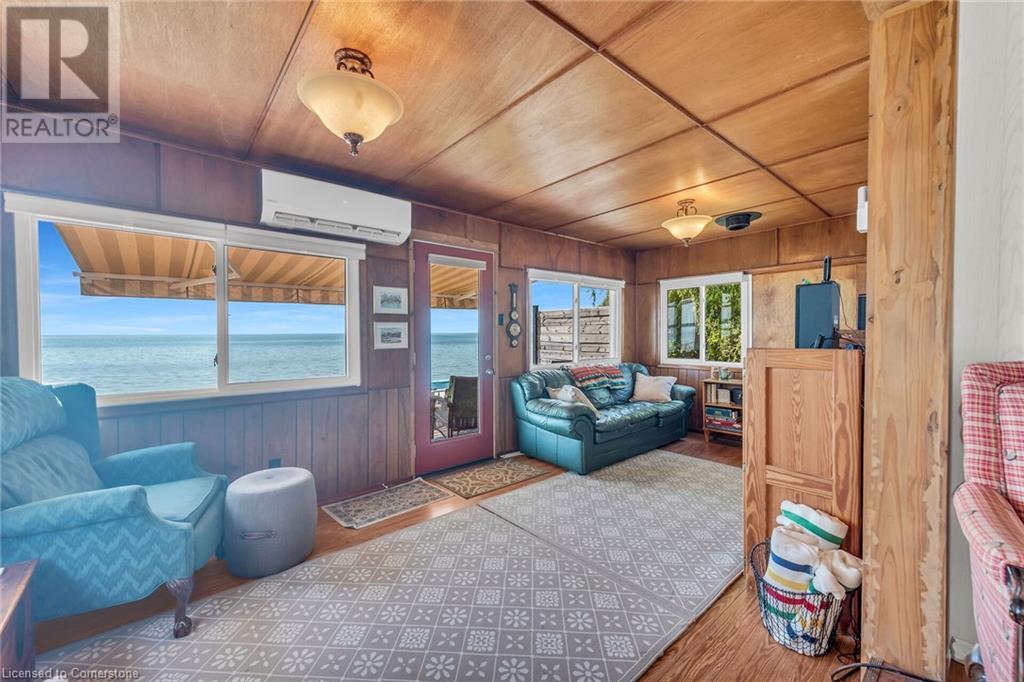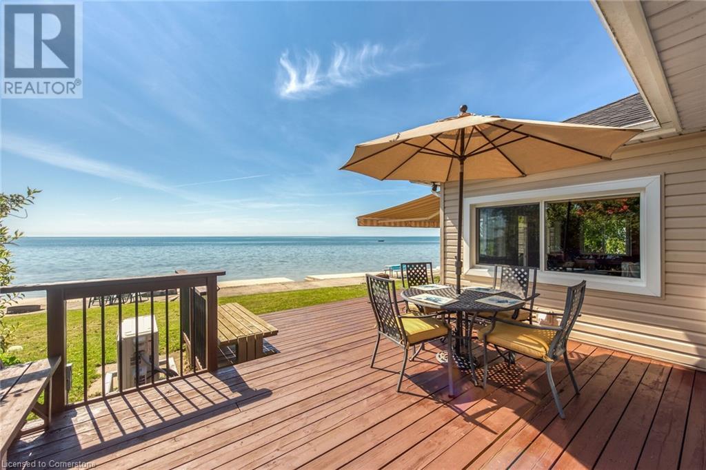 Discover a prized Lake Erie “Gem” tucked away off Lakeshore Road enjoying frontage near end of secluded, private lane. This waterfront “Treasure” reflects immense pride of lengthy ownership incs immaculate maintained 800sf cottage positioned proudly on 0.28 ac lot extending into beyond shoreline. Highlighted w/520sf freshly painted, lake facing entertainment deck-2010 shaded w/power sun awning - overlooking low profile terrain leads to recently improved/poured concrete break-wall-2020 w/staircase accessing smooth flat rock beach. If a surprise family or friends showing up unexpectedly - there is a 10x12 tastefully appointed bunkie! A plethora of oversized newer windows & patio door walk-outs-2019 promote bright interior ambience ensuring panoramic water views from most every vantage point. Introduces uncomplicated design incs fully equipped kitchen - segues to comfortable dining/living area - continues to radiant insulated sunroom boasting a sea of windows & p/g free-standing fireplace-2018. Completed w/3 bedrooms & totally renovated/stylish 4pc bath. Loaded w/notable extras inc - ductless HVAC heat/cool system-2022, window blinds-2019, vinyl exterior siding-2019, roof-2008, cinder block foundation w/accessible crawl space, upgraded 100 amp hydro-2010, 2000g cistern, economic septic (no costly pump-outs), triple wide driveway plus majority of furnishings. 50 mins commute to Hamilton, Brantford & 403 - 15 mins W/Dunnville & E of Knight’s Beach. Your Lake Escape has been Found! (id:55009)
