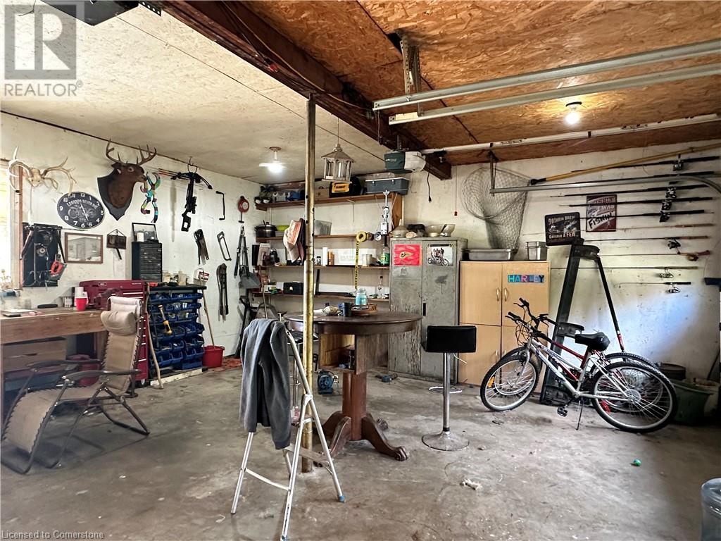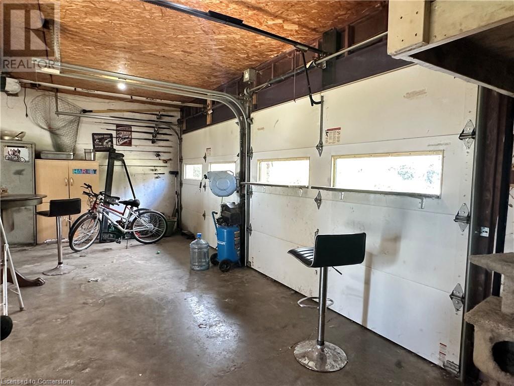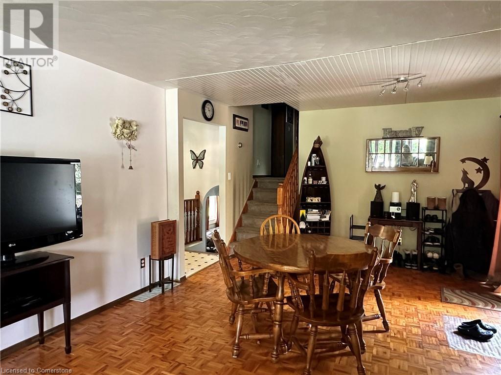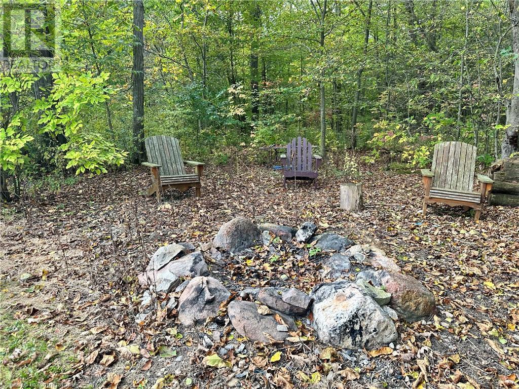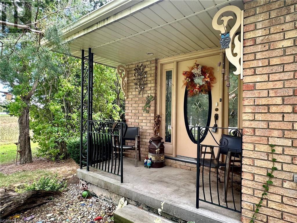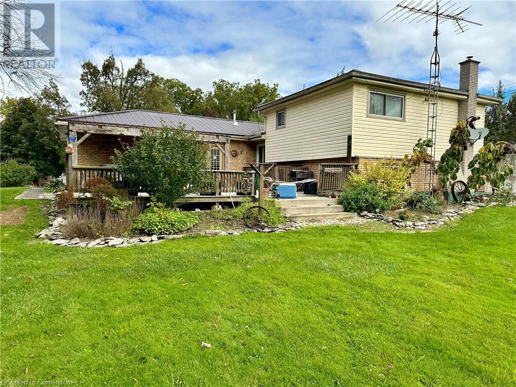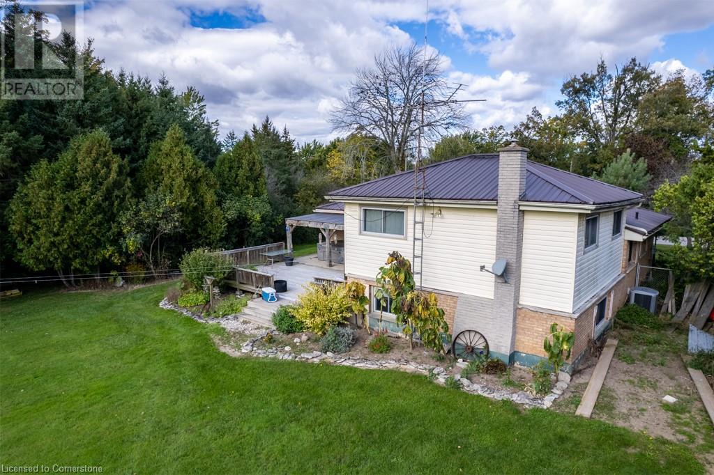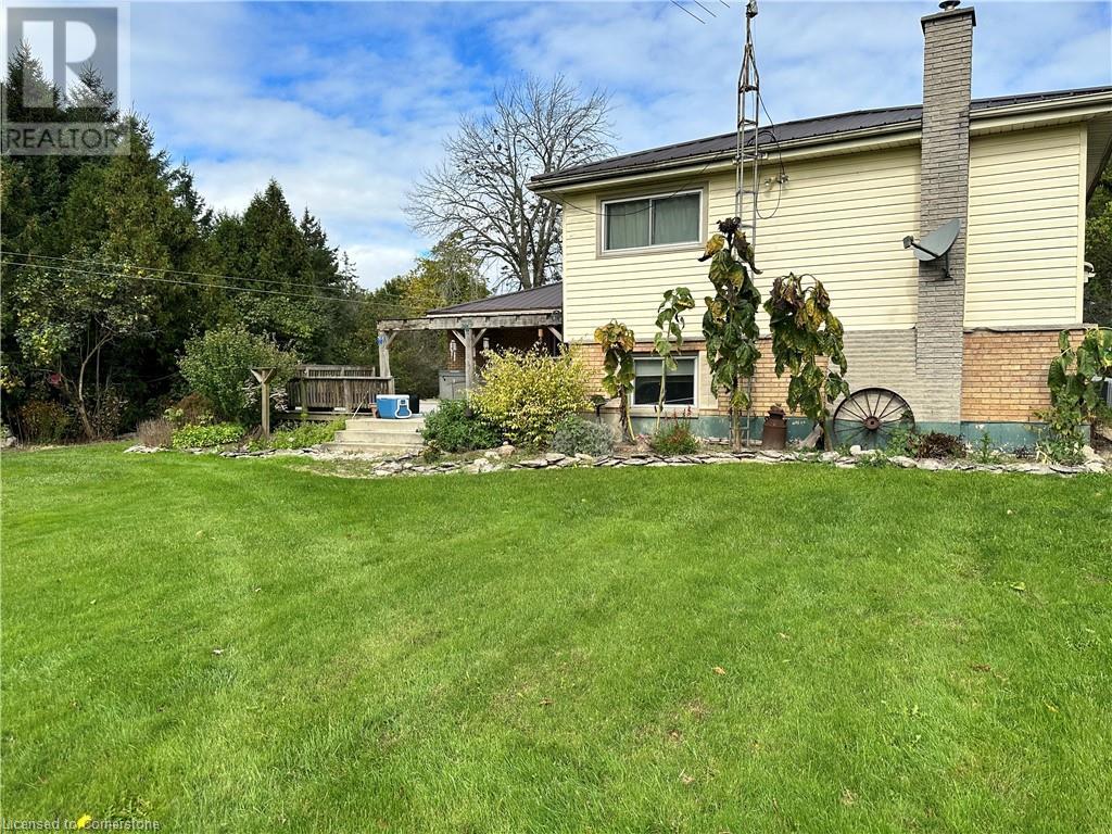 Ideal multi level on sought after mature country lot. Offers wide open southern views over farm fields-plus neighbouring forest on the west blocks prevailing winds and provides great privacy. The wide paved drive leads to brick home with covered front porch and oversized 2 car garage . Inside the main floor eat in kitchen with white cabinetry living room / dining room slider to roomy deck with hot tub. The lower lever features a rec room with natural gas fire place, a second bath, a den (or 4th bedroom) and walk up to the side yard. The basement offers a cedar sauna, a hobby room with natural gas stove on a brick hearth and a bonus second walk up to the garage. Other features include a 2019 metal roof and recent garage door! (id:55009)
