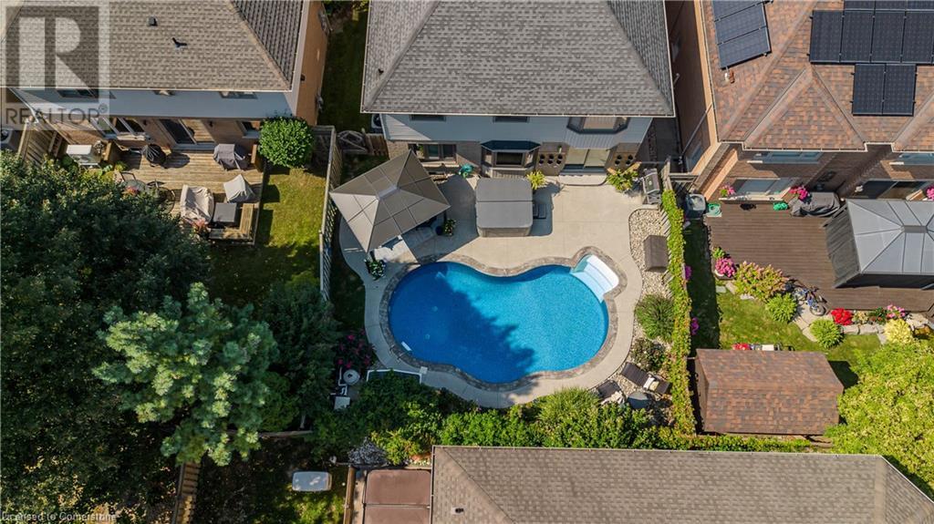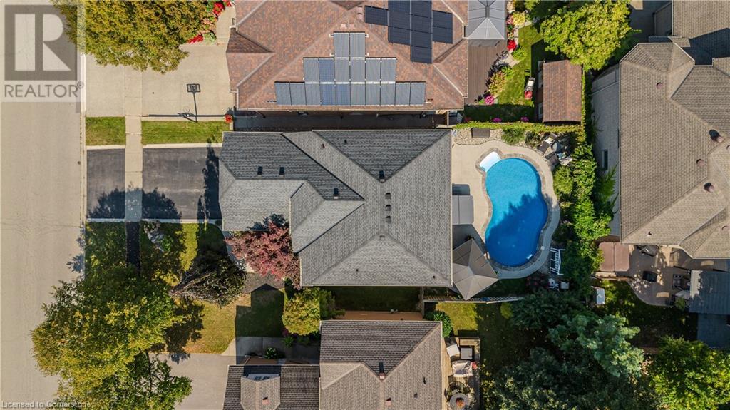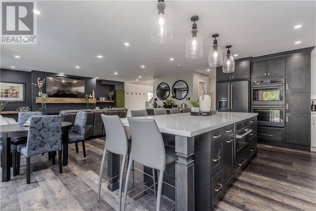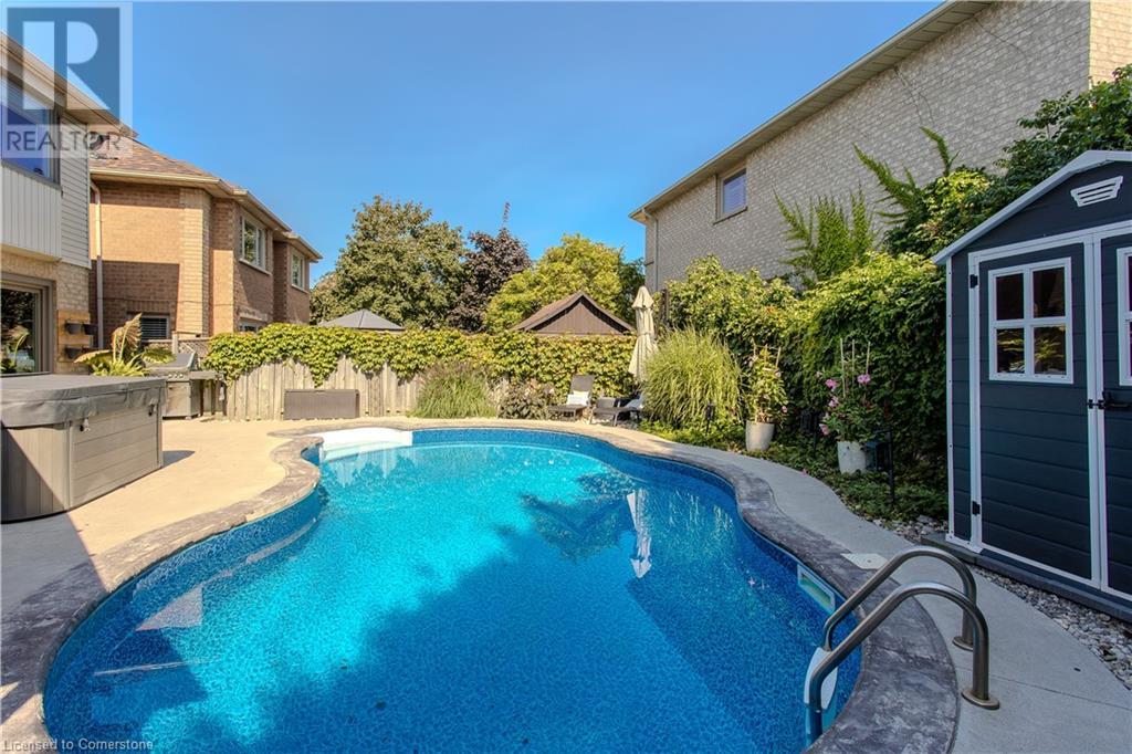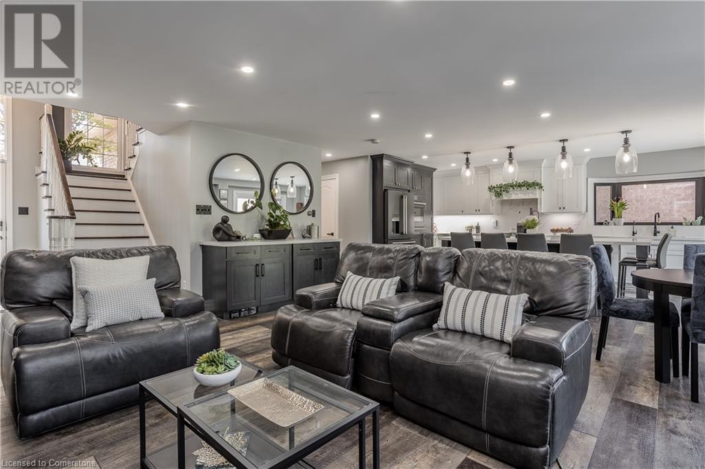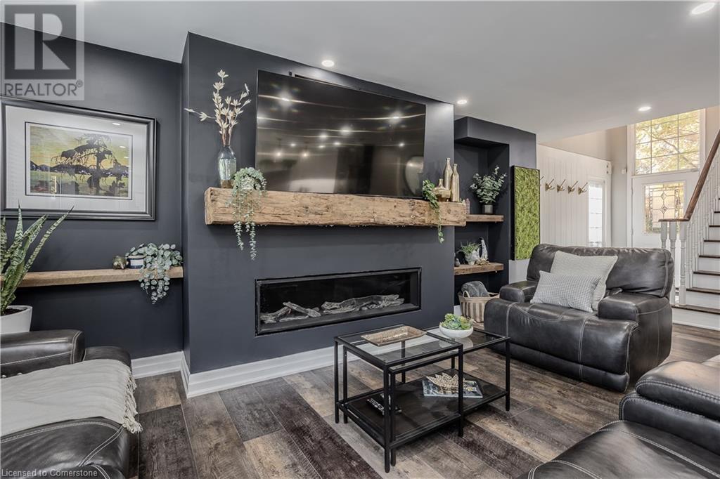 Inviting 2-storey home in family-friendly Waterdown neighborhood, the professionally landscaped front yard greets you with perennial gardens, mature trees & concrete walkway leading to a garage with inside entry. Enter the soaring front foyer with vaulted ceilings, into the main floor, beautifully updated in 2021, feat an open-concept layout with pot lights & wide plank luxury vinyl flooring. The Living/dining room incl a 63” long contemporary gas FP and bay window. Open to the amazing eat in kitchen boasting custom cabinetry w soft-close drawers, waterfall quartz countertops and matching backsplash, a large island with a breakfast bar, coffee bar/buffet & GE Café appliances incl double ovens & beverage fridge. Enjoy easy access to the fully fenced, private rear yard incl an inground pool, hot tub, gazebo & gas BBQ hookup. Upstairs, the generous great room above the garage feat hardwood floors, fireplace & vaulted ceiling. The second level also incl engineered hardwood floors. The primary suite incl a 5PC ensuite, 3 additional bedrooms & 3PC main bathroom. The finished basement adds additional living space w rec/family room, additional bedroom & 3PC bathroom w shower. Conveniently located on a school bus route & within walking distance to scenic trails. Just mins from dining, major hwys & downtown Burlington. EXTRAS: water purifier & softener system, extended electrical outlets in the backyard & recent updates to the pool. Don’t miss the opportunity! (id:55009)