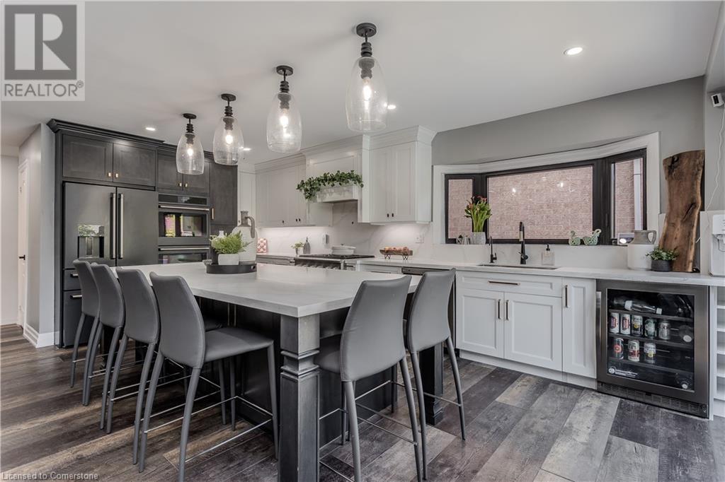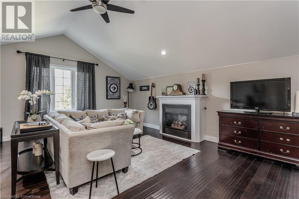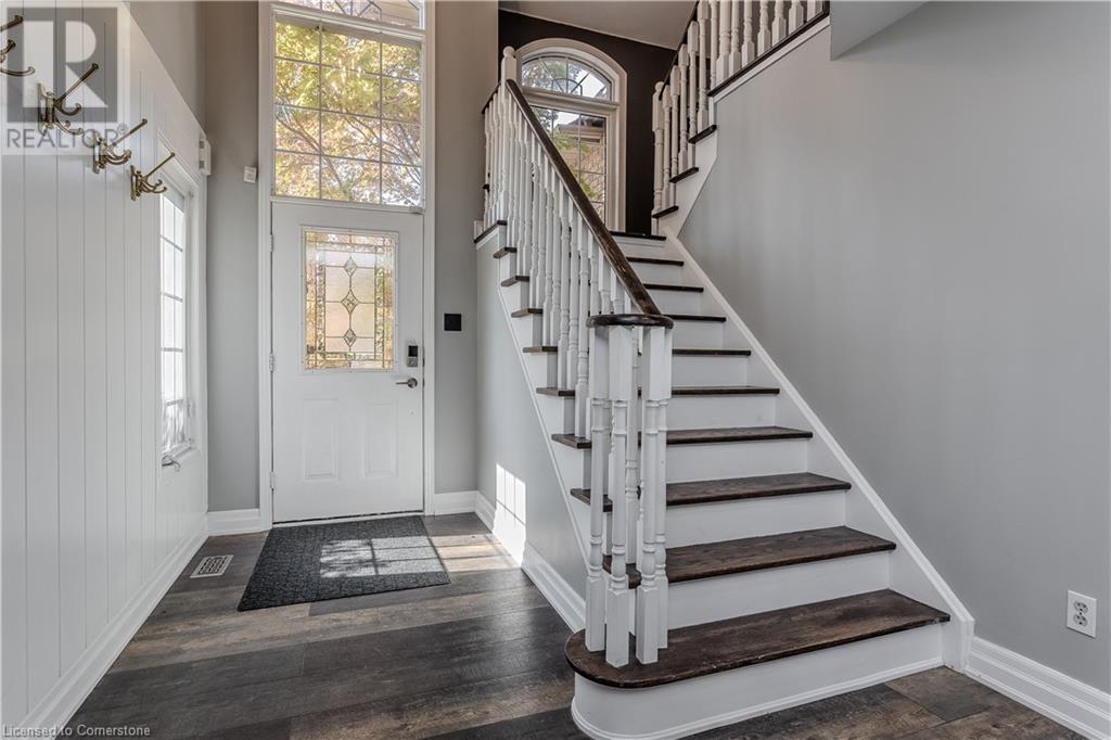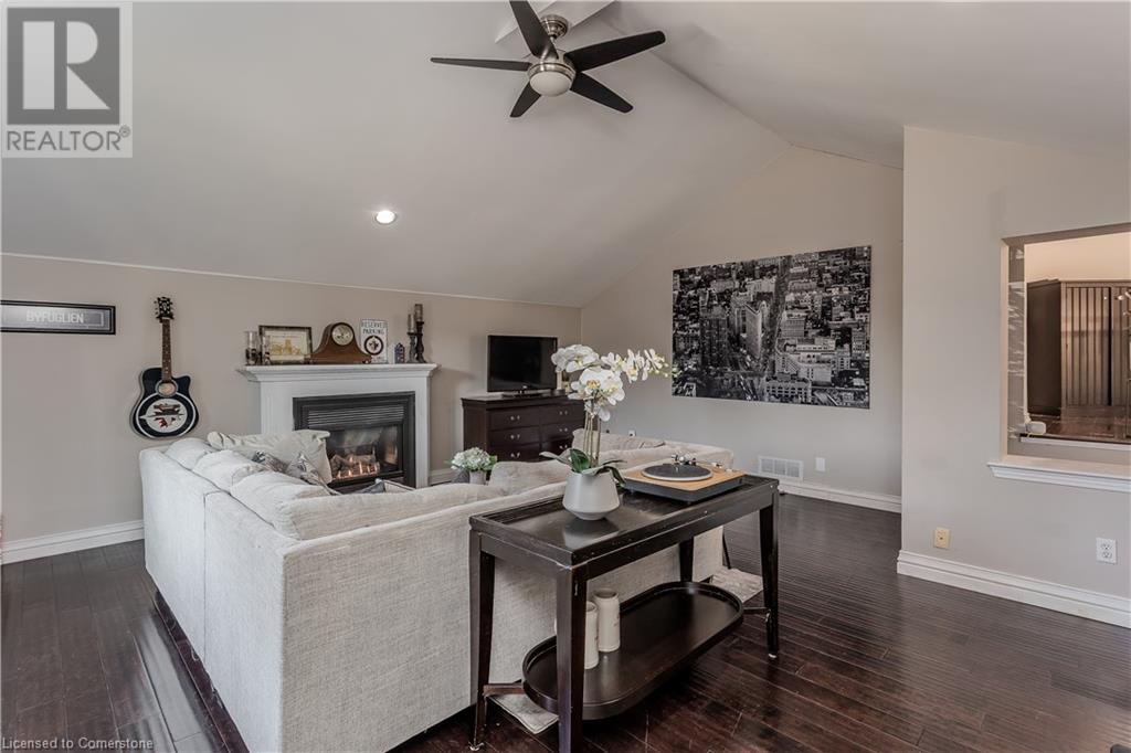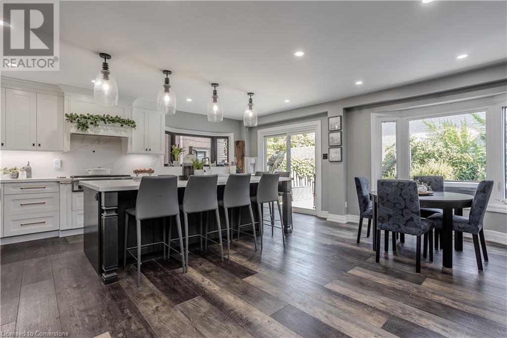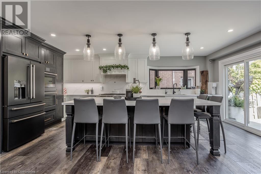Inviting 2-storey home in family-friendly Waterdown neighborhood, the professionally landscaped front yard greets you with perennial gardens, mature trees & concrete walkway leading to a garage with inside entry. Enter the soaring front foyer with vaulted ceilings, into the main floor, beautifully updated in 2021, feat an open-concept layout with pot lights & wide plank luxury vinyl flooring. The Living/dining room incl a 63” long contemporary gas FP and bay window. Open to the amazing eat in kitchen boasting custom cabinetry w soft-close drawers, waterfall quartz countertops and matching backsplash, a large island with a breakfast bar, coffee bar/buffet & GE Café appliances incl double ovens & beverage fridge. Enjoy easy access to the fully fenced, private rear yard incl an inground pool, hot tub, gazebo & gas BBQ hookup. Upstairs, the generous great room above the garage feat hardwood floors, fireplace & vaulted ceiling. The second level also incl engineered hardwood floors. The primary suite incl a 5PC ensuite, 3 additional bedrooms & 3PC main bathroom. The finished basement adds additional living space w rec/family room, additional bedroom & 3PC bathroom w shower. Conveniently located on a school bus route & within walking distance to scenic trails. Just mins from dining, major hwys & downtown Burlington. EXTRAS: water purifier & softener system, extended electrical outlets in the backyard & recent updates to the pool. Don’t miss the opportunity! (id:55009)